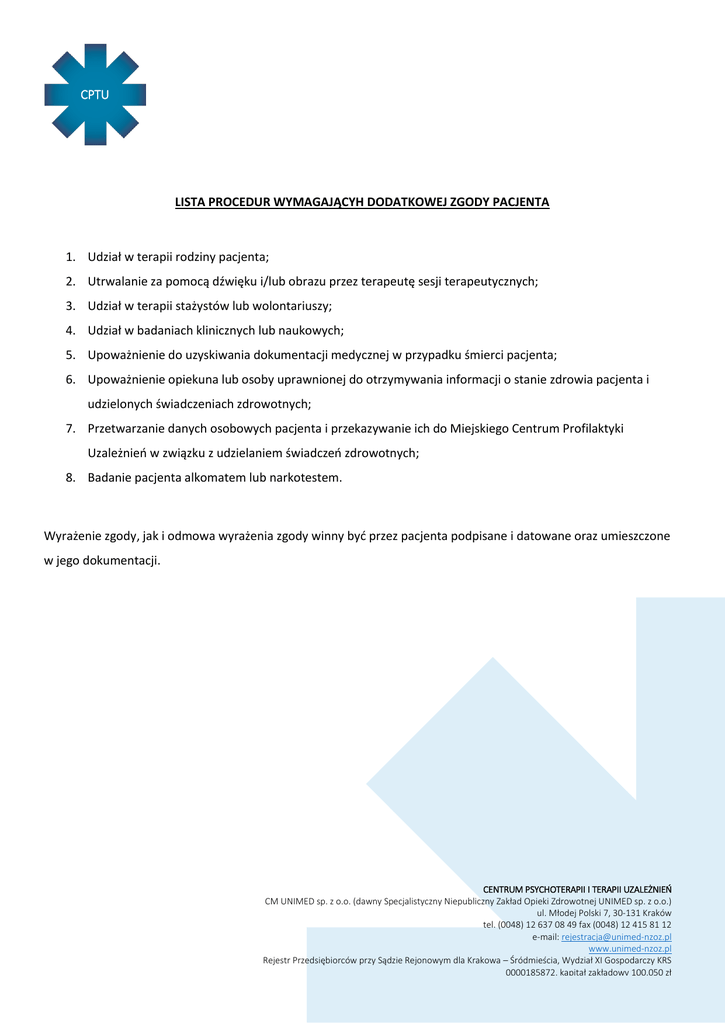 CPTU LISTA PROCEDUR WYMAGAJĄCYH DODATKOWEJ ZGODY PACJENTA 1. Udział w terapii rodziny pacjenta; 2. Utrwalanie za pomocą dźwięku i/lub obrazu przez terapeutę sesji terapeutycznych; 3. Udział w terapii stażystów lub wolontariuszy; 4. Udział w badaniach klinicznych lub naukowych; 5. Upoważnienie do uzyskiwania dokumentacji medycznej w przypadku śmierci pacjenta; 6. Upoważnienie opiekuna lub osoby uprawnionej do otrzymywania informacji o stanie zdrowia pacjenta i udzielonych świadczeniach zdrowotnych; 7. Przetwarzanie danych osobowych pacjenta i przekazywanie ich do Miejskiego Centrum Profilaktyki Uzależnień w związku z udzielaniem świadczeń zdrowotnych; 8. Badanie pacjenta alkomatem lub narkotestem. Wyrażenie zgody, jak i odmowa wyrażenia zgody winny być przez pacjenta podpisane i datowane oraz umieszczone w jego dokumentacji. CENTRUM PSYCHOTERAPII I TERAPII UZALEŻNIEŃ CM UNIMED sp. z o.o. (dawny Specjalistyczny Niepubliczny Zakład Opieki Zdrowotnej UNIMED sp. z o.o.) ul. Młodej Polski 7, 30-131 Kraków tel. (0048) 12 637 08 49 fax (0048) 12 415 81 12 e-mail: [email protected] www.unimed-nzoz.pl Rejestr Przedsiębiorców przy Sądzie Rejonowym dla Krakowa – Śródmieścia, Wydział XI Gospodarczy KRS 0000185872, kapitał zakładowy 100.050 zł