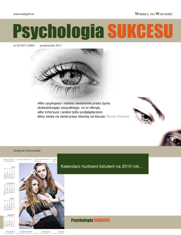 Wiedza to Wolność www.madgraf.eu Psychologia SUKCESU nr 02/2013 (006) październik 2013 Grażyna Dobromilska Kalendarz hurtowni biżuterii na 2010 rok... nr 2 (06)/2013 Psychologia SUKCESU 1 Spis treści CZEGO AUTORZY NIE WIEDZĄ O KONTAKTACH Z WYDAWCĄ Okładka ebooka i książki, czyli… jak rozmawiać z grafikiem, Grażyna Dobromilska 4 POTENCJAŁ WEWNĘTRZNY Czym jest moja Złota Klatka?, Katarzyna Klonowska 7 Informacje o badaniu Clifton StrengthsFinder™ 9 3 sekrety ludzi sukcesu, Darek Skraskowski 10 Teoria 5 talentów z bloga Jurka Kostowskiego 12 Zmiana drogą do sukcesu, Magdalena Nagrodzka 15 Cel, Piotr Waydel 18 Dlaczego ludzie tak rzadko osiągają sukces?, Piotr Waydel 18 Kreatywność i innowacje. Droga do sukcesu., Piotr Waydel 20 Narodziny Gwiazdy, Andrzej Hanisz 21 O dawaniu, Stefan Garczyński 23 MARKETING – COPYWRITING Jak Zdobyć Zaufanie w Internecie? czyli porady Wandy Loskot w Klubie Przedsiębiorcy 26 Ile jest marki w Twojej marce?, Paweł Tkaczyk 29 Największy grzech, jaki można popełnić w biznesie, Iwona Sorbian 30 Supernetworking – Moda czy konieczność w dobie kryzysu?, Joanna Wiejak 31 Jak skutecznie wykorzystać networking w sprzedaży i w promocji marki osobistej?, Joanna Wiejak 31 Krótki przepis na hipnotyczny tekst reklamowy, agencja reklamowa Ententa, Zbigniew Utnik 34 Start-up na start. Tad Witkowicz pomaga i radzi. Polska jest dobrym miejscem dla biznesu. 36 WARSZTAT – czyli „JAK” COŚ ROBIĆ Pomóż motywacji, czyli… o Dzienniku Pozytywnej Zmiany, Grażyna Dobromilska 39 FOTOGRAFIA – GRAFIKA – SZTUKA Kalendarze na 2010 rok... Grażyna Dobromilska43 INSPIRACJE – MOTYWACJE :-) 48 Marek Grechuta, Świecie nasz 48 Magazyn Psychologia Sukcesu redaktor naczelny – Grażyna Dobromilska www.madgraf.eu www.blog.madgraf.eu www.blog.psychologiasukcesu.com www.psychologiasukcesu.com [email protected] tel. 0 691 66 6341 ul. Szpitalna 5/18, 23-210 Kraśnik #6 październik 2013 wiedza to WOLNOŚĆ... Wiesz – nie błądzisz :-) Co najwyżej eksperymentujesz z rozwiązaniami... 2 Dziękuję wszystkim, którzy umożliwili mi wykorzystanie ich tekstów w magazynie. Zapraszam do współpracy. Zapraszam także do przesyłania komentarzy o treści pisma na adres [email protected] :-) Psychologia SUKCESU nr 2 (06)/2013 Witam Cię serdecznie w nowym numerze magazynu :-) Serdecznie dziękuję autorom za chęć nawiązania współpracy. Dzięki temu mogę zaskoczyć Czytelników ogromem wartościowej wiedzy i inspiracji do przemyśleń :-) Jednak zdecyduję się na kwartalnik, a nie – dwumiesięcznik. Nie mamy czasu czytać. Nawet jeśli jakaś wiedza jest cenna. Działy podporządkowane są mojej misji Psychologii Sukcesu :-) Oczywiście, dział DTP jest pomocniczy, ma służyć jako pomoc autorom w dogadaniu się z wydawcą w sprawie ich publikacji, niekoniecznie ze mną :-) Zapraszam Cię do lektury i do komentowania. A także do współtworzenia magazynu :-) Do zobaczenia następnym razem... nr 2 (06)/2013 Psychologia SUKCESU 3 CZEGO AUTORZY NIE WIEDZĄ O KONTAKTACH Z WYDAWCĄ Okładka ebooka i książki, czyli… jak rozmawiać z grafikiem Przygotowujesz ebooka, czyli pdf-a, kiedyś w perspektywie myślisz o wersji drukowanej, jeśli ebook będzie się dobrze sprzedawał… Grafik mówi do ciebie: podaj parametry okładki. Oto, co powinieneś wiedzieć. 1. Rozmiar Myśl o ebooku jak o książce, a nie jakimś “tworze elektronicznym” pdf „bez rozmiaru” do oglądania na ekranie monitora w powiększeniu „100%”, „zmieść stronę”, „zmieść na szerokość”. Wtedy koszty pracy grafika i osoby składającej publikację poniesiesz tylko raz. Na określonym formacie strony mieści się określona ilość słów. Nie da się w prosty sposób zrobić powiększenia „środka książki”, np. 110% i otrzymać sytuacji „ten sam skład” – „inny format”. 4 Na jaki więc format możesz się zdecydować? Np. ok. A5. Ze względu na techniczną stronę druku w drukarni nie można wykorzystać pełnego rozmiaru papieru formatu A, tu – A5, czyli 148 x 210 mm. Przyjmuje się rozmiar 145 x 205 mm. Ale książka formatu A5 ma raczej byle jaki wygląd. Taki broszurowy. No, chyba że ma ze 304 strony… Typowy format dla książki to ok. B5, czyli 168 x 240. Pełne B5 to 176 x 250 mm. Ciekawie prezentuje się książka w formacie publikacji Roberta Kiyosakiego Bogaty ojciec, Biedny ojciec, czyli 150 x 220 mm. Oczywiście, większy format oznacza wyższe koszty druku przy określonej ilości stron. Co prawda niewiele. Psychologia SUKCESU nr 2 (06)/2013 Z drugiej też strony, książkę formatu A5 czy B5 składa się tym samym stopniem pisma, więc będzie miała większy format, ale z mniejszą ilością stron. Pamiętaj jeszcze o tym, że ilość stron książki powinna być /8 (dzielone przez 8), co wynika ze specyfiki pracy drukarni. I tak ustalaj ilość stron ebooka. Dodaj np. reklamy swoich kursów, swoich poprzednich książek, oferty swoich partnerów. Przykład. Otrzymałeś np. 196 stron w składzie. Nie jest to „równa” składka drukarska, bo nie dzieli się przez 8. Powinieneś więc dążyć albo do ilości stron 192, albo 200. 2. Spady Kolejne wymaganie procesu druku to grafika zajmująca całą stronę przygotowana „na spad”. Spad, czyli margines 3 mm dookoła do obcięcia po wydrukowaniu strony. Dokładnie mówiąc: Okładka przód. Spady 3 mm z prawej, góra, dół. Okładka tył. Spad z lewej strony, góra, dół. Grzbietu do ebooka nie projektujesz. Przy okazji powiem, że grzbiet sąsiaduje z okładką przód i okładką tył, więc ma tylko spad góra i dół. W następnym numerze pokażę ci przykłady graficzne. Jak łatwo jest obciąć spad, żeby okładka ebooka miała odpowiedni wygląd, a jak niemożliwe jest jej przerobienie w odwrotną stronę, czyli dodanie do niej spadów 3 mm na potrzeby druku książki w drukarni. Popatrzmy na podstawową paletę w programie graficznym Corel. Widzisz ten gr