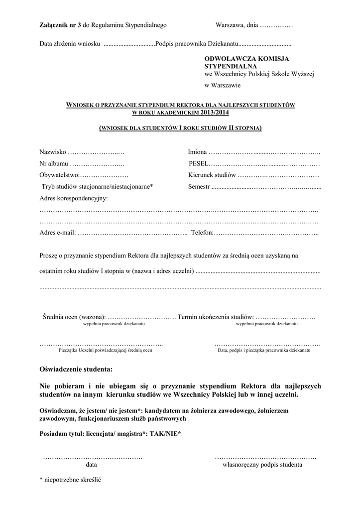 Załącznik nr 3 do Regulaminu Stypendialnego Warszawa, dnia …………… Data złożenia wniosku ...............................Podpis pracownika Dziekanatu................................ ODWOŁAWCZA KOMISJA STYPENDIALNA we Wszechnicy Polskiej Szkole Wyższej w Warszawie WNIOSEK O PRZYZNANIE STYPENDIUM REKTORA DLA NAJLEPSZYCH STUDENTÓW W ROKU AKADEMICKIM 2013/2014 (WNIOSEK DLA STUDENTÓW I ROKU STUDIÓW II STOPNIA) Nazwisko …………………..… Imiona ………………….........………………….. Nr albumu ………………….… PESEL…………………….…..........…………… Obywatelstwo:…………………. Kierunek studiów ………….…………………… Tryb studiów stacjonarne/niestacjonarne* Semestr ........................……………….…..…....... Adres korespondencyjny: …………………………………………………………………….……………………………………….. ………………………………………………………………………….……………………………….…. Adres e-mail: ………………………………………….. Telefon:…………………………….………….. Proszę o przyznanie stypendium Rektora dla najlepszych studentów za średnią ocen uzyskaną na ostatnim roku studiów I stopnia w (nazwa i adres uczelni) ........................................................................... ......................................................................................................................................................................... Średnia ocen (ważona): …………………………. Termin ukończenia studiów: ……………………… wypełnia pracownik dziekanatu ……………………………………………….. Pieczątka Uczelni poświadczającej średnią ocen wypełnia pracownik dziekanatu ………………………………………… Data, podpis i pieczątka pracownika dziekanatu Oświadczenie studenta: Nie pobieram i nie ubiegam się o przyznanie stypendium Rektora dla najlepszych studentów na innym kierunku studiów we Wszechnicy Polskiej lub w innej uczelni. Oświadczam, że jestem/ nie jestem*: kandydatem na żołnierza zawodowego, żołnierzem zawodowym, funkcjonariuszem służb państwowych Posiadam tytuł: licencjata/ magistra*: TAK/NIE* ……………………………………… data * niepotrzebne skreślić ………………………………………. własnoręczny podpis studenta wypełnia student I 1. 2. 3. 4 5 Rodzaj działalności i aktywności studenta Osiągnięcia artystyczne studenta lub inne 1. Udokumentowana indywidualna działalność artystyczna w dziedzinach: muzyka, plastyka, teatr, taniec, literatura, - potwierdzona nagrodami lub wyróżnieniami w prestiżowych konkursach organizowanych w w/wym. dziedzinach w kraju lub zagranicą. Członkostwo w zespołach artystycznych o wysokiej renomie. Książkowe publikacje utworów literackich. Udokumentowana działalność artystyczna, zespołowa w dziedzinach: muzyka, plastyka, teatr, taniec, literatura o zasięgu krajowym. Laureaci nagród w konkursach organizowanych w w/wym. dziedzinach. Indywidualne wystawy prac, występy taneczne i teatralne. Publikacja utworów literackich w czasopismach ogólnopolskich. Udokumentowana działalność artystyczna, zespołowa w dziedzinach: muzyka, plastyka, teatr, taniec, literatura o zasięgu regionalnym. Udział w konkursach organizowanych w w/wym. dziedzinach. Udziały w zbiorowych wystawach plastycznych, amatorskich zespołach tanecznych, teatralnych. Publikacje prac literackich w czasopismach lokalnych. Udział w zbiorowych wystawach plastycznych, amatorskich zespołach tanecznych, teatralnych. Publikacje prac literackich w Internecie. 3. 4 5 Nie Ilość przyznanych punktów Publikacja poza granicami Polski, z Listy Filadelfijskiej, z listy publikacji punktowanych MNiSW, referat wygłoszony na konferencji naukowej w języku obcym poza granicami kraju Recenzowana publikacja w języku obcym w wydawnictwie krajowym, referat wygłoszony w języku obcym na międzynarodowej konferencji naukowej o zasięgu krajowym Recenzowana publikacja w języku polskim w czasopiśmie o zasięgu ogólnopolskim, referat wygłoszony w języku polskim na konferencji naukowej o zasięgu krajowym Recenzowana publikacja w wydawnictwie regionalnym, recenzowany referat na konferencji Studenckiego Koła Naukowego o zasięgu międzyuczelnianym, kursy nieobjęte programem Udział w organizacji kongresu, konferencji, sympozjum naukowego, wystawy artystycznej, wernisażu; współredakcja czasopism naukowych na danym kierunku studiów, działalność w samorządzie studentów, organy kolegialne, staże, certyfikaty, studia równoległe na drugim kierunku II 2. Tak1 wypełnia Komisja Udział w warsztatach i plenerach plastycznych, warsztatach literackich, muzycznych, teatralnych lub tanecznych na poziomie amatorskim. Suma punktów (wypełnia Komisja) Osiągnięcia sportowe2 L.p Ranga zawodów/punkty miejsce 1 2 3 4 5 udział Igrzyska Olimpijskie lub Paraolimpijskie 12 11 10 9 8 4 Mistrzostwa Świata 10 9 8 7 6 4 Mistrzostwa Europy 8 7 6 5 4 3 Uniwersjada 7 6 5 4 3 2 Akademickie Mistrzostwa Świata 6 5 4 3 1 1 Akademickie Mistrzostwa Europy 5 4 3 2 1 1 Mistrzostwa Polski 4 3 2 Akademickie Mistrzostwa Polski 4 3 2 Mistrzostwa Polski Uniwersytetów 3 2 1 Mistrzostwa Polski AZS 3 2 1 Czynny udział w rozgrywkach ekstraklasy 3 Czynny udział w grach zespołowych I i II ligii 2 Przyznano ……………..pkt za osiągnięcia sportowe 1 2 Osiągniecie naukowe powinno być potwierdzone stosownym dokumentem, który należy dołączyć do wniosku Osiągniecie sportowe powinno być potwierdzone stosownym dokumentem, który należy dołączyć do wniosku Decyzja Odwoławczej Komisji Stypendialnej: Przyznano/Nie przyznano stypendium kategorii I, II, III na rok akademicki/semestr zimowy/letni w wysokości .............................