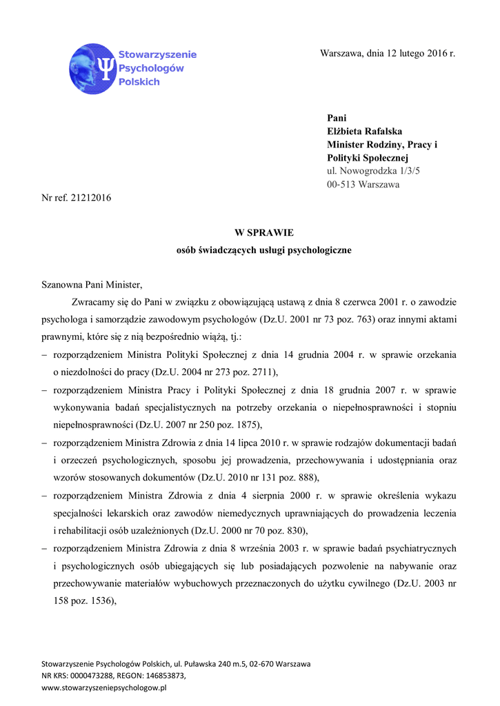 Warszawa, dnia 12 lutego 2016 r. Pani Elżbieta Rafalska Minister Rodziny, Pracy i Polityki Społecznej ul. Nowogrodzka 1/3/5 00-513 Warszawa Nr ref. 21212016 W SPRAWIE osób świadczących usługi psychologiczne Szanowna Pani Minister, Zwracamy się do Pani w związku z obowiązującą ustawą z dnia 8 czerwca 2001 r. o zawodzie psychologa i samorządzie zawodowym psychologów (Dz.U. 2001 nr 73 poz. 763) oraz innymi aktami prawnymi, które się z nią bezpośrednio wiążą, tj.: rozporządzeniem Ministra Polityki Społecznej z dnia 14 grudnia 2004 r. w sprawie orzekania o niezdolności do pracy (Dz.U. 2004 nr 273 poz. 2711), rozporządzeniem Ministra Pracy i Polityki Społecznej z dnia 18 grudnia 2007 r. w sprawie wykonywania badań specjalistycznych na potrzeby orzekania o niepełnosprawności i stopniu niepełnosprawności (Dz.U. 2007 nr 250 poz. 1875), rozporządzeniem Ministra Zdrowia z dnia 14 lipca 2010 r. w sprawie rodzajów dokumentacji badań i orzeczeń psychologicznych, sposobu jej prowadzenia, przechowywania i udostępniania oraz wzorów stosowanych dokumentów (Dz.U. 2010 nr 131 poz. 888), rozporządzeniem Ministra Zdrowia z dnia 4 sierpnia 2000 r. w sprawie określenia wykazu specjalności lekarskich oraz zawodów niemedycznych uprawniających do prowadzenia leczenia i rehabilitacji osób uzależnionych (Dz.U. 2000 nr 70 poz. 830), rozporządzeniem Ministra Zdrowia z dnia 8 września 2003 r. w sprawie badań psychiatrycznych i psychologicznych osób ubiegających się lub posiadających pozwolenie na nabywanie oraz przechowywanie materiałów wybuchowych przeznaczonych do użytku cywilnego (Dz.U. 2003 nr 158 poz. 1536), Stowarzyszenie Psychologów Polskich, ul. Puławska 240 m.5, 02-670 Warszawa NR KRS: 0000473288, REGON: 146853873, www.stowarzyszeniepsychologow.pl rozporządzeniem Ministra Zdrowia z dnia 22 sierpnia 2002 r. w sprawie badań psychiatrycznych i psychologicznych osób ubiegających się lub posiadających prawo do wykonywania lub kierowania działalnością gospodarczą albo bezpośrednio zatrudnionych przy wytwarzaniu i obrocie materiałami wybuchowymi, bronią, amunicją oraz wyrobami o przeznaczeniu wojskowym lub policyjnym (Dz.U. 2002 nr 150 poz. 1246), rozporządzeniem Ministra Zdrowia z dnia 29 września 2011 r. w sprawie badań psychiatrycznych i psychologicznych osób wykonujących czynności mające istotne znaczenie dla zapewnienia bezpieczeństwa jądrowego i ochrony radiologicznej w jednostce organizacyjnej wykonującej działalność związaną z narażeniem, polegającą na rozruchu, eksploatacji lub likwidacji elektrowni jądrowej (Dz.U. 2011 nr 220 poz. 1310), rozporządzeniem Ministra Zdrowia z dnia 14 lipca 2010 r. w sprawie rodzajów dokumentacji badań i orzeczeń psychologicznych, sposobu jej prowadzenia, przechowywania i udostępniania oraz wzorów stosowanych dokumentów (Dz.U. 2010 nr 131 poz. 888). rozporządzeniem Ministra Sprawiedliwości z dnia 14 marca 2000 r. w sprawie zasad organizacji i warunków przeprowadzania badań psychologicznych i psychiatrycznych w ośrodkach diagnostycznych (Dz.U. 2000 nr 29 poz. 369), rozporządzeniem Ministra Sprawiedliwości z dnia 19 września 2014 r. w sprawie badań lekarskich i psychologicznych kandydatów do objęcia urzędu sędziego (Dz.U. 2014 poz. 1293), obwieszczeniem Ministra Sprawiedliwości z dnia 10 kwietnia 2013 r. w sprawie ogłoszenia jednolitego tekstu rozporządzenia Ministra Sprawiedliwości w sprawie sposobów prowadzenia oddziaływań penitencjarnych w zakładach karnych i aresztach śledczych (Dz.U. 2013 poz. 1067), rozporządzeniem Ministra Obrony Narodowej z dnia 4 lutego 2015 r. w sprawie badań psychologicznych osób zgłaszających chęć pełnienia zawodowej służby wojskowej (Dz.U. 2015 poz. 245), rozporządzeniem Ministra Edukacji Narodowej z dnia 18 września 2008 r. w sprawie orzeczeń i opinii wydawanych przez zespoły orzekające działające w publicznych poradniach psychologiczno-pedagogicznych (Dz.U. 2008 nr 173 poz. 1072), rozporządzeniem Ministra Edukacji Narodowej z dnia 30 kwietnia 2013 r. w sprawie zasad udzielania i organizacji pomocy psychologiczno-pedagogicznej w publicznych przedszkolach, szkołach i placówkach (Dz.U. 2013 poz. 532), rozporządzeniem Ministra Edukacji Narodowej z dnia 1 lutego 2013 r. w sprawie szczegółowych zasad działania publicznych poradni psychologiczno-pedagogicznych, w tym publicznych poradni specjalistycznych (Dz.U. 2013 poz. 199), Stowarzyszenie Psychologów Polskich, ul. Puławska 240 m.5, 02-670 Warszawa NR KRS: 0000473288, REGON: 146853873, www.stowarzyszeniepsychologow.pl strona 2 obwieszczeniem Marszałka Sejmu Rzeczypospolitej Polskiej z dnia 15 września 2011 r. w sprawie ogłoszenia jednolitego tekstu ustawy o ochronie zdrowia psychicznego (Dz.U. 2011 nr 231 poz. 1375), rozporządzeniem Ministra Spraw Wewnętrznych z dnia 30 marca 2012 r. w sprawie pomocy psychologicznej udzielanej weteranowi - funkcjonariuszowi, weteranowi poszkodowanemu funkcjonariuszowi oraz najbliższym członkom jego rodziny (Dz.U. 2012 poz. 375), oraz zarządzeniem nr 53 Komendanta Głównego Policji z dnia 6 października 2014r. w sprawie metod i form wykonywania niektórych zadań służbowych przez psychologów pełniących służbę lub zatrudnionych w jednostkach organizacyjnych Policji (DZ. URZ. 2014.118). Należy zwrócić również uwagę na fakt, że obowiązują późniejsze akty prawne, które powołują się na nieistniejące organy o których mowa w ustawie o zawodzie psychologa, tj.: obwieszczenie Marszałka Sejmu Rzeczypospolitej Polskiej z dnia 14 lipca 2014 r. w sprawie ogłoszenia jednolitego tekstu ustawy o służbie medycyny pracy (Dz.U. 2014 poz. 1184), obwieszczenie Marszałka Sejmu Rzeczypospolitej Polskiej z dnia 16 stycznia 2015 r. w sprawie ogłoszenia jednolitego tekstu ustawy o kierujących pojazdami (Dz.U. 2015 poz. 155), decyzja nr 387 Komendanta Głównego Policji z dnia 6 października 2014r. w sprawie prowa