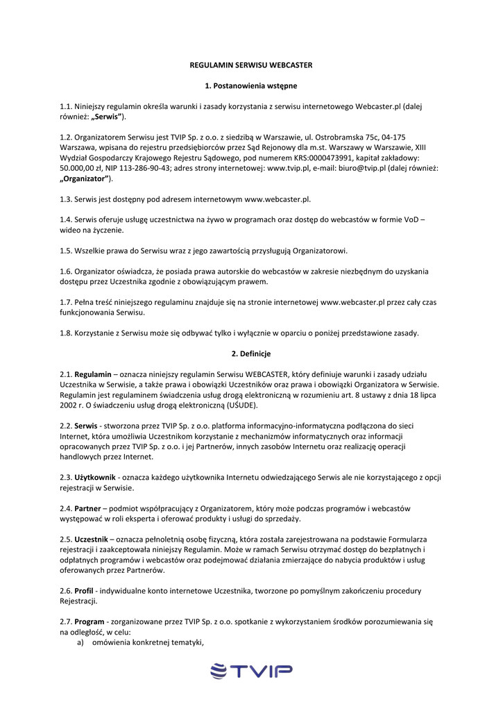 REGULAMIN SERWISU WEBCASTER 1. Postanowienia wstępne 1.1. Niniejszy regulamin określa warunki i zasady korzystania z serwisu internetowego Webcaster.pl (dalej również: „Serwis”). 1.2. Organizatorem Serwisu jest TVIP Sp. z o.o. z siedzibą w Warszawie, ul. Ostrobramska 75c, 04-175 Warszawa, wpisana do rejestru przedsiębiorców przez Sąd Rejonowy dla m.st. Warszawy w Warszawie, XIII Wydział Gospodarczy Krajowego Rejestru Sądowego, pod numerem KRS:0000473991, kapitał zakładowy: 50.000,00 zł, NIP 113-286-90-43; adres strony internetowej: www.tvip.pl, e-mail: [email protected] (dalej również: „Organizator”). 1.3. Serwis jest dostępny pod adresem internetowym www.webcaster.pl. 1.4. Serwis oferuje usługę uczestnictwa na żywo w programach oraz dostęp do webcastów w formie VoD – wideo na życzenie. 1.5. Wszelkie prawa do Serwisu wraz z jego zawartością przysługują Organizatorowi. 1.6. Organizator oświadcza, że posiada prawa autorskie do webcastów w zakresie niezbędnym do uzyskania dostępu przez Uczestnika zgodnie z obowiązującym prawem. 1.7. Pełna treść niniejszego regulaminu znajduje się na stronie internetowej www.webcaster.pl przez cały czas funkcjonowania Serwisu. 1.8. Korzystanie z Serwisu może się odbywać tylko i wyłącznie w oparciu o poniżej przedstawione zasady. 2. Definicje 2.1. Regulamin – oznacza niniejszy regulamin Serwisu WEBCASTER, który definiuje warunki i zasady udziału Uczestnika w Serwisie, a także prawa i obowiązki Uczestników oraz prawa i obowiązki Organizatora w Serwisie. Regulamin jest regulaminem świadczenia usług drogą elektroniczną w rozumieniu art. 8 ustawy z dnia 18 lipca 2002 r. O świadczeniu usług drogą elektroniczną (UŚUDE). 2.2. Serwis - stworzona przez TVIP Sp. z o.o. platforma informacyjno-informatyczna podłączona do sieci Internet, która umożliwia Uczestnikom korzystanie z mechanizmów informatycznych oraz informacji opracowanych przez TVIP Sp. z o.o. i jej Partnerów, innych zasobów Internetu oraz realizację operacji handlowych przez Internet. 2.3. Użytkownik - oznacza każdego użytkownika Internetu odwiedzającego Serwis ale nie korzystającego z opcji rejestracji w Serwisie. 2.4. Partner – podmiot współpracujący z Organizatorem, który może podczas programów i webcastów występować w roli eksperta i oferować produkty i usługi do sprzedaży. 2.5. Uczestnik – oznacza pełnoletnią osobę fizyczną, która została zarejestrowana na podstawie Formularza rejestracji i zaakceptowała niniejszy Regulamin. Może w ramach Serwisu otrzymać dostęp do bezpłatnych i odpłatnych programów i webcastów oraz podejmować działania zmierzające do nabycia produktów i usług oferowanych przez Partnerów. 2.6. Profil - indywidualne konto internetowe Uczestnika, tworzone po pomyślnym zakończeniu procedury Rejestracji. 2.7. Program - zorganizowane przez TVIP Sp. z o.o. spotkanie z wykorzystaniem środków porozumiewania się na odległość, w celu: a) omówienia konkretnej tematyki, b) doskonalenia umiejętności i kwalifikacji zawodowych lub pozazawodowych, c) prezentacji i sprzedaży produktów i usług , w którym może wziąć udział każda osoba spełniająca określone warunki uczestnictwa. 2.8. Webcast – materiał audiowizualny udostępniony w formie VoD (wideo na życzenie). 2.9. Formularz rejestracyjny – wniosek złożony według formatu ustalonego przez Organizatora, dostępny w ramach Serwisu, który po prawidłowym wypełnieniu przez Użytkownika stanowi wniosek o przyjęcie Użytkownika do Serwisu. 2.10. Zgłoszenie - działania podjęte przez Uczestnika, mające na celu zarejestrowanie Uczestnika na wydarzenie. 2.11. Potwierdzenie udziału - e-mail wysyłany przez Organizatora w odpowiedzi na zgłoszenie. 2.12. Zamówienie - zgłoszone przez Uczestnika żądanie odpłatnego udostępnienia programu lub webcastu, oraz zakupu oferowanych przez Partnera produktów i usług. 2.13. Dostęp do programu i webcastu – nabycie licencji czasowej na oglądanie programu lub webcastu, po wniesieniu opłaty w formie online, lub na zasadach dostępu nieodpłatnego w przypadkach określonych przez Organizatora. 2.14. Cena sprzedaży (brutto)- opłata uiszczana za dostęp do programu i webcastu, wyrażona w złotych polskich, powiększona o podatek od towarów i usług. 2.15. Licencja - spersonalizowany dostęp do programu i webcastu, nadany przez system Organizatora – bezpłatnie lub po uiszczeniu opłaty w formie online, dzięki któremu Uczestnik otrzymuje dostęp do programu i webcastu oferowanego w Serwisie. 2.16. Kupon – kod rabatowy uprawniający Uczestnika do zakupu produktów i usług ze zniżką. 2.17. Operator płatności – „Przelewy24” spółka zarejestrowana pod nazwą PayPro SA, z siedzibą przy ul. Kanclerskiej 15, 60-327 Poznań NIP: 779-236-98-87 , Regon: 301345068, zarejestrowana w Sądzie Rejonowym Poznań - Nowe Miasto i Wilda w Poznaniu, VIII Wydz. Gospodarczy Krajowego Rejestru Sądowego Nr KRS 0000347935, wysokość kapitału zakładowego: 4 500 000 zł oraz DialCom24 Sp. z o.o. z siedzibą przy ul. Kanclerskiej 15, 60-327 Poznań NIP 781-173-38-52, REGON 634509164, zarejestrowana w Sądzie Rejonowym Poznań, VIII Wydz. Gospodarczy Krajowego Rejestru Sądowego Nr KRS 0000306513, wysokość kapitału zakładowego: 1 697 000 zł 2.18. Umowa - umowa o świadczenie usług drogą elektroniczną zawarta między Użytkownikiem a Organizatorem z chwilą akceptacji Regulaminu przez Użytkownika, o treści odpowiadającej treści Regulaminu. 2.19. Zdarzenia losowe- zdarzenie przyszłe, możliwe, ale niepewne: powódź, pożar w budynku, w którym ma się odbyć wydarzenie, konflikt zbrojny, awaria w budynku, w którym ma się odbyć wydarzenie, taka jak: awaria instalacji elektrycznej, wodnokanalizacyjna, gazowa, grzewcza, sieci Internet, klimatyzacyjna, pożarowa lub inna, której wystąpienie zagraża życiu lub zdrowiu osób przebywających w takim budynku,