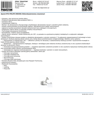 PPHU "PRAISTON" Mariusz Prais ul. Górowska 32 64-100 Leszno Polska Biuro: +48.65 527-01-67 Serwis:+48.782-844-000 Fax: +48.65 527-01-67 Mariusz Prais: +48.693-37-27-47 Łukasz Prais: +48.665-345-001 Zenon Prais: +48.609-788-830 E-mail: [email protected] Aparat RTG PHILIPS ENDURA (Rekondycjonowany (używany)) • Używany, stan techniczny bardzo dobry, • Produkcji holenderskiej (data produkcji 2003 r.), • Zasilanie 230 V, • Częstotliwość 50/60 Hz, • Ramię C do obrazowania chirurgicznego umożliwiające obrazowanie naczyń z szerokim polem widzenia, • System wykorzystywany do fluoroskopii ogólnej i specjalistycznych badań naczyniowych, • zapewnia wysoką wyrazistość obrazów dynamicznych przy zabiegach chirurgicznych, • Zwiększony zakres obrotu na potrzeby projekcji naczyniowych, • Technologia obrazowania SmartVision, • Kompaktowa, mobilna stacja przeglądania, • Zakres obrotu ramienia C został rozszerzony do 1350, co pozwala na uzyskiwanie projekcji niezbędnych w większości zabiegów naczyniowych, • System SmartVision stanowi przełom w dziedzinie obrazowania z użyciem ramienia C. To połączenie zaawansowanych technologii w torze obrazowym skutkuje poprawą jakości obrazu przy niskiej dawce promieniowania rentgenowskiego. Niektóre cechy systemu: ⚬ Obrazowanie w rozdzielczości 1K2 — całkowicie cyfrowy tor obrazowy z zaawansowaną redukcją szumów i wyostrzeniem krawędzi w trybie 2D dla poprawy jakości obrazu, ⚬ BodySmart — oprogramowanie znajdujące, śledzące i określające pole widzenia struktury anatomicznej w celu uzyskania doskonałych obrazów za pierwszym razem, ⚬ Automatyczne pozycjonowanie przesłon — umożliwia optymalne ustawienie przesłon w celu uzyskania najwyższej możliwej jakości obrazu oraz wyraźnego widoku obszaru zainteresowania (ROI) ⚬ Automatyczna regulacja kontrastu/jasności — regulacja kontrastu i jasności w czasie rzeczywistym, • System BV Endura obsługuje szeroką gamę zastosowań, takich jak: ⚬ Chirurgia naczyniowa, ⚬ Chirurgia ortopedyczna, ⚬ Chirurgia jamy brzusznej, ⚬ Neurochirurgia, ⚬ Chirurgia klatki piersiowej, • Posiada aktualne testy akceptacyjne oraz Paszport Techniczny, • Gwarancja 6-miesięcy, • Możliwość finansowania: ⚬ Raty, ⚬ Leasing, ⚬ Pożyczka. www.praiston.pl 06-09-2013, 9:47:13