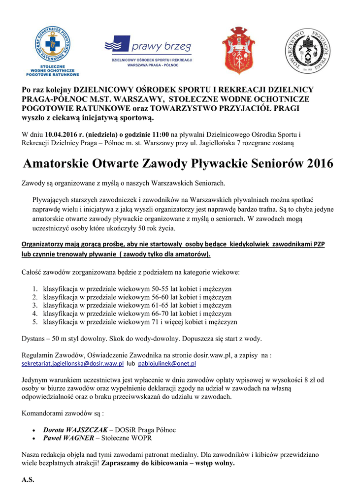 Po raz kolejny DZIELNICOWY OŚRODEK SPORTU I REKREACJI DZIELNICY PRAGA-PÓŁNOC M.ST. WARSZAWY, STOŁECZNE WODNE OCHOTNICZE POGOTOWIE RATUNKOWE oraz TOWARZYSTWO PRZYJACIÓŁ PRAGI wyszło z ciekawą inicjatywą sportową. W dniu 10.04.2016 r. (niedziela) o godzinie 11:00 na pływalni Dzielnicowego Ośrodka Sportu i Rekreacji Dzielnicy Praga – Północ m. st. Warszawy przy ul. Jagiellońska 7 rozegrane zostaną Amatorskie Otwarte Zawody Pływackie Seniorów 2016 Zawody są organizowane z myślą o naszych Warszawskich Seniorach. Pływających starszych zawodniczek i zawodników na Warszawskich pływalniach można spotkać naprawdę wielu i inicjatywa z jaką wyszli organizatorzy jest naprawdę bardzo trafna. Są to chyba jedyne amatorskie otwarte zawody pływackie organizowane z myślą o seniorach. W zawodach mogą uczestniczyć osoby które ukończyły 50 rok życia. Organizatorzy mają gorącą prośbę, aby nie startowały osoby będące kiedykolwiek zawodnikami PZP lub czynnie trenowały pływanie ( zawody tylko dla amatorów). Całość zawodów zorganizowana będzie z podziałem na kategorie wiekowe: 1. 2. 3. 4. 5. klasyfikacja w przedziale wiekowym 50-55 lat kobiet i mężczyzn klasyfikacja w przedziale wiekowym 56-60 lat kobiet i mężczyzn klasyfikacja w przedziale wiekowym 61-65 lat kobiet i mężczyzn klasyfikacja w przedziale wiekowym 66-70 lat kobiet i mężczyzn klasyfikacja w przedziale wiekowym 71 i więcej kobiet i mężczyzn Dystans – 50 m styl dowolny. Skok do wody-dowolny. Dopuszcza się start z wody. Regulamin Zawodów, Oświadczenie Zawodnika na stronie dosir.waw.pl, a zapisy na : [email protected] lub [email protected] Jedynym warunkiem uczestnictwa jest wpłacenie w dniu zawodów opłaty wpisowej w wysokości 8 zł od osoby w biurze zawodów oraz wypełnienie deklaracji zgody na udział w zawodach na własną odpowiedzialność oraz o braku przeciwwskazań do udziału w zawodach. Komandorami zawodów są : Dorota WAJSZCZAK – DOSiR Praga Północ Paweł WAGNER – Stołeczne WOPR Nasza redakcja objęła nad tymi zawodami patronat medialny. Dla zawodników i kibiców przewidziano wiele bezpłatnych atrakcji! Zapraszamy do kibicowania – wstęp wolny. A.S.