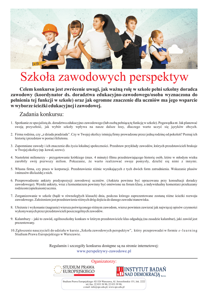 Szko³a zawodowych perspektyw Celem konkursu jest zwrócenie uwagi, jak wa¿n¹ rolê w szkole pe³ni szkolny doradca zawodowy (koordynator ds. doradztwa edukacyjno-zawodowego/osoba wyznaczona do pe³nienia tej funkcji w szkole) oraz jak ogromne znaczenie dla uczniów ma jego wsparcie w wyborze œcie¿ki edukacyjnej i zawodowej. Zadania konkursu: 1. Spotkanie ze specjalist¹ ds. doradztwa edukacyjno-zawodowego (lub osob¹ pe³ni¹c¹ tê funkcjê w szkole). Pogawêdka nt. Jak planowaæ swoj¹ przysz³oœæ, jak wybór szko³y wp³ywa na nasze dalsze losy, dlaczego warto uczyæ siê jêzyków obcych. 2. Firma rodzina, czy „z dziada pradziada”. Czy w Twojej okolicy istniej¹ firmy prowadzone przez jedn¹ rodzinê od pokoleñ? Poznaj ich historiê i przedstaw w postaci felietonu. 3. Zapomniane zawody i ich znaczenie dla ¿ycia lokalnej spo³ecznoœci. Przedstaw przyk³ady zawodów, których przedstawicieli brakuje w Twojej okolicy (np. kowal, szewc). 4. Nastoletni milionerzy – przygotowanie krótkiego (max. 4 minuty) filmu przedstawiaj¹cego historiê osób, które w m³odym wieku zarobi³y swój pierwszy milion. Pokazanie, ¿e warto realizowaæ swoje pomys³y, dzieliæ siê nimi z innymi. 5. W³asna firma, czy praca w korporacji. Przedstawienie ró¿nic wynikaj¹cych z tych dwóch form zatrudnienia. Wskazanie plusów i minusów dla ka¿dej z nich. 6. Przeprowadzenie ankiety predyspozycji zawodowej uczniów. (Ankieta powinna byæ opracowana przy konsultacji doradcy zawodowego). Wyniki ankiety, wraz z komentarzem powinny byæ omówione na forum klasy, a indywidualny komentarz przekazany rodzicom (opiekunom) ucznia. 7. Zorganizowanie w szkole (b¹dŸ w równoleg³ych klasach) dnia, podczas którego zaprezentowane zostan¹ ró¿ne œcie¿ki rozwoju zawodowego. Za³o¿eniem jest przedstawienie ró¿nych dróg dojœcia do danego zawodu/stanowiska. 8. U³o¿enie i wykonanie (nagranie) wiersza poœwiêconego ró¿nym zawodom, wiersz powinien zawieraæ jak najwiêcej opisów czynnoœci wykonywanych przez przedstawicieli poszczególnych zawodów. 9. Kalambury – jaki to zawód, ogólnoszkolny konkurs w którym przedstawiciele klas odgaduj¹ (na zasadzie kalambur), jaki zawód jest prezentowany. 10.Zg³oszenie nauczycieli do udzia³u w kursie „Szko³a zawodowych perspektyw”, który przeprowadzi w formie e - l e a r n i n g Studium Prawa Europejskiego w Warszawie. Regulamin i szczegó³y konkursu dostêpne s¹ na stronie internetowej: www.perspektywy-zawodowe.pl Oganizatorzy: IB INSTYTUT BADAÑ n D NAD DEMOKRACJ¥ Studium Prawa Europejskiego: 02-326 Warszawa, Al. Jerozolimskie 151, lok. 2222 tel./fax: 22 833 38 90; 22 833 39 90; e-mail: [email protected]; www.spe.edu.pl Sp. z o.o.