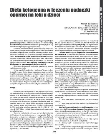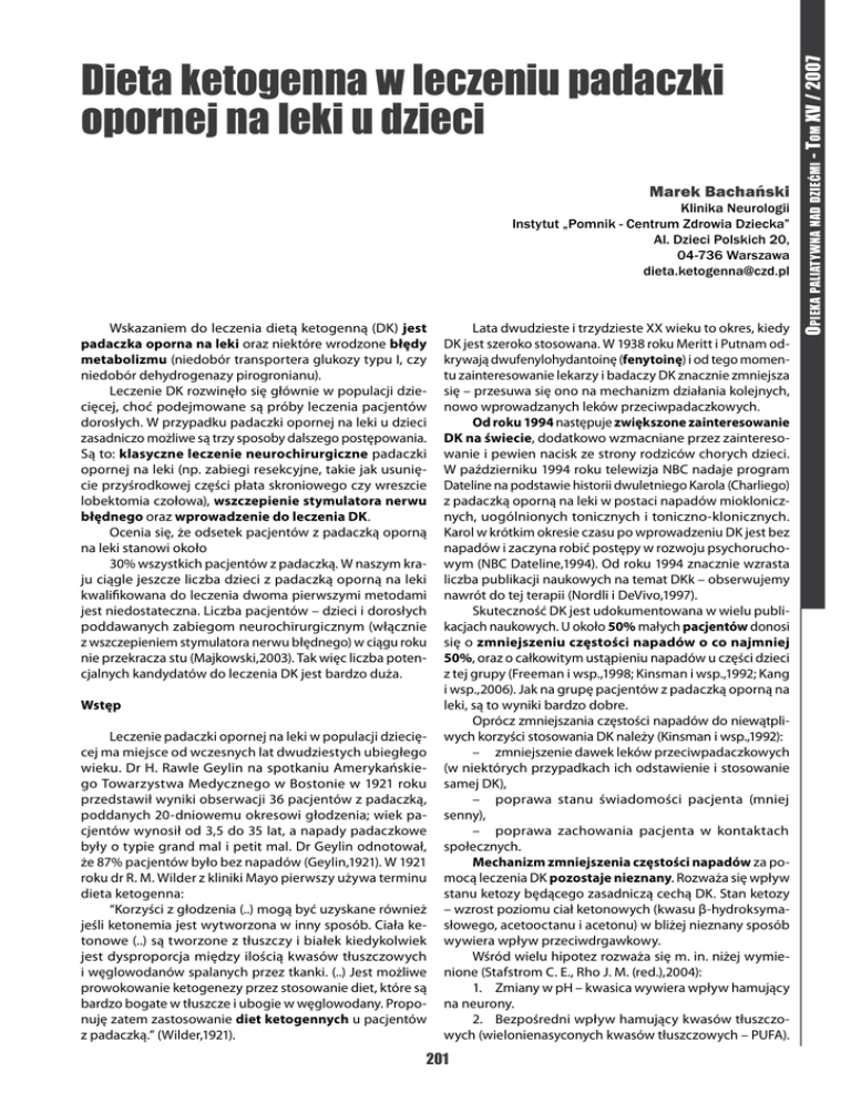 Marek Bachański Klinika Neurologii Instytut „Pomnik - Centrum Zdrowia Dziecka” Al. Dzieci Polskich 20, 04-736 Warszawa [email protected] Wskazaniem do leczenia dietą ketogenną (DK) jest padaczka oporna na leki oraz niektóre wrodzone błędy metabolizmu (niedobór transportera glukozy typu I, czy niedobór dehydrogenazy pirogronianu). Leczenie DK rozwinęło się głównie w populacji dziecięcej, choć podejmowane są próby leczenia pacjentów dorosłych. W przypadku padaczki opornej na leki u dzieci zasadniczo możliwe są trzy sposoby dalszego postępowania. Są to: klasyczne leczenie neurochirurgiczne padaczki opornej na leki (np. zabiegi resekcyjne, takie jak usunięcie przyśrodkowej części płata skroniowego czy wreszcie lobektomia czołowa), wszczepienie stymulatora nerwu błędnego oraz wprowadzenie do leczenia DK. Ocenia się, że odsetek pacjentów z padaczką oporną na leki stanowi około 30% wszystkich pacjentów z padaczką. W naszym kraju ciągle jeszcze liczba dzieci z padaczką oporną na leki kwalifikowana do leczenia dwoma pierwszymi metodami jest niedostateczna. Liczba pacjentów – dzieci i dorosłych poddawanych zabiegom neurochirurgicznym (włącznie z wszczepieniem stymulatora nerwu błędnego) w ciągu roku nie przekracza stu (Majkowski,2003). Tak więc liczba potencjalnych kandydatów do leczenia DK jest bardzo duża. Wstęp Leczenie padaczki opornej na leki w populacji dziecięcej ma miejsce od wczesnych lat dwudziestych ubiegłego wieku. Dr H. Rawle Geylin na spotkaniu Amerykańskiego Towarzystwa Medycznego w Bostonie w 1921 roku przedstawił wyniki obserwacji 36 pacjentów z padaczką, poddanych 20-dniowemu okresowi głodzenia; wiek pacjentów wynosił od 3,5 do 35 lat, a napady padaczkowe były o typie grand mal i petit mal. Dr Geylin odnotował, że 87% pacjentów było bez napadów (Geylin,1921). W 1921 roku dr R. M. Wilder z kliniki Mayo pierwszy używa terminu dieta ketogenna: “Korzyści z głodzenia (..) mogą być uzyskane również jeśli ketonemia jest wytworzona w inny sposób. Ciała ketonowe (..) są tworzone z tłuszczy i białek kiedykolwiek jest dysproporcja między ilością kwasów tłuszczowych i węglowodanów spalanych przez tkanki. (..) Jest możliwe prowokowanie ketogenezy przez stosowanie diet, które są bardzo bogate w tłuszcze i ubogie w węglowodany. Proponuję zatem zastosowanie diet ketogennych u pacjentów z padaczką.” (Wilder,1921). Lata dwudzieste i trzydzieste XX wieku to okres, kiedy DK jest szeroko stosowana. W 1938 roku Meritt i Putnam odkrywają dwufenylohydantoinę (fenytoinę) i od tego momentu zainteresowanie lekarzy i badaczy DK znacznie zmniejsza się – przesuwa się ono na mechanizm działania kolejnych, nowo wprowadzanych leków przeciwpadaczkowych. Od roku 1994 następuje zwiększone zainteresowanie DK na świecie, dodatkowo wzmacniane przez zainteresowanie i pewien nacisk ze strony rodziców chorych dzieci. W październiku 1994 roku telewizja NBC nadaje program Dateline na podstawie historii dwuletniego Karola (Charliego) z padaczką oporną na leki w postaci napadów mioklonicznych, uogólnionych tonicznych i toniczno-klonicznych. Karol w krótkim okresie czasu po wprowadzeniu DK jest bez napadów i zaczyna robić postępy w rozwoju psychoruchowym (NBC Dateline,1994). Od roku 1994 znacznie wzrasta liczba publikacji naukowych na temat DKk – obserwujemy nawrót do tej terapii (Nordli i DeVivo,1997). Skuteczność DK jest udokumentowana w wielu publikacjach naukowych. U około 50% małych pacjentów donosi się o zmniejszeniu częstości napadów o co najmniej 50%, oraz o całkowitym ustąpieniu napadów u części dzieci z tej grupy (Freeman i wsp.,1998; Kinsman i wsp.,1992; Kang i wsp.,2006). Jak na grupę pacjentów z padaczką oporną na leki, są to wyniki bardzo dobre. Oprócz zmniejszania częstości napadów do niewątpliwych korzyści stosowania DK należy (Kinsman i wsp.,1992): – zmniejszenie dawek leków przeciwpadaczkowych (w niektórych przypadkach ich odstawienie i stosowanie samej DK), – poprawa stanu świadomości pacjenta (mniej senny), – poprawa zachowania pacjenta w kontaktach społecznych. Mechanizm zmniejszenia częstości napadów za pomocą leczenia DK pozostaje nieznany. Rozważa się wpływ stanu ketozy będącego zasadniczą cechą DK. Stan ketozy – wzrost poziomu ciał ketonowych (kwasu β-hydroksymasłowego, acetooctanu i acetonu) w bliżej nieznany sposób wywiera wpływ przeciwdrgawkowy. Wśród wielu hipotez rozważa się m. in. niżej wymienione (Stafstrom C. E., Rho J. M. (red.),2004): 1. Zmiany w pH – kwasica wywiera wpływ hamujący na neurony. 2. Bezpośredni wpływ hamujący kwasów tłuszczowych (wielonienasyconych kwasów tłuszczowych – PUFA). 201 Opieka paliatywna nad dziećmi - Tom XV / 2007 Dieta ketogenna w leczeniu padaczki opornej na leki u dzieci Opieka paliatywna nad dziećmi - Tom XV / 2007 3. Zmiany w metabolizmie energetycznym komórek nerwowych (neurony zużywają ciała ketonowe w znacznie większym stopniu niż glukozę). 4. Zmiany w funkcji neurotransmiterów i transmisji synaptycznej (wpływ na metabolizm kwasu glutaminowego, noradrenaliny, neuropeptydu Y, galaminy). Rozpatrując problemy związane z wprowadzeniem diety ketogennej należy zacząć od podkreślenia, że ze stosowaniem diety związany jest pewien reżim postępowania, który u starszych pacjentów jest głównym powodem do rezygnacji z diety. Objawy niepożądane Przy stosowaniu DK mogą wystąpić objawy niepożądane, choć wydaje się, że w mniejszej liczbie niż w terapii lekami przeciwpadaczkowymi. Najczęściej wymienia się objawy niepożądane ze strony przewodu pokarmowego – zaparcia, biegunki, wymioty, bóle brzucha. Objawy te są częstsze w czasie wprowadzania diety, choć w mniejszej liczbie mogą występować gdy leczenie DK jest już ustalone. Również w początkowym okresie wprowadzania DK może wystąpić odwodnienie i hipoglikemia (Kang i ws