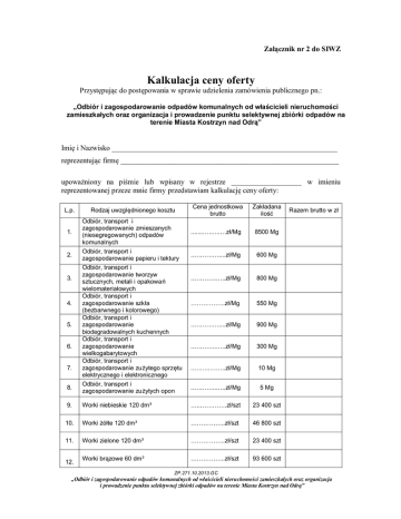 Załącznik nr 2 do SIWZ Kalkulacja ceny oferty Przystępując do postępowania w sprawie udzielenia zamówienia publicznego pn.: „Odbiór i zagospodarowanie odpadów komunalnych od właścicieli nieruchomości zamieszkałych oraz organizacja i prowadzenie punktu selektywnej zbiórki odpadów na terenie Miasta Kostrzyn nad Odrą” Imię i Nazwisko _____________________________________________________________ reprezentując firmę ___________________________________________________________ upoważniony na piśmie lub wpisany w rejestrze ___________________ w imieniu reprezentowanej przeze mnie firmy przedstawiam kalkulację ceny oferty: L.p. 1. 2. 3. 4. 5. 6. 7. 8. Rodzaj uwzględnionego kosztu Odbiór, transport i zagospodarowanie zmieszanych (niesegregowanych) odpadów komunalnych Odbiór, transport i zagospodarowanie papieru i tektury Odbiór, transport i zagospodarowanie tworzyw sztucznych, metali i opakowań wielomateriałowych Odbiór, transport i zagospodarowanie szkła (bezbarwnego i kolorowego) Odbiór, transport i zagospodarowanie biodegradowalnych kuchennych Odbiór, transport i zagospodarowanie wielkogabarytowych Odbiór, transport i zagospodarowanie zużytego sprzętu elektrycznego i elektronicznego Odbiór, transport i zagospodarowanie zużytych opon Cena jednostkowa brutto Zakładana ilość ........……..…zł/Mg 8500 Mg ..…………....zł/Mg 600 Mg ..………..…..zł/Mg 800 Mg ……………..zł/Mg 550 Mg ..…………....zł/Mg 900 Mg ..………..…..zł/Mg 300 Mg ..……..……..zł/Mg 10 Mg ..………..…..zł/Mg 5 Mg 9. Worki niebieskie 120 dm³ …..………….zł/szt 23 400 szt 10. Worki żółte 120 dm³ ……………..zł/szt 46 800 szt 11. Worki zielone 120 dm³ ……………..zł/szt 23 400 szt Worki brązowe 60 dm³ ……………..zł/szt 93 600 szt 12. Razem brutto w zł ZP.271.10.2013.GC „Odbiór i zagospodarowanie odpadów komunalnych od właścicieli nieruchomości zamieszkałych oraz organizacja i prowadzenie punktu selektywnej zbiórki odpadów na terenie Miasta Kostrzyn nad Odrą” 13. 14. 15. 16. 17. 18. 19. 20. 21. 22. 23. 24. Eksploatacja i obsługa PSZOK Odbiór w PSOK i zagospodarowanie odpadów zielonych Odbiór w PSZOK i zagospodarowanie tworzyw sztucznych, metali i opakowań wielomateriałowych Odbiór w PSZOK i zagospodarowanie papieru i tektury Odbiór w PSZOK i zagospodarowanie szkła (bezbarwnego i kolorowego Odbiór w PSZOK i zagospodarowanie biodegradowalnych kuchennych Odbiór w PSZOK i zagospodarowanie wielkogabarytowych Odbiór w PSZOK i zagospodarowanie zużytego sprzętu elektrycznego i elektronicznego Odbiór w PSZOK i zagospodarowanie zużytych opon Odbiór w PSZOK i zagospodarowanie odpadów niebezpiecznych Odbiór w PSZOK i zagospodarowanie zużytych olei Odbiór w PSZOK i zagospodarowanie odpadów budowlanych i remontowo rozbiórkowych ……….zł/miesiąc 18 miesięcy …………....zł/Mg 300 Mg ……………..zł/Mg 80 Mg ……………..zł/Mg 60 Mg ……………..zł/Mg 55 Mg ……………..zł/Mg 45 Mg ……………..zł/Mg 30 Mg ……………..zł/Mg 5 Mg ……………..zł/Mg 2 Mg ……………..zł/Mg 1 Mg ……………..zł/Mg 1 Mg ……………..zł/Mg 300 Mg RAZEM: (Suma pozycji od 1 do 24) Słownie wartość oferty brutto.................................................. ..................................................... ..................................................................................................................... .................................. …....................., dnia ……………................. ………………………………………………………... podpis uprawnionego przedstawiciela wykonawcy ZP.271.10.2013.GC „Odbiór i zagospodarowanie odpadów komunalnych od właścicieli nieruchomości zamieszkałych oraz organizacja i prowadzenie punktu selektywnej zbiórki odpadów na terenie Miasta Kostrzyn nad Odrą”