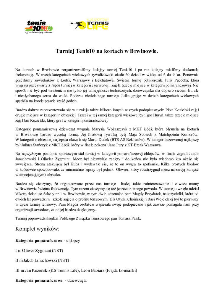 Turniej Tenis10 na kortach w Brwinowie. Komplet wyników: