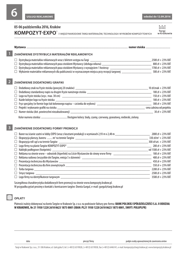 6 odesłać do 12.09.2016 USŁUGI REKLAMOWE 05-06 października 2016, Kraków KOMPOZYT-EXPO® 7. MIĘDZYNARODOWE TARGI MATERIAŁÓW, TECHNOLOGII I WYROBÓW KOMPOZYTOWYCH Wystawca ............................................................................................................................................................... numer stoiska ....................................... 1 ZAMÓWIENIE DYSTRYBUCJI MATERIAŁÓW REKLAMOWYCH ££ ££ ££ ££ 2 Dystrybucja materiałów reklamowych wraz z biletem wstępu na Targi ______________________________________ 2500 zł + 23% VAT Dystrybucja materiałów reklamowych poza stoiskiem Wystawcy (obsługa własna)_______________________________ 800 zł + 23% VAT Dystrybucja materiałów reklamowych poza stoiskiem Wystawcy z wynajęciem 1 hostessy__________________________ 1700 zł + 23% VAT Wyłożenie materiałów reklamowych dla publiczności w wyznaczonym miejscu przy recepcji targowej___________________ 500 zł + 23% VAT ZAMÓWIENIE DODATKOWEJ GRAFIKI ££ ££ ££ ££ ££ ££ ££ Dodatkowy znak na fryzie stoiska (powyżej 20 znaków) _____________________________________________ 10 zł/znak + 23% VAT Dodatkowy standardowy napis na drugim fryzie narożnego stoiska ________________________________________ 100 zł + 23% VAT Logo na fryzie stoiska (wys.: max. 30 cm) _______________________________________________________ 150 zł + 23% VAT Każde kolejne logo na fryzie stoiska ___________________________________________________________ 100 zł + 23% VAT Fryz specjalny (w formie logo lub kolorowego napisu – czcionka do wyboru) __________________________________ 300 zł + 23% VAT Projekt i wykonanie grafiki na stoisku ______________________________________________________ cena zależna od projektu Numer stoiska (dot. powierzchni niezabudowanej) ___________________________________________________ 30 zł + 23% VAT Kolor numeru stoiska: ......................................... Dostępne kolory: biały, czarny, czerwony, granatowy, niebieski, zielony. 3 ZAMÓWIENIE DODATKOWEJ FORMY PROMOCJI ££ ££ ££ ££ ££ ££ ££ ££ ££ ££ ££ ££ Baner na ścianie szatni w lobby EXPO (wraz z kosztami produkcji) o wymiarach 2,93 m x 2,48 m ______________________ 2000 zł + 23% VAT Ekspozycja planszy, baneru ........ m2 na terenie Targów _____________________________________________ 330 zł/m2 + 23% VAT Ekspozycja roll-up’u na terenie Targów _______________________________________________________ 300 zł/szt. + 23% VAT Logo firmy na planie Targów KOMPOZYT-EXPO® ____________________________________________________ 200 zł + 23% VAT Naklejki podłogowe (footprints) ___________________________________________________________ od 1500 zł + 23% VAT Reklama na stronie www – odnośnik (hiperlink) na Liście Wystawców do strony www firmy ________________________ 100 zł + 23% VAT Reklama radiowa (wszystkie dni Targów, emisja 5 x dziennie) ___________________________________________ 400 zł + 23% VAT Prezentacja techniczna dla Wystawców _________________________________________________________ 450 zł + 23% VAT Prezentacja techniczna dla firm zewnętrznych _____________________________________________________ 550 zł + 23% VAT Torba targowa _______________________________________________________________________ 2200 zł + 23% VAT Smycz targowa ______________________________________________________________________ 2500 zł + 23% VAT Logo firmy na identyfikatorze targowym _______________________________________________________ 3500 zł + 23% VAT Szczegółowa charakterystyka dodatkowych form promocji na stronie www.kompozyty.krakow.pl. W przypadku pytań prosimy o kontakt z komisarzem targów: Dorota Gurgul, e-mail: [email protected] OPŁATY Płatności należy dokonywać na konto Targów w Krakowie Sp. z o.o. na podstawie faktury pro-forma: BANK POLSKIEJ SPÓŁDZIELCZOŚCI S.A. II ODDZIAŁ W KRAKOWIE, Nr 21 1930 1220 2610 0623 1875 0001 (IBAN: PL21 1930 1220 2610 0623 1875 0001, SWIFT: POLUPLPR) data pieczęć firmy podpis osoby upoważnionej do zawierania umów Targi w Krakowie Sp. z o.o., 31-586 Krakow, ul. Galicyjska 9, tel. (+4812) 6519028, (+4812) 6519038, fax (+4812) 6446141, e-mail: [email protected], www.kompozyty.krakow.pl 6A odesłać do 12.09.2016 DODATKOWE USŁUGI REKLAMOWE NA TERENIE EXPO KRAKÓW 05-06 października 2016, Kraków KOMPOZYT-EXPO® 7. MIĘDZYNARODOWE TARGI MATERIAŁÓW, TECHNOLOGII I WYROBÓW KOMPOZYTOWYCH Wystawca ............................................................................................................................................................... numer stoiska ....................................... 1 REKLAMA WEWNĘTRZNA NA TERENIE EXPO KRAKÓW ££ Ekspozytory na terenie EXPO Kraków _________________________________________________________ 1000 zł + 23% VAT Parametry ekspozytorów uzależnione są od ich lokalizacji na terenie EXPO Kraków. ££ Jednorazowe podkładki papierowe na tacach gastronomicznych _________________________________________ 4000 zł + 23% VAT ££ Podwieszanie na dźwigarach na terenie EXPO Kraków (liczba miejsc ograniczona) ____________________________ wycena indywidualna Cena wyliczana na podstawie wielkości baneru/elementu przestrzennego (dostarczanego przez Zamawiającego) przy wcześniejszej weryfikacji możliwości technicznych. ££ Telewizory w lobby i restauracji EXPO Kraków 4 szt.(liczba spotów ograniczona) ________________________________ 800 zł + 23% VAT Spot dostarczony przez Zamawiającego (o maksymalnej długości 45 s.) emitowany min. 5 x dziennie, zgodnie z wytycznymi wskazanymi przez TwK. UWAGA! Wszystkie wyszczególnione w pkt. 1 i 2 materiały promocyjne powinny zostać dostarczone do siedziby TwK (ul. Galicyjska 9, 31-586 Kraków) najpóźniej 10 dni przed rozpoczęciem Targów. 2 REKLAMA ZEWNĘTRZNA NA TERENIE EXPO KRAKÓW ££ Balon reklamowy na parkingu EXPO Kraków _____________________________________________________ 3000 zł 