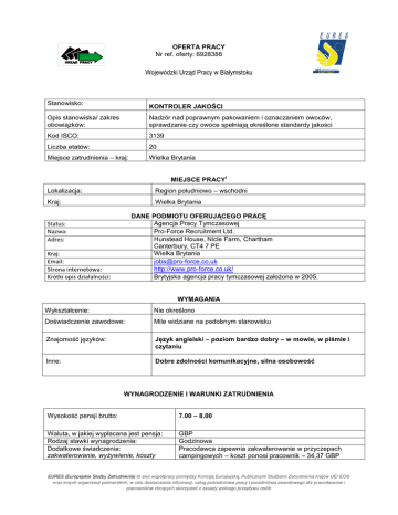OFERTA PRACY Nr ref. oferty: 6928388 Wojewódzki Urząd Pracy w Białymstoku Stanowisko: KONTROLER JAKOŚCI Opis stanowiska/ zakres obowiązków: Nadzór nad poprawnym pakowaniem i oznaczaniem owoców, sprawdzanie czy owoce spełniają określone standardy jakości Kod ISCO: 3139 Liczba etatów: 20 Miejsce zatrudnienia – kraj: Wielka Brytania MIEJSCE PRACY i Lokalizacja: Region południowo – wschodni Kraj: Wielka Brytania DANE PODMIOTU OFERUJĄCEGO PRACĘ Agencja Pracy Tymczasowej Pro-Force Recruitment Ltd. Hunstead House, Nicle Farm, Chartham Canterbury, CT4 7 PE Wielka Brytania [email protected] http://www.pro-force.co.uk/ Brytyjska agencja pracy tymczasowej założona w 2005. Status: Nazwa: Adres: Kraj: Email: Strona internetowa: Krótki opis działalności: WYMAGANIA Wykształcenie: Nie określono Doświadczenie zawodowe: Mile widziane na podobnym stanowisku Znajomość języków: Język angielski – poziom bardzo dobry – w mowie, w piśmie i czytaniu Inne: Dobre zdolności komunikacyjne, silna osobowość WYNAGRODZENIE I WARUNKI ZATRUDNIENIA Wysokość pensji brutto: 7.00 – 8.00 Waluta, w jakiej wypłacana jest pensja: Rodzaj stawki wynagrodzenia: Dodatkowe świadczenia: zakwaterowanie, wyżywienie, koszty GBP Godzinowa Pracodawca zapewnia zakwaterowanie w przyczepach campingowych – koszt ponosi pracownik – 34,37 GBP EURES (Europejskie Służby Zatrudnienia) to sieć współpracy pomiędzy Komisją Europejską, Publicznymi Służbami Zatrudnienia krajów UE/ EOG oraz innych organizacji partnerskich, w celu dostarczania informacji, usług pośrednictwa pracy i poradnictwa zawodowego dla pracodawców i pracowników chcących skorzystać z zasady wolnego przepływu osób dojazdów itp. tygodniowo plus opłaty za gaz i elektryczność Czas trwania umowy: Czas określony Umowa długoterminowa Data wygaśnięcia umowy (w przypadku umowy na czas określony): Do uzgodnienia z pracodawcą Liczba godzin tygodniowo: Średnio 40 godzin/ 6 dni w tygodniu, praca na zmiany, także w weekendy Data rozpoczęcia: Do uzgodnienia z pracodawcą Inne: Pracodawca zapewnia transport do pracy – koszt ponosi pracownik SPOSÓB SKŁADANIA WNIOSKU Wymagane dokumenty CV Język, w którym muszą być sporządzone przedkładane dokumenty: Angielski Do kogo należy wysłać dokumenty: Doradca EURES Gdzie należy wysłać dokumenty: [email protected] w tytule emaila proszę wpisać – kontroler jakości Dane teleadresowe doradcy EURES lub przedstawiciela pracodawcy: Tel. 85 7497 235, fax 85 7497 209 Inne: WAŻNOŚĆ Data publikacji: 28.04.2014 r. Termin przedkładania podań o pracę / zakończenia ważności oferty: Do odwołania Uprzejmie informujemy, że skontaktujemy się wyłącznie z wybranymi kandydatami. Agencja pracy tymczasowej Teamworks Resource Ltd , Tibbs Court, Brenchley Tonbridge, Kent, TN12 7AG, Wielka Brytania oświadczyła, że prowadzi działalność zgodnie z przepisami obowiązującymi w Wielkiej Brytanii. UWAGA: 1. Umowa z zagranicznym pracodawcą zostanie zawarta zgodnie z prawem kraju zatrudnienia. Oznacza to, że wszystkie roszczenia odnośnie do warunków, które obejmuje umowa, można kierować wyłącznie do odpowiedniego sądu w kraju zatrudnienia. Publiczne służby zatrudnienia (EURES) nie mogą pośredniczyć ani reprezentować pracownika w sądzie kraju zatrudnienia w przypadku sporu z pracodawcą. 2. Publiczne służby zatrudnienia (EURES) dokładają wszelkich starań, aby zapewnić rzetelność i wiarygodność ofert pracy zgłoszonych w lokalnym urzędzie pracy. Należy wyjaśnić, że oferta pracy została zgłoszona przez stronę trzecią i EURES nie odpowiada za ewentualne rozbieżności między warunkami pracy określonymi w ofercie pracy i warunkami oferowanymi przez potencjalnego pracodawcę. 3. Publiczne służby zatrudnienia (EURES) informują, że będą zbierać, przetwarzać i przekazywać potencjalnym pracodawcom zgodnie z przepisami dotyczącymi ochrony danych osobowych wszystkie dane osobowe dostarczone przez osoby poszukujące pracy. i Miejsce, w którym będzie wykonywana praca. Należy wypełnić w przypadku gdy: 1) miejsce wykonywania pracy jest inne niż siedziba podmiotu oferującego pracę, 2) pracę oferuje agencja pośrednictwa pracy/ agencja pracy tymczasowej. EURES (Europejskie Służby Zatrudnienia) to sieć współpracy pomiędzy Komisją Europejską, Publicznymi Służbami Zatrudnienia krajów UE/ EOG oraz innych organizacji partnerskich, w celu dostarczania informacji, usług pośrednictwa pracy i poradnictwa zawodowego dla pracodawców i pracowników chcących skorzystać z zasady wolnego przepływu osób