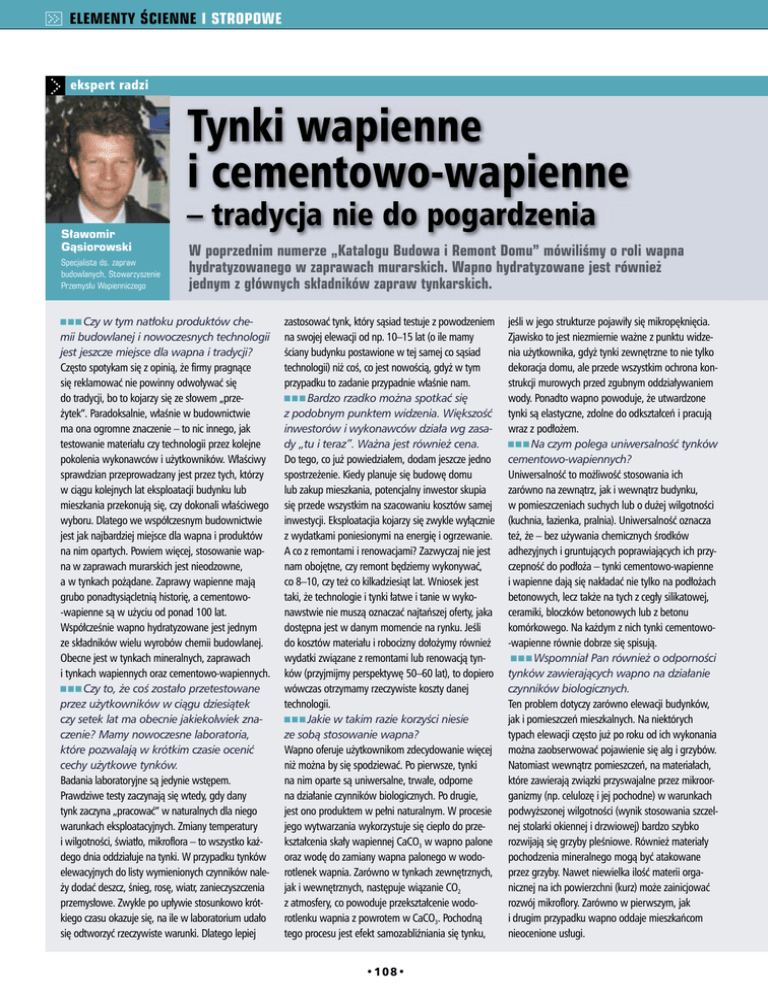 ELEMENTY ŚCIENNE I STROPOWE ekspert radzi Tynki wapienne i cementowo-wapienne Sławomir Gąsiorowski Specjalista ds. zapraw budowlanych, Stowarzyszenie Przemysłu Wapienniczego – tradycja nie do pogardzenia W poprzednim numerze „Katalogu Budowa i Remont Domu” mówiliśmy o roli wapna hydratyzowanego w zaprawach murarskich. Wapno hydratyzowane jest również jednym z głównych składników zapraw tynkarskich. Czy w tym natłoku produktów chemii budowlanej i nowoczesnych technologii jest jeszcze miejsce dla wapna i tradycji? Często spotykam się z opinią, że firmy pragnące się reklamować nie powinny odwoływać się do tradycji, bo to kojarzy się ze słowem „przeżytek”. Paradoksalnie, właśnie w budownictwie ma ona ogromne znaczenie – to nic innego, jak testowanie materiału czy technologii przez kolejne pokolenia wykonawców i użytkowników. Właściwy sprawdzian przeprowadzany jest przez tych, którzy w ciągu kolejnych lat eksploatacji budynku lub mieszkania przekonują się, czy dokonali właściwego wyboru. Dlatego we współczesnym budownictwie jest jak najbardziej miejsce dla wapna i produktów na nim opartych. Powiem więcej, stosowanie wapna w zaprawach murarskich jest nieodzowne, a w tynkach pożądane. Zaprawy wapienne mają grubo ponadtysiącletnią historię, a cementowo-wapienne są w użyciu od ponad 100 lat. Współcześnie wapno hydratyzowane jest jednym ze składników wielu wyrobów chemii budowlanej. Obecne jest w tynkach mineralnych, zaprawach i tynkach wapiennych oraz cementowo-wapiennych. Czy to, że coś zostało przetestowane przez użytkowników w ciągu dziesiątek czy setek lat ma obecnie jakiekolwiek znaczenie? Mamy nowoczesne laboratoria, które pozwalają w krótkim czasie ocenić cechy użytkowe tynków. Badania laboratoryjne są jedynie wstępem. Prawdziwe testy zaczynają się wtedy, gdy dany tynk zaczyna „pracować” w naturalnych dla niego warunkach eksploatacyjnych. Zmiany temperatury i wilgotności, światło, mikroflora – to wszystko każdego dnia oddziałuje na tynki. W przypadku tynków elewacyjnych do listy wymienionych czynników należy dodać deszcz, śnieg, rosę, wiatr, zanieczyszczenia przemysłowe. Zwykle po upływie stosunkowo krótkiego czasu okazuje się, na ile w laboratorium udało się odtworzyć rzeczywiste warunki. Dlatego lepiej zastosować tynk, który sąsiad testuje z powodzeniem na swojej elewacji od np. 10–15 lat (o ile mamy ściany budynku postawione w tej samej co sąsiad technologii) niż coś, co jest nowością, gdyż w tym przypadku to zadanie przypadnie właśnie nam. Bardzo rzadko można spotkać się z podobnym punktem widzenia. Większość inwestorów i wykonawców działa wg zasady „tu i teraz”. Ważna jest również cena. Do tego, co już powiedziałem, dodam jeszcze jedno spostrzeżenie. Kiedy planuje się budowę domu lub zakup mieszkania, potencjalny inwestor skupia się przede wszystkim na szacowaniu kosztów samej inwestycji. Eksploatacjia kojarzy się zwykle wyłącznie z wydatkami poniesionymi na energię i ogrzewanie. A co z remontami i renowacjami? Zazwyczaj nie jest nam obojętne, czy remont będziemy wykonywać, co 8–10, czy też co kilkadziesiąt lat. Wniosek jest taki, że technologie i tynki łatwe i tanie w wykonawstwie nie muszą oznaczać najtańszej oferty, jaka dostępna jest w danym momencie na rynku. Jeśli do kosztów materiału i robocizny dołożymy również wydatki związane z remontami lub renowacją tynków (przyjmijmy perspektywę 50–60 lat), to dopiero wówczas otrzymamy rzeczywiste koszty danej technologii. Jakie w takim razie korzyści niesie ze sobą stosowanie wapna? Wapno oferuje użytkownikom zdecydowanie więcej niż można by się spodziewać. Po pierwsze, tynki na nim oparte są uniwersalne, trwałe, odporne na działanie czynników biologicznych. Po drugie, jest ono produktem w pełni naturalnym. W procesie jego wytwarzania wykorzystuje się ciepło do przekształcenia skały wapiennej CaCO3 w wapno palone oraz wodę do zamiany wapna palonego w wodorotlenek wapnia. Zarówno w tynkach zewnętrznych, jak i wewnętrznych, następuje wiązanie CO2 z atmosfery, co powoduje przekształcenie wodorotlenku wapnia z powrotem w CaCO3. Pochodną tego procesu jest efekt samozabliźniania się tynku, •108• jeśli w jego strukturze pojawiły się mikropęknięcia. Zjawisko to jest niezmiernie ważne z punktu widzenia użytkownika, gdyż tynki zewnętrzne to nie tylko dekoracja domu, ale przede wszystkim ochrona konstrukcji murowych przed zgubnym oddziaływaniem wody. Ponadto wapno powoduje, że utwardzone tynki są elastyczne, zdolne do odkształceń i pracują wraz z podłożem. Na czym polega uniwersalność tynków cementowo-wapiennych? Uniwersalność to możliwość stosowania ich zarówno na zewnątrz, jak i wewnątrz budynku, w pomieszczeniach suchych lub o dużej wilgotności (kuchnia, łazienka, pralnia). Uniwersalność oznacza też, że – bez używania chemicznych środków adhezyjnych i gruntujących poprawiających ich przyczepność do podłoża – tynki cementowo-wapienne i wapienne dają się nakładać nie tylko na podłożach betonowych, lecz także na tych z cegły silikatowej, ceramiki, bloczków betonowych lub z betonu komórkowego. Na każdym z nich tynki cementowo-wapienne równie dobrze się spisują. Wspomniał Pan również o odporności tynków zawierających wapno na działanie czynników biologicznych. Ten problem dotyczy zarówno elewacji budynków, jak i pomieszczeń mieszkalnych. Na niektórych typach elewacji często już po roku od ich wykonania można zaobserwować pojawienie się alg i grzybów. Natomiast wewnątrz pomieszczeń, na materiałach, które zawierają związki przyswajalne przez mikroorganizmy (np. celulozę i jej pochodne) w warunkach podwyższonej wilgotności (wynik stosowania szczelnej stolarki okiennej i drzwiowej) bardzo szybko rozwijają się grzyby pleśniowe. Również materiały pochodze