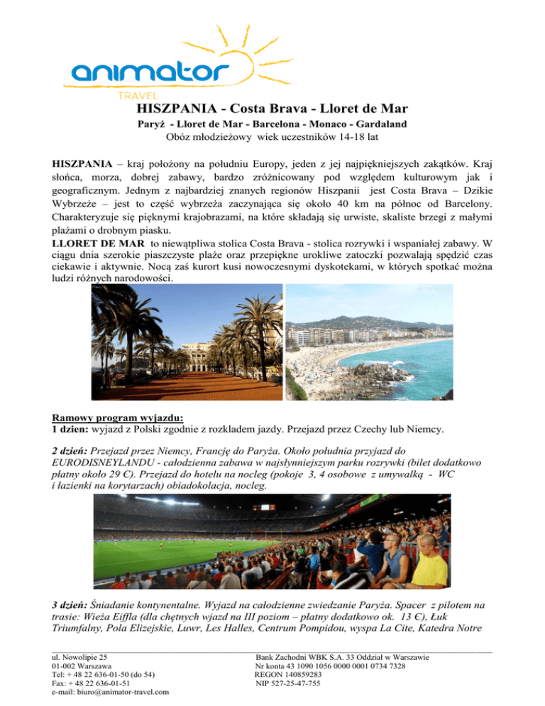 HISZPANIA - Costa Brava - Lloret de Mar Paryż - Lloret de Mar - Barcelona - Monaco - Gardaland Obóz młodzieżowy wiek uczestników 14-18 lat HISZPANIA – kraj położony na południu Europy, jeden z jej najpiękniejszych zakątków. Kraj słońca, morza, dobrej zabawy, bardzo zróżnicowany pod względem kulturowym jak i geograficznym. Jednym z najbardziej znanych regionów Hiszpanii jest Costa Brava – Dzikie Wybrzeże – jest to część wybrzeża zaczynająca się około 40 km na północ od Barcelony. Charakteryzuje się pięknymi krajobrazami, na które składają się urwiste, skaliste brzegi z małymi plażami o drobnym piasku. LLORET DE MAR to niewątpliwa stolica Costa Brava - stolica rozrywki i wspaniałej zabawy. W ciągu dnia szerokie piaszczyste plaże oraz przepiękne urokliwe zatoczki pozwalają spędzić czas ciekawie i aktywnie. Nocą zaś kurort kusi nowoczesnymi dyskotekami, w których spotkać można ludzi różnych narodowości. Ramowy program wyjazdu: 1 dzien: wyjazd z Polski zgodnie z rozkladem jazdy. Przejazd przez Czechy lub Niemcy. 2 dzień: Przejazd przez Niemcy, Francję do Paryża. Około południa przyjazd do EURODISNEYLANDU - całodzienna zabawa w najsłynniejszym parku rozrywki (bilet dodatkowo płatny około 29 Є). Przejazd do hotelu na nocleg (pokoje 3, 4 osobowe z umywalką - WC i łazienki na korytarzach) obiadokolacja, nocleg. 3 dzień: Śniadanie kontynentalne. Wyjazd na całodzienne zwiedzanie Paryża. Spacer z pilotem na trasie: Wieża Eiffla (dla chętnych wjazd na III poziom – płatny dodatkowo ok. 13 Є), Łuk Triumfalny, Pola Elizejskie, Luwr, Les Halles, Centrum Pompidou, wyspa La Cite, Katedra Notre ___________________________________________________________________________________________________________ ul. Nowolipie 25 Bank Zachodni WBK S.A. 33 Oddział w Warszawie 01-002 Warszawa Nr konta 43 1090 1056 0000 0001 0734 7328 Tel: + 48 22 636-01-50 (do 54) REGON 140859283 Fax: + 48 22 636-01-51 NIP 527-25-47-755 e-mail: [email protected] Dame. Obiadokolacja. W godzinach wieczornych wyjazd do Hiszpanii. Nocny przejazd przez Francję. 4 dzień: Śniadanie we własnym zakresie. W zależności od czasu przejazdu zwiedzanie Carcassone (zamek i twierdza). Przyjazd do Lloret w godz. popołudniowo-wieczornych, kolacja, zakwaterowanie. 4-11 dzień: Pobyt w Lloret – 8 dni (7 noclegów) W trakcie pobytu w programie: - całodzienna wycieczka autokarowa do Barcelony (m.in. katedra Sagrada Familia, La Rambla, Park Guella, dzielnica gotycka, Stadion FC Barcelona (bilet dodatkowo płatny dla chętnych ok 18 euro) wieczorem pokazy grających fontann. Program fakultatywny: - miasteczko wodne - ok. 27 Є - wieczór hiszpański -pokazy flamenco - ok. 26 Є - karnet na dyskoteki (min. 5 x) - ok. 25 Є - rejs statkiem do Tossa de Mar - ok. 15 € (2 strony) 11 dzień: Śniadanie, wykwaterowanie z hotelu. Złożenie bagaży. Czas wolny. Obiad. Wyjazd z Hiszpanii w godz. popołudniowo-wieczornych. Późnym wieczorem przyjazd do Francji –w zależności od czasu przejazdu zwiedzanie Monaco i Monte Carlo by night. Przejazd do Włoch. 12 dzień: Przyjazd w okolice Werony, wypoczynek i wspaniała zabawa nad jeziorem Garda w Parku Rozrywki GARDALAND (bilet dodatkowo płatny około 27 Є). W godzinach wieczornych wyjazd do Polski. 13 dzień: Przejazd przez Austrię, Czechy. Przyjazd do Polski ZAKWATEROWANIE: Hotel Gran Don Juan*** położony w centrum Lloret de Mar w odległości około 450 m od szerokiej plaży. Hotel oferuje gościom 2 baseny + leżaki, kawiarnię, restaurację, salę telewizyjną, sejf (dodatkowo płatny). Pokoje 3, 4 osobowe z łazienkami i klimatyzacją. WYŻYWIENIE: Francja: 1 gorąca obiadokolacja , jedno śniadanie kontynentalne, Hiszpania: 3 posiłki dziennie - bufet (śniadanie, obiad, kolacja). Pierwszym posiłkiem jest kolacja w dniu przyjazdu do Lloret, ostatnim obiad w dniu wyjazdu + suchy prowiant na drogę powrotną. W trakcie przejazdu wyżywienie we własnym zakresie. Napoje do posiłków dodatkowo płatne. TRANSPORT: autokar wyposażony w WC, barek, TV-video, klimatyzację. Terminy 16.07-28.07.2014 Cena standard 2090 zł Cena za wczasy 2350 zł Cena standard obowiązuje za obóz młodzieżowy. Cena za wczasy jest w pokoju 2 osobowym. ___________________________________________________________________________________________________________ ul. Nowolipie 25 Bank Zachodni WBK S.A. 33 Oddział w Warszawie 01-002 Warszawa Nr konta 43 1090 1056 0000 0001 0734 7328 Tel: + 48 22 636-01-50 (do 54) REGON 140859283 Fax: + 48 22 636-01-51 NIP 527-25-47-755 e-mail: [email protected] Cena obejmuje: Przejazd autokarem, 1 nocleg w Paryżu, 8 dni (7 noclegów) pobytu w Lloret, wyżywienie wg programu + suchy prowiant na drogę powrotną, ubezpieczenie AXA TUiR- KL (10000 Euro), NW(2000 euro),bagaż (200 euro), opiekę pedagogiczną, opiekę pilota-przewodnika, podatek VAT Cena nie obejmuje: biletów wstępu do zwiedzanych obiektów oraz programu fakultatywnego. Na bilety wstępu należy przeznaczyć ok. 85 Euro UWAGI: Podczas podróży jedzenie we własnym zakresie. Zalecane minimalne kieszonkowe ok.70 Euro. Opłata turystyczna Lloret de Mar dodatkowo płatna w hotelu – 5 euro /pobyt dla osób powyżej 16 roku życia. ___________________________________________________________________________________________________________ ul. Nowolipie 25 Bank Zachodni WBK S.A. 33 Oddział w Warszawie 01-002 Warszawa Nr konta 43 1090 1056 0000 0001 0734 7328 Tel: + 48 22 636-01-50 (do 54) REGON 140859283 Fax: + 48 22 636-01-51 NIP 527-25-47-755 e-mail: [email protected]