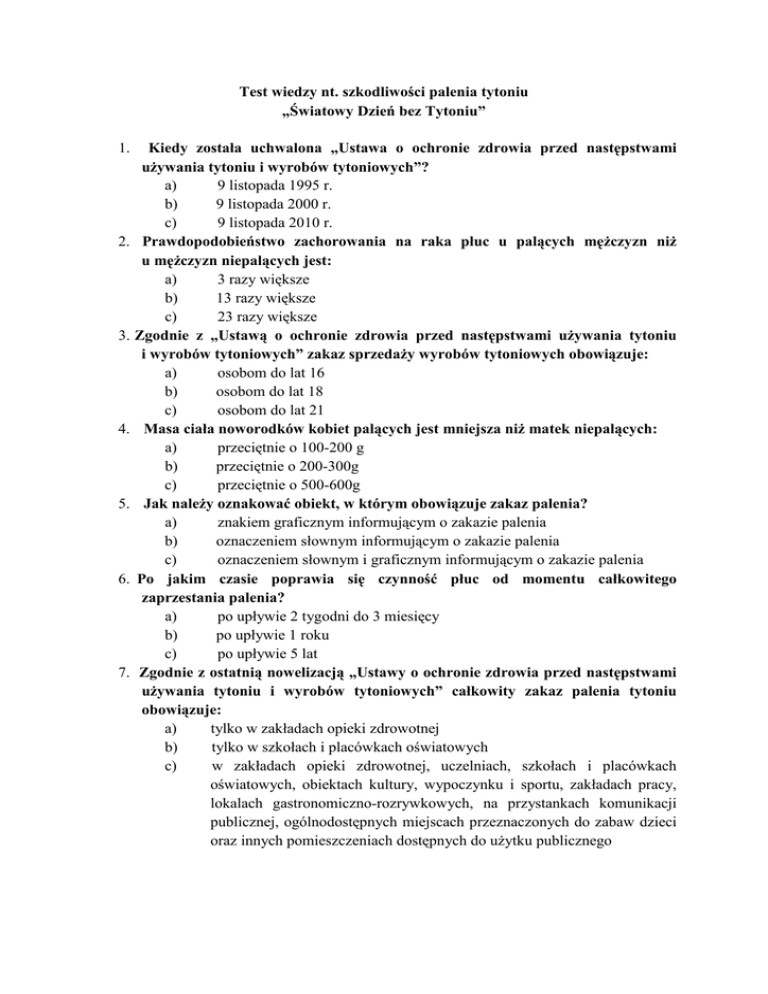 Test wiedzy nt. szkodliwości palenia tytoniu „Światowy Dzień bez Tytoniu” 1. 2. 3. 4. 5. 6. 7. Kiedy została uchwalona „Ustawa o ochronie zdrowia przed następstwami używania tytoniu i wyrobów tytoniowych”? a) 9 listopada 1995 r. 9 listopada 2000 r. b) c) 9 listopada 2010 r. Prawdopodobieństwo zachorowania na raka płuc u palących mężczyzn niż u mężczyzn niepalących jest: a) 3 razy większe 13 razy większe b) c) 23 razy większe Zgodnie z „Ustawą o ochronie zdrowia przed następstwami używania tytoniu i wyrobów tytoniowych” zakaz sprzedaży wyrobów tytoniowych obowiązuje: osobom do lat 16 a) b) osobom do lat 18 c) osobom do lat 21 Masa ciała noworodków kobiet palących jest mniejsza niż matek niepalących: a) przeciętnie o 100-200 g b) przeciętnie o 200-300g c) przeciętnie o 500-600g Jak należy oznakować obiekt, w którym obowiązuje zakaz palenia? a) znakiem graficznym informującym o zakazie palenia b) oznaczeniem słownym informującym o zakazie palenia c) oznaczeniem słownym i graficznym informującym o zakazie palenia Po jakim czasie poprawia się czynność płuc od momentu całkowitego zaprzestania palenia? a) po upływie 2 tygodni do 3 miesięcy b) po upływie 1 roku c) po upływie 5 lat Zgodnie z ostatnią nowelizacją „Ustawy o ochronie zdrowia przed następstwami używania tytoniu i wyrobów tytoniowych” całkowity zakaz palenia tytoniu obowiązuje: a) tylko w zakładach opieki zdrowotnej b) tylko w szkołach i placówkach oświatowych c) w zakładach opieki zdrowotnej, uczelniach, szkołach i placówkach oświatowych, obiektach kultury, wypoczynku i sportu, zakładach pracy, lokalach gastronomiczno-rozrywkowych, na przystankach komunikacji publicznej, ogólnodostępnych miejscach przeznaczonych do zabaw dzieci oraz innych pomieszczeniach dostępnych do użytku publicznego 8. Prawdopodobieństwo zachorowania na raka płuc u palących kobiet niż u kobiet niepalących jest: a) 3 razy większe b) 13 razy większe c) 23 razy większe 9. Palacze są szczególnie narażeni na: a) choroby nowotworowe, jaskrę, alergie b) choroby i nowotwory układu oddechowego, reumatoidalne zapalenie stawów c) choroby układu oddechowego, choroby układu krążenia, nowotwory 10. Jaka jest różnica w długości życia przeciętnego palacza i osoby niepalącej wg badań naukowych? a) palacz żyje 10 lat krócej b) osoba niepaląca żyje 10 lat dłużej c) odpowiedzi a i b są prawidłowe 11. Jakie jest ryzyko wystąpienia zawału serca u palacza? a) jest takie samo jak u osoby niepalącej tej samej płci i wieku b) co najmniej dwukrotnie większe niż u osoby niepalącej tej samej płci i wieku c) dwukrotnie mniejsze niż u osoby niepalącej tej samej płci i wieku 12. Jakie są konsekwencje palenia tytoniu? a) tylko konsekwencje zdrowotne b) tylko konsekwencje ekonomiczne i społeczne c) konsekwencje zdrowotne, ekonomiczne i społeczne 13. Każdy wypalony papieros kosztuje palacza: a) 1 minutę życia b) 11 minut życia c) 30 minut życia 14. Kiedy weszła w życie ostatnia nowelizacja „Ustawy o ochronie zdrowia przed następstwami używania tytoniu i wyrobów tytoniowych” z 1995 r.? a) w dniu 15 listopada 2010 r. b) w dniu 31 maja 2011 r. c) w dniu 15 marca 2012 r. 15. Jakiej wysokości grozi kara właścicielowi lub zarządzającemu obiektem za brak znaku zakazu palenia w miejscu, gdzie taki zakaz obowiązuje? a) 500 zł b) 2000 zł c) 20000 zł 16. Uprawnionymi do egzekucji ustawy antynikotynowej są: a) Państwowa Inspekcja Sanitarna, Urząd Ochrony Konkurencji i Konsumentów, Policja i Straż Miejska b) Narodowy Fundusz Zdrowia, Policja i Straż Miejska c) tylko Państwowa Inspekcja Sanitarna 17. Jaką witaminę palacze powinni przyjmować w większej dawce niż osoby niepalące? a) D b) C c) odpowiedzi a) i b) są prawidłowe 18. Jakie konsekwencje zdrowotne mogą wystąpić u dzieci narażonych na wdychanie dymu tytoniowego? a) wdychanie dymu tytoniowego jest mało szkodliwe b) jedynie konsekwencje ze strony układu oddechowego c) m. in. infekcje dróg oddechowych, astma, zapalenie ucha środkowego, nowotwory, nagła śmierć łóżeczkowa niemowląt 19. Ile substancji chemicznych znajduje się w dymie tytoniowym? a) 400 4000 b) c) 40 20. Jakiej wysokości grozi kara grzywny dla osób palących w miejscach objętych zakazem palenia? a) 500 zł b) 100 zł c) 1000 zł 21. Statystycznie osoba paląca pomniejsza dochody rodziny: a) o około 50000 zł rocznie b) o około 2500 zł rocznie c) o około 1000 zł rocznie 22. Jakie są korzyści z zaprzestania palenia? a) finansowe, społeczne i towarzyskie b) zdrowotne, społeczne i gospodarcze c) zdrowotne, finansowe i społeczne 23. Ile substancji rakotwórczych znajduje się w dymie papierosowym? a) 200 b) 40 c) 4000 24. Jaki wpływ ma palenie papierosów przez matkę na nienarodzone dziecko? a) dziecko rodzi się silne i zdrowe b) dziecko rodzi się słabsze, częściej choruje c) nie wywiera to żadnego wpływu na rozwój dziecka w łonie matki 25. Nikotynizm jest chorobą społeczną ponieważ: a) obejmuje bardzo szerokie rzesze społeczeństwa, przyczynia się do powstania ciężkich chorób i nadmiernej umieralności b) jest nałogiem tolerowanym przez ogół społeczeństwa c) osoby uzależnione są leczone ze środków pochodzących z budżetu państwa 26. Jak nazywają się substancje osiadające w płucach palacza? a) substancje aromatyczne substancje organiczne b) c) substancje smołowate 27. Koncerny tytoniowe zachęcają do nabywania wyrobów tytoniowych poprzez: a) promocję wyrobów tytoniowych reklamę b) c) odpowiedzi a i b są prawidłowe 28. Ile statystycznie palacz traci czasu na palenie tytoniu? a) ok. 1,5 godz. dziennie ok. 3,5 godz. dziennie b) ok. 7 godz. tygodniowo c) 29. Kto najszybciej uzależni się od nikotyny? nastolatek a) b) osoba dorosła kobieta c) 30. Jaka substancja chemiczna zawarta w papierosie prowadzi do uzależnienia? a) metanol b) nikotyna c) tlenek węgla 3