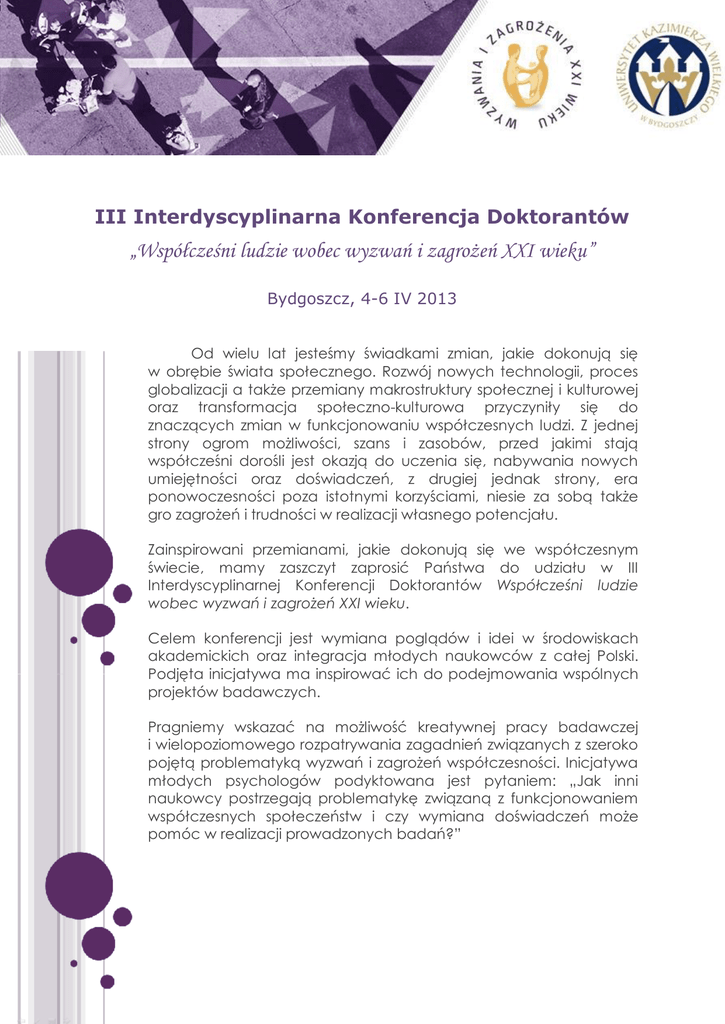 III Interdyscyplinarna Konferencja Doktorantów „Współcześni ludzie wobec wyzwań i zagrożeń XXI wieku” Bydgoszcz, 4-6 IV 2013 Od wielu lat jesteśmy świadkami zmian, jakie dokonują się w obrębie świata społecznego. Rozwój nowych technologii, proces globalizacji a także przemiany makrostruktury społecznej i kulturowej oraz transformacja społeczno-kulturowa przyczyniły się do znaczących zmian w funkcjonowaniu współczesnych ludzi. Z jednej strony ogrom możliwości, szans i zasobów, przed jakimi stają współcześni dorośli jest okazją do uczenia się, nabywania nowych umiejętności oraz doświadczeń, z drugiej jednak strony, era ponowoczesności poza istotnymi korzyściami, niesie za sobą także gro zagrożeń i trudności w realizacji własnego potencjału. Zainspirowani przemianami, jakie dokonują się we współczesnym świecie, mamy zaszczyt zaprosić Państwa do udziału w III Interdyscyplinarnej Konferencji Doktorantów Współcześni ludzie wobec wyzwań i zagrożeń XXI wieku. Celem konferencji jest wymiana poglądów i idei w środowiskach akademickich oraz integracja młodych naukowców z całej Polski. Podjęta inicjatywa ma inspirować ich do podejmowania wspólnych projektów badawczych. Pragniemy wskazać na możliwość kreatywnej pracy badawczej i wielopoziomowego rozpatrywania zagadnień związanych z szeroko pojętą problematyką wyzwań i zagrożeń współczesności. Inicjatywa młodych psychologów podyktowana jest pytaniem: „Jak inni naukowcy postrzegają problematykę związaną z funkcjonowaniem współczesnych społeczeństw i czy wymiana doświadczeń może pomóc w realizacji prowadzonych badań?” Do udziału w konferencji zapraszamy doktorantów i młodych naukowców reprezentujących wszystkie nauki zainteresowane problemami współczesności: psychologów, pedagogów, socjologów, filozofów, ekonomistów, jak i przedstawicieli innych dyscyplin nauki. Pragnąc stworzyć jak najszerszą płaszczyznę wymiany myśli, informacji i doniesień badawczych, podajemy przykładowe propozycje tematów sesji i sympozjów: Jakość życia człowieka w XXI wieku Uwarunkowania jakości życia współczesnych ludzi Zagrożenia cywilizacyjne – psychologiczne funkcjonowanie człowieka wobec chorób cywilizacyjnych Zachowania zdrowotne współczesnych ludzi Kryzysy współczesnego życia W obliczu zagrożenia – radzenie sobie w sytuacjach trudnych Oblicza uzależnień jako problem współczesności Temperamentalne, osobowościowe wyznaczniki aktywności człowieka Współczesne życie rodzinne Rodzina jako szansa na pomyślny rozwój człowieka Współczesna rodzina z punktu widzenia szans i zagrożeń (migracje zarobkowe, zmiany modelu rodziny, rozwody, „eurosieroctwo”, itp.) Godzenie ról rodzinnych i zawodowych jako wyzwanie współczesności Relacje partnerskie Współczesne związki interpersonalne – bliskość, intymność i miłość w relacjach Współczesne problemy prokreacji (bezpłodność, alternatywne metody poczęcia, rozwój antykoncepcji) nadużyć? Funkcjonowanie człowieka w XXI wieku Znaczenie współczesnych zmian cywilizacyjnych dla relacji międzypokoleniowych Sposoby spędzania wolnego czasu – w poszukiwaniu tożsamości Współczesny świat wartości i autorytetów Zainteresowania jako ryzyko lub potencjał współczesnych ludzi Współczesna szkoła jako środowisko wspierające lub utrudniające rozwój uczniów i nauczycieli Funkcjonowanie współczesnych grup młodzieżowych Współczesne społeczeństwo obywatelskie Rola przemian ekonomicznych i technologicznych dla życia współczesnych ludzi Współczesne problemy osób niepełnosprawnych Współczesny rynek pracy (bezrobocie, ubóstwo, dyskryminacja w miejscu pracy) Media i współczesność (rozwój Internetu, portale randkowe, portale społecznościowe, blogi, telewizja, radio, prasa); „Dzisiejsze media z perspektywy rozwoju człowieka” Miejsce sztuki w życiu współczesnych (teatr, muzyka, galerie, filharmonia, opera, sztuka uliczna – graffiti) Podkreślając interdyscyplinarność konferencji, wykłady inauguracyjne wygłoszone zostaną przez znanych badaczy zajmujących się problematyką współczesności z różnych dziedzin nauki (psychologii, socjologii, pedagogiki). Podczas konferencji odbędą się wystąpienia ustne zorganizowane w sesjach tematycznych, sesja posterowa, interdyscyplinarna dyskusja panelowa. Mamy nadzieję na Państwa żywy odzew. Informacje organizacyjne: Komitet Naukowy dr hab. Hanna Liberska, prof. UKW – Przewodnicząca Komitetu Naukowego dr hab. Roman Leppert, prof. UKW - Prorektor ds. dydaktycznych i jakości kształcenia prof. dr hab. Janusz Trempała – Dyrektor Instytutu Psychologii dr hab. Małgorzata Basińska, prof. UKW dr hab. Barbara Ciżkowicz, prof. nadzw. UKW dr hab. Paweł Izdebski, prof. UKW prof. dr hab. Małgorzata Kościelska dr hab. Mirosława Nowak-Dziemianowicz, prof. DSW dr hab. Anna Oleszkowicz, prof. UWr prof. dr hab. Roman Ossowski dr hab. Bogdan Pietrulewicz, prof. UKW prof. dr hab. Krystyna Szafraniec Komitet Organizacyjny: Koordynator Konferencji – dr Alicja Malina Przewodnicząca Komitetu Organizacyjnego mgr Dorota Suwalska-Barancewicz Sekretarz Komitetu Organizacyjnego – mgr Paulina Andryszak mgr Katarzyna Brzuszkiewicz mgr Klaudia Boniecka mgr Ewelina Kamasz Opłata konferencyjna: Wysokość opłat: do 3 marca 2013 roku– 250 zł po 3 marca 2013 roku – 300 zł Termin uiszczania opłat za udział w Konferencji: 17.03.2013r. Opłatę konferencyjną prosimy uregulować przelewem na konto bankowe konferencji: Uniwersytet Kazimierza Wielkiego w Bydgoszczy Ul. Chodkiewicza 30, 85-064 Bydgoszcz 92 1500 1360 1213 6001 8602 0000 Kredyt Bank SA O. Bydgoszcz z dopiskiem: IKD Opłata konferencyjna obejmuje: - uczestnictwo w wykładach i sesjach, - materiały konferencyjne, - certyfikat uczestnictwa, - umieszczenie przyjętych wystąpień w punktowanej monografii (pod warunkiem uz