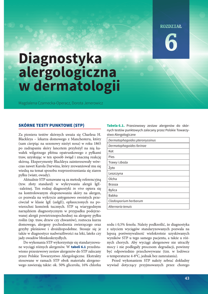 ROZDZIAŁ Diagnostyka alergologiczna w dermatologii Magdalena Czarnecka-Operacz, Dorota Jenerowicz SKÓRNE TESTY PUNKTOWE (STP) Za pioniera testów skórnych uważa się Charlesa H. Blackleya – lekarza domowego z Manchesteru, który (sam cierpiąc na sezonowy nieżyt nosa) w roku 1865 po zadrapaniu skóry lancetem przyłożył na nią kawałek wilgotnego płótna opatrunkowego z pyłkami traw, uzyskując w ten sposób świąd i znaczną reakcję skórną. Eksperymenty Blackleya zainteresowały wówczas nawet Karola Darwina, który zrewanżował mu się wiedzą na temat sposobu rozprzestrzeniania się ziaren pyłku (wiatr, owady). Aktualnie STP uznawane są za metodę referencyjną (tzw. złoty standard) w wykrywaniu alergii IgE-zależnej. Ten rodzaj diagnostyki in vivo opiera się na kontrolowanym eksponowaniu skóry na alergen, co pozwala na wykrycie antygenowo swoistych przeciwciał w klasie IgE (asIgE), opłaszczonych na powierzchni komórek tucznych. STP są wiarygodnym narzędziem diagnostycznym w przypadku podejrzewanej alergii powietrznopochodnej na alergeny pyłku roślin (np. traw, drzew czy chwastów), roztocza kurzu domowego, alergeny pochodzenia zwierzęcego oraz grzyby pleśniowe i drożdżopodobne. Stosuje się je także w diagnostyce nadwrażliwości na leki, lateks czy jady owadów błonkoskrzydłych. Do wykonania STP wykorzystuje się standaryzowane wyciągi różnych alergenów. W tabeli 6.1 przedstawiono przesiewowy zestaw alergenów do STP zalecany przez Polskie Towarzystwo Alergologiczne. Ekstrakty stosowane w ramach STP obok materiału alergenowego zawierają także: ok. 50% glicerolu, 16% chlorku Tabela 6.1. Przesiewowy zestaw alergenów do skórnych testów punktowych zalecany przez Polskie Towarzystwo Alergologiczne Dermatophagoides pteronyssinus Dermatophagoides farinae Kot Pies Trawy i zboża Żyto Leszczyna Olcha Brzoza Bylica Babka Cladosporium herbarum Alternaria tenuis sodu i 0,5% fenolu. Należy podkreślić, że diagnostyka z użyciem wyciągów standaryzowanych pozwala na lepszą porównywalność wielokrotnie uzyskiwanych wyników STP u tego samego pacjenta, a także u różnych chorych. Aby wyciągi alergenowe nie utraciły mocy i nie podlegały procesom degradacji, powinny być odpowiednio przechowywane (tzn. w lodówce o temperaturze 4-8°C, jednak bez zamrażania). Przed wykonaniem STP należy zebrać dokładny wywiad dotyczący przyjmowanych przez chorego 43 Magdalena Czarnecka-Operacz, Dorota Jenerowicz Tabela 6.2. Możliwy wpływ poszczególnych grup leków na reaktywność skóry i wymagany czas ich odstawienia przed diagnostyką Grupa leków Wpływ na odczyn w ramach STP Przerwa przed diagnostyką Leki przeciwhistaminowe Hamujący 3-10 dni Glikokortykosteroidy systemowe Hamujący 3 dni do 3 tygodni Miejscowe glikokortykosteroidy Hamujący 1-2 tygodnie Leki przeciwleukotrienowe Brak wpływu Odstawienie niewymagane Pimekrolimus Jak glikokortykosteroidy Brak jednoznacznych wytycznych Takrolimus Jak glikokortykosteroidy Brak jednoznacznych wytycznych leków – w szczególności leków przeciwhistaminowych i uspokajających, które mogą wpływać na zahamowanie odczynu skórnego w postaci bąbla pokrzywkowego. W tabeli 6.2 przedstawiono możliwy wpływ poszczególnych grup leków na reaktywność skóry w trakcie planowanych STP i wymagany czas odstawienia tych preparatów leczniczych przed diagnostyką. Wyciągi alergenowe nanosi się na skórę w objętości 1 kropli, zachowując odstęp 3-5 cm pomiędzy nałożeniem kolejnych alergenów. STP wykonuje się w obszarze skóry niezmienionej chorobowo w ten sposób, aby testowany wyciąg utrzymywał się w postaci izolowanej kropli. Wybieramy najczęściej wewnętrzną powierzchnię przedramienia (co najmniej 5 cm od nadgarstka i 3 cm od zgięcia łokciowego). Możliwe jest również wykonanie testów na skórze górnej części pleców, ale reaktywność skóry jest w tej lokalizacji większa. Klasycznie nakłucia skóry dokonuje się poprzez kroplę roztworu alergenowego, prostopadle do jej powierzchni, chociaż w sposób zmodyfikowany można wykonać nakłucie pod kątem 30-70° (większa głębokość i w konsekwencji wprowadzona większa ilość ekstraktu alergenowego). Do nakłucia skóry stosowane są metalowe lancety (tzw. lancety Morrowa-Browna) posiadające ostrze o długości 0,9 mm, zapewniające dobrą powtarzalność kolejnych nakłuć. Należy podkreślić, że każdy wyciąg alergenowy musi być wprowadzony do skóry za pomocą oddzielnego lancetu – pozwala to uniknąć przeniesienia ekstraktu. Nie powinno się stosować w STP zwykłych igieł do iniekcji, które uniemożliwiają dobrą kontrolę nad głębokością wkłucia, są przyczyną punktowego krwawienia i nie zapewniają standaryzacji wykonania procedury. Prawidłowe przeprowadzenie STP wymaga testów z roztworami kontrolnymi, które umożliwiają ocenę indywidualnej reaktywności skóry. Roztwory kontrolne obejmują: roztwór histaminy w stężeniu 1:1000 (kontrola dodatnia), zawierający: chlorowodorek histaminy 1,7 mg, chlorek sodu 9 mg, fenol 2 mg, glicerol 563 mg oraz wodę do iniekcji, a także roztwór soli fizjologicznej (kontrola ujemna), zawierający w 1 ml: chlorek sodu 44 9 mg, fenol 4 mg, glicerol 563 mg i wodę do iniekcji do 1 ml. Wynik testu z histaminą i z płynem kontroli ujemnej ocenia się po upływie ok. 15 minut od nakłucia, mierząc średnice najdłuższe (D) i prostopadłe (d) dla powstałych bąbli otoczonych rumieniem, a także wyliczając średnie średnice (D+d)/2 lub pola powierzchni. Bąbel po histaminie w stężeniu 10 mg/ml powinien mieć ponad 3 mm średnicy, a po płynie kontroli ujemnej nie więcej niż 3 mm, przy rumieniu poniżej 10 mm średnicy. Wynik STP z podejrzanym alergenem ocenia się po upływie 15 minut od nakłucia poprzez wykonanie identycznych pomiarów powstałego bąbla, po uprzednim usunięciu wyciągu gazikiem. Wynik STP zapisuje się jako średnicę rumienia i bąb