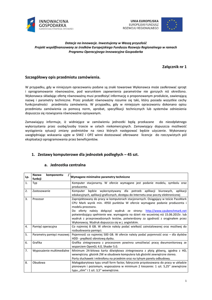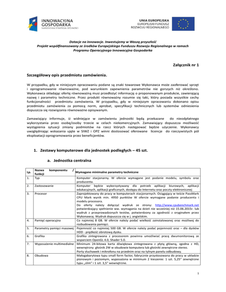 Dotacje na innowacje. Inwestujemy w Waszą przyszłość Projekt współfinansowany ze środków Europejskiego Funduszu Rozwoju Regionalnego w ramach Programu Operacyjnego Innowacyjna Gospodarka Załącznik nr 1 Szczegółowy opis przedmiotu zamówienia. W przypadku, gdy w niniejszym opracowaniu podane są znaki towarowe Wykonawca może zaoferować sprzęt i oprogramowanie równoważne, pod warunkiem zapewnienia parametrów nie gorszych niż określono. Wykonawca składając ofertę równoważną musi przedłożyć informację o proponowanym produkcie, zawierającą nazwę i parametry techniczne. Przez produkt równoważny rozumie się taki, który posiada wszystkie cechy funkcjonalności przedmiotu zamówienia. W przypadku, gdy w niniejszym opracowaniu dokonano opisu przedmiotu zamówienia za pomocą norm, aprobat, specyfikacji technicznych lub systemów odniesienia dopuszcza się rozwiązania równoważne opisywanym. Zamawiający informuje, iż widniejące w zamówieniu jednostki będą przekazane do nieodpłatnego wykorzystania przez osobę/osoby trzecie w celach niekomercyjnych. Zamawiający dopuszcza możliwość wystąpienia sytuacji zmiany podmiotów na rzecz których następować będzie użyczenie. Wykonawcy uwzględniając wskazania ujęte w SIWZ i OPZ winni dostosować oferowane licencje do rzeczywistych pól eksploatacji oprogramowania przez beneficjentów. 1. Zestawy komputerowe dla jednostek podległych – 45 szt. a. Jednostka centralna Lp. 1. 2. 3. 4. 5. 6. 7. 8. Nazwa funkcji Typ komponentu / Wymagane minimalne parametry techniczne Komputer stacjonarny. W ofercie wymagane jest podanie modelu, symbolu oraz producenta. Zastosowanie Komputer będzie wykorzystywany dla potrzeb aplikacji biurowych, aplikacji edukacyjnych, aplikacji graficznych, dostępu do Internetu oraz poczty elektronicznej Procesor Zaprojektowany do pracy w komputerach stacjonarnych. Osiągający w teście PassMark CPU Mark wynik min. 4950 punktów W ofercie wymagane podanie producenta i modelu procesora. Do oferty należy dołączyć wydruk ze strony: http://www.cpubenchmark.net potwierdzający spełnienie ww. wymagania na dzień nie wcześniej niż 15.06.2015r. lub wydruk z przeprowadzonych testów, potwierdzony za zgodność z oryginałem przez Wykonawcę. Wydruk dopuszcza się w j. angielskim. Pamięć operacyjna Co najmniej 8 GB. W ofercie należy podać wielkość zainstalowanej oraz możliwej do rozbudowania pamięci. Parametry pamięci masowej Pojemność co najmniej 500 GB. W ofercie należy podać pojemność oraz – dla dysków HDD - prędkość obrotową dysku. Grafika Grafika zintegrowana z procesorem powinna umożliwiać pracę dwumonitorową ze wsparciem OpenGL 4.0, Shader 5.0. Wyposażenie multimedialne Minimum 24-bitowa karta dźwiękowa zintegrowana z płytą główną, zgodna z HD, wewnętrzny głośnik 2W w obudowie komputera lub głośniki zewnętrzne stereo. Porty słuchawek i mikrofonu na przednim oraz na tylnym panelu odbudowy. Obudowa Małogabarytowa typu small form factor, fabrycznie przystosowana do pracy w układzie pionowym i poziomym, wyposażona w minimum 2 kieszenie: 1 szt. 5,25” zewnętrzne typu „slim” i 1 szt. 3,5” wewnętrzne. 1 Obudowa powinna fabrycznie umożliwiać montaż min. 1 szt. dysku 3,5” lub 2,5”. Suma wymiarów obudowy nie może przekraczać 75 cm. W ofercie należy podać wymiary obudowy. Zasilacz o mocy min. 250W pracujący w sieci 230V 50/60Hz prądu zmiennego. W ofercie należy podać moc zasilacza. Moduł konstrukcji obudowy w jednostce centralnej komputera powinien pozwalać na demontaż kart rozszerzeń, napędu optycznego i 3,5” dysku twardego bez konieczności użycia narzędzi (wyklucza się użycia śrub motylkowych). Obudowa jednostki centralnej musi być otwierana bez konieczności użycia narzędzi oraz posiadać czujnik otwarcia obudowy współpracujący z oprogramowaniem zarządzająco – diagnostycznym producenta komputera. Obudowa musi umożliwiać zastosowanie zabezpieczenia fizycznego w postaci linki metalowej (złącze blokady) oraz kłódki (oczko na kłódkę). Obudowa musi posiadać wbudowany wizualny lub dźwiękowy system diagnostyczny służący do sygnalizowania i diagnozowania problemów z komputerem i jego komponentami, a w szczególności musi sygnalizować: uszkodzenie lub brak pamięci RAM, uszkodzenie złączy PCIe, płyty głównej, uszkodzenie kontrolera video, uszkodzenie dysku twardego, awarię BIOS’u, awarię procesora Oferowany system diagnostyczny nie może wykorzystywać minimalnej ilości wolnych slotów wymaganych w specyfikacji. 9. 10. Każdy komputer powinien być oznaczony niepowtarzalnym numerem seryjnym umieszonym na obudowie, oraz musi być on wpisany na stałe w BIOS. Zgodność z systemami Oferowany model komputera musi posiadać certyfikat producenta systemu operacyjnymi i standardami operacyjnego potwierdzający poprawną współpracę oferowanego modelu komputera z oferowanym systemem operacyjnym (do oferty należy załączyć wydruk ze strony producenta oprogramowania). BIOS Zgodny ze specyfikacją UEFI. Możliwość, bez uruchamiania systemu operacyjnego z dysku twardego komputera lub innych podłączonych do niego urządzeń zewnętrznych odczytania z BIOS informacji o: wersji BIOS, nr seryjnym komputera, ilości i sposobu obłożenia slotów pamięciami RAM, typie procesora wraz z informacją o ilości rdzeni, wielkości pamięci cache L2 i L3, pojemności zainstalowanego dysku twardego rodzajach napędów optycznych MAC adresie zintegrowanej karty sieciowej Funkcja blokowania wejścia do BIOS oraz blokowania startu systemu operacyjnego, (gwarantujący utrzymanie zapisanego hasła nawet w przypadku odłączenia wszystkich źródeł zasilania i podtrzymania BIOS) Funkcja blokowania/odblokowania BOOT-owania stacji roboczej z zewnętrznych urządzeń. Możliwość polegająca na kontrolowaniu urządzeń wykorzystujących magistralę komunikacyjną PCI, bez uruchamiania systemu operacyjne