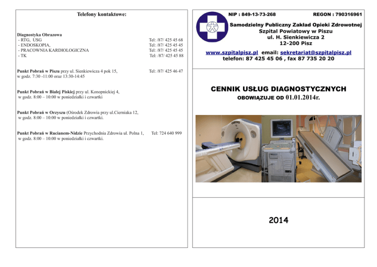 NIP : 849-13-73-268 Telefony kontaktowe: Diagnostyka Obrazowa - RTG, USG - ENDOSKOPIA, - PRACOWNIA KARDIOLOGICZNA - TK Punkt Pobrań w Piszu przy ul. Sienkiewicza 4 pok 15, w godz. 7:30 -11:00 oraz 13:30-14:45 Tel: /87/ 425 45 68 Tel: /87/ 425 45 45 Tel: /87/ 425 45 45 Tel: /87/ 425 45 88 Samodzielny Publiczny Zakład Opieki Zdrowotnej Szpital Powiatowy w Piszu ul. H. Sienkiewicza 2 12-200 Pisz www.szpitalpisz.pl email: [email protected] telefon: 87 425 45 06 , fax 87 735 20 20 Tel: /87/ 425 46 47 CENNIK USŁUG DIAGNOSTYCZNYCH OBOWIĄZUJE OD 01.01.2014r. Punkt Pobrań w Białej Piskiej przy ul. Konopnickiej 4, w godz. 8:00 – 10:00 w poniedziałki i czwartki Punkt Pobrań w Orzyszu (Ośrodek Zdrowia przy ul.Cierniaka 12, w godz. 8:00 – 10:00 w poniedziałki i czwartki. Punkt Pobrań w Rucianem-Nidzie Przychodnia Zdrowia ul. Polna 1, w godz. 8:00 – 10:00 w poniedziałki i czwartki. REGON : 790316961 Tel: 724 640 999 2014 Pracownia Diagnostyki Laboratoryjnej AlAT* Alkohol etylowy* Albuminy* Amylaza* Anty –N-DNA Anty –HBs Total AspAT* Badanie ogólne moczu* Bezwzględna eozynofilia we krwi Białko w surowicy* Białkomocz dobowy Bilirubina bezpośrednia* Bilirubina całkowita* Klirens kreatyniny Chlorki* Cholesterol całkowity CK (kinaza kreatynowa )* CRP /białko ostrej fazy* Cukier w surowicy * Cukromocz dobowy Czas i wskaźnik protrombinowy , INR* Czas kaolinowo-kefalinowy /APTT* D- Dimery* Dobowe wydalanie Ca Dobowe wydalanie P Dobowe wydalanie kreatyniny Dobowe wydalanie magnezu Dobowe wydalanie mocznika Ferrytyna Fibrynogen* Fosfataza zasadowa * Fosfor* Gazometria* GGTP* Glukoza we krwi pełnej z palca* HBsAg* LDL cholesterol HDL cholesterol HIV DUO Strona 4 8,00 zł 27,00 zł 6,00 zł 10,00 zł 16,00 zł 38,00 zł 8,00 zł 7,00 zł 5,00 zł 6,00 zł 7,00 zł 7,00 zł 7,00 zł 12,00 zł 6,00 zł 7,00 zł 8,00 zł 7,00 zł 7,00 zł 8,00 zł 7,00 zł 8,00 zł 25,00 zł 6,00 zł 7,00 zł 6,00 zł 7,00 zł 7,00 zł 25,00 zł 9,00 zł 7,00 zł 7,00 zł 17,00 zł 8,00 zł 9,00 zł 14,00 zł 9,00 zł 9,00 zł 32,00 zł Strona 1 Hormon tarczycy FT4 Hormon tarczycy FT3 Kał na jaja pasożytów i cyst lamblii Kreatynina* Krew utajona w kale* Kwas moczowy* 20,00 zł 20,00 zł 10,00 zł 6,00 zł 11,00 zł 7,00 zł LDH Profil lipidowy: cholesterol , TG, HDL, LDL Magnez* Mocznik* Mononukleoza – test jakościowy* Morfologia * OB * PMR badanie ogólne* 10,00 zł 33,00 zł 7,00 zł 7,00 zł 11,00 zł 9,00 zł 5,00 zł 20,00 zł Badanie grupy krwi Próba zgodności serologicznej Badanie grupy krwi noworodka Bezpośredni test antyglobulinowy Badanie przeciwciał Kwalifikacja do podania immunoglobuliny Anty-D Sód* Potas* Próba ciążowa w moczu-test jakościowy* Próby wątrobowe (bilirubina całkowita i bezpośrednia )* Retikulocyty* Rozmaz krwi obwodowej , leukogram* Wydzielina z nosa na eozynofile Testy jakościowe na obecność amfetaminy w moczu* Testy jakościowe na obecność extasy w moczu* Testy jakościowe na obecność kokainy w moczu* Testy jakościowe na obecność marihuany w moczu* Testy jakościowe na obecność morfiny w moczu* 6,00 zł 6,00 zł 13,00 zł 13,00 zł 7,00 zł 6,00 zł 6,00 zł 9,00 zł 9,00 zł 9,00 zł 9,00 zł 9,00 zł 24 godzinny pomiar ciśnienia tętniczego Badanie cytologiczne Badanie echokardiograficzne Badanie histopatologiczne - pobranie 3 wycinków Biopsja / USG Iniekcja domięśniowa Iniekcja dożylna KTG z opisem Pobranie wymazu + wymazówka jednorazowego użycia Pomiar ciśnienia Testy jakościowe na obecność opiatów w moczu* Testy jakościowe na obecność metamfetaminy w moczu* Testy jakościowe na obecność trójcyklicznych antydepresantów w moczu* Testy jakościowe na obecność barbituranów moczu* Testy jakościowe na obecność benzodiazepin w moczu* TPSA TIBC/UIBC Troponina I* Trójglicerydy Wapń* WR Żelazo Płyny z jam ciała* Badanie nasienia Strona 2 9,00 zł 9,00 zł 17,00 zł 17,00 zł 17,00 zł 32,00 zł 13,00 zł 20,00 zł 8,00 zł 6,00 zł 6,00 zł 7,00 zł 20,00 zł 14,00 zł CK-MB mass* Hemoglobina glikowana HbA1C Doustny test tolerancji glukozy 2-pkt. Pobieranie krwi i transport próbek do podwykonawcy Hormon przysadki TSH 50,00 zł 15,00 zł 21,00 zł 5,50 zł 16,00 zł Pracownia Serologii Transfuzjologicznej cennik 50,00 zł 30,00 zł 16,00 zł 17,00 zł 22,00 zł 25,00 zł INNE PROCEDURY DIAGNOSTYCZNE (KOMER.) 150,00 zł 17,00 zł 80,00 zł 21,00 zł 139,50 zł 6,00 zł 12,00 zł 35,00 zł 3,50 zł 5,00 zł Uwaga : Badania oznaczone * dostępne są w trybie ""na cito" z dopłatą 50 % Strona 3 NIP : 849-13-73-268 Telefony kontaktowe: Diagnostyka Obrazowa - RTG, USG - ENDOSKOPIA, - PRACOWNIA KARDIOLOGICZNA - TK Punkt Pobrań w Piszu przy ul. Sienkiewicza 4 pok 15, w godz. 7:30 -11:00 oraz 13:30-14:45 Tel: /87/ 425 45 68 Tel: /87/ 425 45 45 Tel: /87/ 425 45 45 Tel: /87/ 425 45 88 Samodzielny Publiczny Zakład Opieki Zdrowotnej Szpital Powiatowy w Piszu ul. H. Sienkiewicza 2 12-200 Pisz www.szpitalpisz.pl email: [email protected] telefon: 87 425 45 06 , fax 87 735 20 20 Tel: /87/ 425 46 47 CENNIK USŁUG DIAGNOSTYCZNYCH OBOWIĄZUJE OD 01.01.2014r. Punkt Pobrań w Białej Piskiej przy ul. Konopnickiej 4, w godz. 8:00 – 10:00 w poniedziałki i czwartki Punkt Pobrań w Orzyszu (Ośrodek Zdrowia przy ul.Cierniaka 12, w godz. 8:00 – 10:00 w poniedziałki i czwartki. Punkt Pobrań w Rucianem-Nidzie Przychodnia Zdrowia ul. Polna 1, w godz. 8:00 – 10:00 w poniedziałki i czwartki. REGON : 790316961 Tel: 724 640 999 2014 Wymaz z jamy ustnej Wymaz z kanału szyjki macicy Wymaz z napletka Wymaz z nosa Wymaz z nosa w kierunku MRSA Wymaz z odbytu Wymaz z odleżyny Wymaz z oka Wymaz z owrzodzenia Wymaz z pochwy Wymaz z przetoki Wymaz z rany Wymaz z ucha Wymaz ze skóry Badania Sanitarno-epidemiologiczne (KOMER.) Posiew sporalu A x 2 szt. Wymaz z nosa x 1 posiew Wymaz z nosa x 1 posiew Wymaz z nosa x 2 posiewy Wymaz z nosa x 3 posiewy Wymaz z powierzchni x 1 posiew Wymaz z powierzchni x 2 posiewy Wymaz z powierzchni x 2 posiewy Wyma