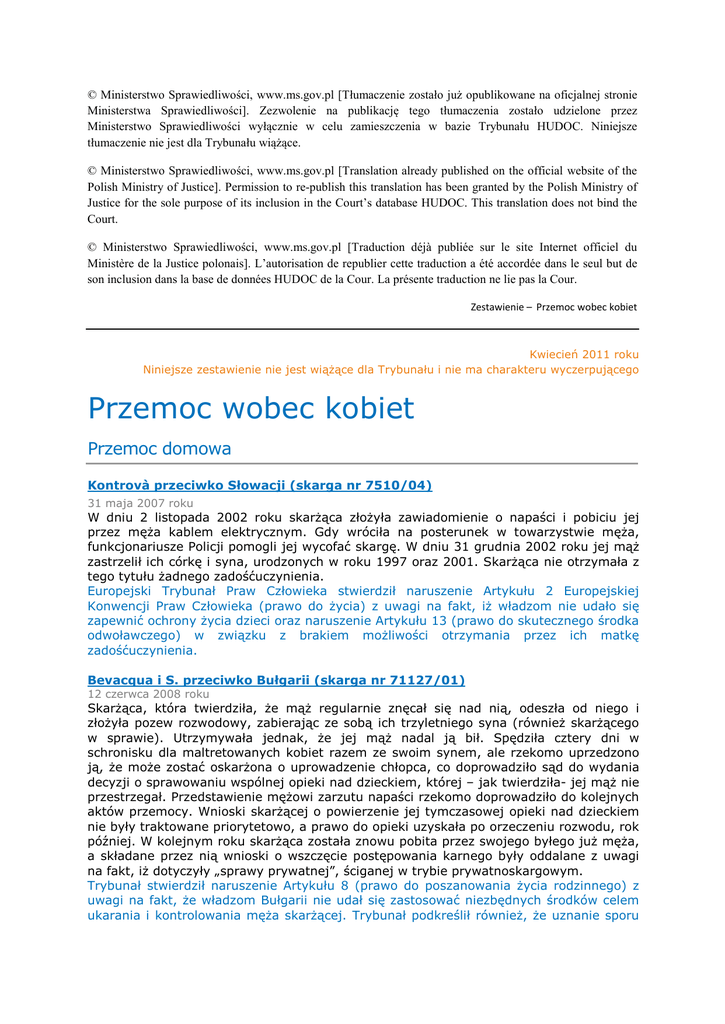 © Ministerstwo Sprawiedliwości, www.ms.gov.pl [Tłumaczenie zostało już opublikowane na oficjalnej stronie Ministerstwa Sprawiedliwości]. Zezwolenie na publikację tego tłumaczenia zostało udzielone przez Ministerstwo Sprawiedliwości wyłącznie w celu zamieszczenia w bazie Trybunału HUDOC. Niniejsze tłumaczenie nie jest dla Trybunału wiążące. © Ministerstwo Sprawiedliwości, www.ms.gov.pl [Translation already published on the official website of the Polish Ministry of Justice]. Permission to re-publish this translation has been granted by the Polish Ministry of Justice for the sole purpose of its inclusion in the Court’s database HUDOC. This translation does not bind the Court. © Ministerstwo Sprawiedliwości, www.ms.gov.pl [Traduction déjà publiée sur le site Internet officiel du Ministère de la Justice polonais]. L’autorisation de republier cette traduction a été accordée dans le seul but de son inclusion dans la base de données HUDOC de la Cour. La présente traduction ne lie pas la Cour. Zestawienie – Przemoc wobec kobiet Kwiecień 2011 roku Niniejsze zestawienie nie jest wiążące dla Trybunału i nie ma charakteru wyczerpującego Przemoc wobec kobiet Przemoc domowa Kontrovà przeciwko Słowacji (skarga nr 7510/04) 31 maja 2007 roku W dniu 2 listopada 2002 roku skarżąca złożyła zawiadomienie o napaści i pobiciu jej przez męża kablem elektrycznym. Gdy wróciła na posterunek w towarzystwie męża, funkcjonariusze Policji pomogli jej wycofać skargę. W dniu 31 grudnia 2002 roku jej mąż zastrzelił ich córkę i syna, urodzonych w roku 1997 oraz 2001. Skarżąca nie otrzymała z tego tytułu żadnego zadośćuczynienia. Europejski Trybunał Praw Człowieka stwierdził naruszenie Artykułu 2 Europejskiej Konwencji Praw Człowieka (prawo do życia) z uwagi na fakt, iż władzom nie udało się zapewnić ochrony życia dzieci oraz naruszenie Artykułu 13 (prawo do skutecznego środka odwoławczego) w związku z brakiem możliwości otrzymania przez ich matkę zadośćuczynienia. Bevacqua i S. przeciwko Bułgarii (skarga nr 71127/01) 12 czerwca 2008 roku Skarżąca, która twierdziła, że mąż regularnie znęcał się nad nią, odeszła od niego i złożyła pozew rozwodowy, zabierając ze sobą ich trzyletniego syna (również skarżącego w sprawie). Utrzymywała jednak, że jej mąż nadal ją bił. Spędziła cztery dni w schronisku dla maltretowanych kobiet razem ze swoim synem, ale rzekomo uprzedzono ją, że może zostać oskarżona o uprowadzenie chłopca, co doprowadziło sąd do wydania decyzji o sprawowaniu wspólnej opieki nad dzieckiem, której – jak twierdziła- jej mąż nie przestrzegał. Przedstawienie mężowi zarzutu napaści rzekomo doprowadziło do kolejnych aktów przemocy. Wnioski skarżącej o powierzenie jej tymczasowej opieki nad dzieckiem nie były traktowane priorytetowo, a prawo do opieki uzyskała po orzeczeniu rozwodu, rok później. W kolejnym roku skarżąca została znowu pobita przez swojego byłego już męża, a składane przez nią wnioski o wszczęcie postępowania karnego były oddalane z uwagi na fakt, iż dotyczyły „sprawy prywatnej”, ściganej w trybie prywatnoskargowym. Trybunał stwierdził naruszenie Artykułu 8 (prawo do poszanowania życia rodzinnego) z uwagi na fakt, że władzom Bułgarii nie udał się zastosować niezbędnych środków celem ukarania i kontrolowania męża skarżącej. Trybunał podkreślił również, że uznanie sporu za „sprawę prywatną” było niezgodne z obowiązkiem ochrony przez władze życia rodzinnego skarżącej. Branko Tomašić i inni przeciwko Chorwacji (skarga nr 46598/06) 15 stycznia 2009 roku Skarżący są krewnymi dziecka i jego matki, zabitych przez męża/ojca, który następnie popełnił samobójstwo miesiąc po opuszczeniu przez niego zakładu karnego, w którym przebywał z uwagi na grożenie im śmiercią. Pierwotnie wydano nakaz poddania go leczeniu psychiatrycznemu w czasie pobytu w jednostce penitencjarnej i z uwagi na taką konieczność - także po jego opuszczeniu. Sąd odwoławczy uznał jednak, że jego leczenie zakończy się w momencie zwolnienia. Trybunał stwierdził naruszenie Artykułu 2 (prawo do życia) w zakresie dotyczącym śmierci matki i dziecka: władze Chorwacji nie wykonały nakazu kontynuowania leczenia psychiatrycznego; rząd nie zdołał wykazać, że mąż został poddany jakiemukolwiek leczeniu psychiatrycznemu w zakładzie karnym, jak również nie został on przebadany psychiatrycznie przed wyjściem na wolność. Opuz przeciwko Turcji (skarga nr 33401/02) 9 czerwca 2009 roku Skarżąca oraz jej matka przez wiele lat były ofiarami napaści i gróźb ze strony męża skarżącej, H.O., wielokrotnie doznały one obrażeń zagrażających ich życiu. Poza jednym wyjątkiem, nie był on ścigany sądownie, ponieważ obie kobiety wycofywały zarzuty, pomimo wyjaśnień, że H.O. zmusił je do tego grożąc im śmiercią. Następnie zadał swojej żonie siedem ran kłutych za co został ukarany grzywną w wysokości około 385 euro, płatną w ratach. Obie kobiety złożyły liczne skargi, wskazując, że ich życie było w niebezpieczeństwie. H.O. był przesłuchiwany i zwolniany. Wreszcie kiedy obie kobiety próbowały się wyprowadzić, H.O. zastrzelił teściową twierdząc, że wyprowadzka żony groziła mu utratą honoru. Został uznany za winnego morderstwa i skazany na karę dożywotniego pozbawienia wolności. Został jednak zwolniony w toku postępowania apelacyjnego, po czym, jak twierdzi jego żona, nadal kierował groźby pod jej adresem. Trybunał stwierdził naruszenie Artykułu 2 (prawo do życia) w zakresie zabójstwa teściowej H.O. oraz naruszenie Artykułu 3 (zakaz nieludzkiego i poniżającego traktowania), ponieważ Państwo-Strona nie zdołało ochronić jego żony. Turcji nie udało się stworzyć i wprowadzić w życie sytemu mającego na celu karanie przemocy domowej i ochronę ofiar. Wł