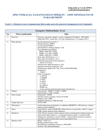 Zał cznik nr 1A do SIWZ AZP/20/ZP/SJO/D/2012 SPECYFIKACJA ZAMAWIANEGO SPRZ TU – OPIS MINIMALNYCH PARAMETRÓW Cz I – Dostawa wraz z transportem fabrycznie nowych zestawów komputerowych i laptopów Komputer Multimedialny 22 szt. Lp. Nazwa podzespołu Opis 1. Procesor Procesor powinien osi ga w te cie wydajno ci PassMark - CPU Mark High End CPUs wynik min. 3214 pkt (aktualizacja z 14 sierpnia 2012 ) 2. Płyta główna 3. Pami 4. Dysk twardy 5. Nap d optyczny Liczba gniazd procesorów: 1 Rodzaj pami ci: DDR3 Liczba gniazd DDR3: 2 Dwukanałowa obsługa pami ci: Tak Typ obsługiwanej pami ci: -DDR3-1066 (PC3-8500) - DDR3-1333 (PC3-10600) -DDR3-1600 (PC3-12800) Ilo zł cz PCI-Express x1 : 2 Ilo zł cz PCI-Express x16: 1 Standard kontrolera (liczba kanałów): - Serial ATA II (6) Wbudowany układ d wi kowy: Tak Zintegrowana karta graficzna: Tak Wbudowany układ LAN: Tak, LAN 10/100/1000 Mb/s Kontrolery: -USB2.0 Porty zewn trzne: -1x DVI-D -1x HDMI -1x PS/2 -1x RJ45 -1x VGA -8x USB2.0 -SPDIF out -zestaw gniazd wej cia/wyj cia karty d wi kowej Typ pami ci: DDR3-1333(PC3-10600) Ilo pami ci: 4 GB (1x4GB) Pojemno : 320GB Interfejs dysku twardego: Serial ATA/300 Pami cache: 8MB Pr dko obrotowa: 5400 obr./min. DVD+/-RW 6. Klawiatura 7. Mysz 8. Obudowa 9. Monitor LCD polska klawiatura programisty (w układzie QWERTY), 105 klawiszy, ciemny matowy kolor obudowy przewodowa, optyczna 800 DPI, 3klawiszowa (w tym jeden „wheel”), zł cze USB, ciemny matowy kolor obudowy ATX, Prosty wystrój, ciemny matowy kolor, przedni panel umiejscowiony na górze lub rodku obudowy, z wej ciem/wyj ciem audio i 2 portami USB, obsługa bez rubokr ta, zasilacz 400W z wył cznikiem odci cia zasilania i zabezpieczeniem termicznym i przeciwprzepi ciowym Ekran: LCD 21.5’’ Rodzaj pod wietlenia: LED Rozdzielczo nominalna (matrycy): 1920x1080 Jasno : 250 cd/m2(minimum) str. 1 9. System operacyjny/oprogramowanie K ty widoczno ci obrazu: 170 stopni(poziom)/160 stopni(pion) – warto minimalna Czas reakcji matrycy: 5ms(maksymalnie) Gło niki: Tak, 1,5 W x2 Interfejsy: -cyfrowy(DVI) -analogowy(D-Sub) Uwagi: - w zestawie przewody: DVI, VGA, zasilaj cy - niezale nie od gwarancji producenta, w momencie dostawy monitor nie mo e posiada ani jednego uszkodzonego punktu wietlnego (zarówno „ciemnego", jak i jasnego") MS Windows 7 Professional dla celów edukacyjnych lub równowa ny MS Office 2010 Standard w ramach licencji MOLP AE 10. Uwagi 11. Gwarancja Gło no jednostki (zestawu) mierzona zgodnie z norm ISO 9296 < 37dB, nie dotyczy hałasu emitowanego przez nap dy CD/DVD Min. 2 lata (cały zestaw) 12. Kod CPV 30213300-8 Laptop 17,3’’ 2szt. Lp. Nazwa podzespołu Opis 1. Procesor Procesor powinien osi ga w te cie wydajno ci PassMark - CPU Mark High End CPUs wynik min. 6786 pkt (aktualizacja z 14 sierpnia 2012 ) 2. Karta graficzna Karta graficzna powinna osi ga w te cie wydajno ci PassMark - Videocard Mark High End Video Cards wynik min. 1004 pkt (aktualizacja z 14 sierpnia 2012 ) 3. Pami Typ pami ci: DDR3(1333MHz) Ilo pami ci: 8 GB 4. Dysk twardy Pojemno 5. Nap d DVD combo Blu-ray ROM + DVD+/-RW DL 6. Ekran LCD 7. Wyj cia karty graficznej 8. Interfejsy 9. Komunikacja 10. Typ akumulatora 11. Waga(netto) Przek tna ekranu: 17.3 cali Technologia: HD z pod wietleniem LED Typ ekranu: matowy (non-glare) Nominalna rozdzielczo : 1920 x 1080 pikseli Mini Display Port HDMI eSata / USB 2x USB 3.0 1x USB WiFi IEEE 802.11b/g/n LAN 1 Gbps Bluetooth Litowo-jonowy 9-komorowy Nie wi cej ni 3,5 kg 12. Gwarancja Min. 2 lata 13. Dodatkowe Wbudowany mikrofon Kamera 2.0 Mpix tuner TV cyfrowy (DVB-T) Czytnik kart pami ci: -xD -SDXC -SDHC -SD - MS-Pro - MMC - Memory Stick Torba: wymagana w zestawie lub osobno, czarna, dopasowana do wielko ci wyposa enie/funkcjonalno min. 750 GB str. 2 14. System operacyjny/oprogramowanie 15. Kod CPV laptopa MS Windows 7 Professional MS Office 2010 Professional Plus w ramach licencji MOLP AE 30213100-6 Laptop 15,6’’ 1 szt. Lp. Nazwa podzespołu Opis 1. Procesor Procesor powinien osi ga w te cie wydajno ci PassMark - CPU Mark High End CPUs wynik min. 3449pkt (aktualizacja z 14 sierpnia 2012 ) 2. Karta graficzna Karta graficzna powinna osi ga w te cie wydajno ci PassMark - Videocard Mark High End Video Cards wynik min. 645 pkt (aktualizacja z 14 sierpnia 2012 ) 3. Pami 4. Dysk twardy 5. Nap d DVD Typ pami ci: DDR3(1333MHz) Ilo pami ci: 4 GB Pojemno : 500 GB Interfejs: Serial ATA, 5400 RPM DVD+/-RW DL 6. Ekran LCD 7. Wyj cia karty graficznej 8. Interfejsy 9. Komunikacja 10. Typ akumulatora 11. Waga(netto) WiFi IEEE 802.11b/g/n LAN 1 Gbps Bluetooth Litowo-jonowy 6-komorowy Nie wi cej ni 3 kg 12. Gwarancja Min. 2 lata 13. Dodatkowe wyposa enie/funkcjonalno 14. System operacyjny/oprogramowanie Kod CPV Kamera 1.3 Mpix Czytnik kart pami ci: -SD -SDHC -MMC -MS-Pro -Memory Stick Torba: wymagana w zestawie lub osobno, czarna, dopasowana do wielko ci laptopa MS Windows 7 Home Premium MS Office 2010 Standard w ramach licencji MOLP AE 30213100-6 15. Przek tna ekranu: 15,6 cali Pod wietlanie: LED Nominalna rozdzielczo : 1366 x 768 pikseli Typ ekranu: błyszcz cy (glare) D-Sub HDMI 2x USB 3.0 Komputer Multimedialny – All-In-One 2 szt. Lp. Nazwa podzespołu Opis 1. Procesor Procesor powinien osi ga w te cie wydajno ci PassMark - CPU Mark High End CPUs wynik min. 3863 pkt (aktualizacja z 14 sierpnia 2012 ) 2. Płyta główna Liczba gniazd procesorów: 1 Rodzaj pami ci: DDR3 Liczba gniazd DDR3: 2 Standard kontrolera : - Serial ATA II Wbudowany układ d wi kowy: Tak Zintegrowana karta graficzna: Tak Wbudowany układ LAN: Tak, LAN 10/100/1000 Mb/s Wbudowany układ WLAN: Tak, IEEE 802.11b/g/n Kontrolery: str. 3 3. Pami 4. Dysk twardy -USB2.0 -USB3.0 Porty zewn trzne: -1x RJ45 -4x USB2.0 -2x USB3.0 -zestaw gniazd wej cia/wyj cia karty d wi kowej Typ pami ci: DDR3-1333(PC3-10600) Ilo pami ci: 4 GB Pojemno : 500GB 5. Nap d optyczny DVD±RW Super Multi (+ DVD-RAM) Dual Layer 6. Klawiatura 7. Mysz Polska klawiatura programisty (w układzi