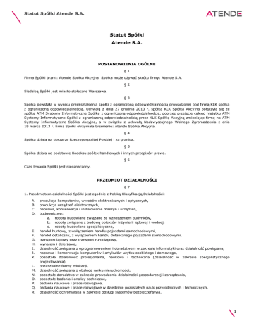 Statut Spółki Atende S.A. Statut Spółki Atende S.A. POSTANOWIENIA OGÓLNE §1 Firma Spółki brzmi: Atende Spółka Akcyjna. Spółka może używać skrótu firmy: Atende S.A. §2 Siedzibą Spółki jest miasto stołeczne Warszawa. §3 Spółka powstała w wyniku przekształcenia spółki z ograniczoną odpowiedzialnością prowadzonej pod firmą KLK spółka z ograniczoną odpowiedzialnością. Uchwałą z dnia 27 grudnia 2010 r. spółka KLK Spółka Akcyjna połączyła się ze spółką ATM Systemy Informatyczne Spółka z ograniczoną odpowiedzialnością, poprzez przejęcie całego majątku ATM Systemy Informatyczne Spółki z ograniczoną odpowiedzialnością przez KLK Spółkę Akcyjną zmieniając firmę na ATM Systemy Informatyczne Spółka Akcyjna, a w związku z uchwałą Nadzwyczajnego Walnego Zgromadzenia z dnia 19 marca 2013 r. firma Spółki otrzymała brzmienie: Atende Spółka Akcyjna. §4 Spółka działa na obszarze Rzeczypospolitej Polskiej i za granicą. §5 Spółka działa na podstawie Kodeksu spółek handlowych i innych przepisów prawa. §6 Czas trwania Spółki jest nieoznaczony. PRZEDMIOT DZIAŁALNOŚCI §7 1. Przedmiotem działalności Spółki jest zgodnie z Polską Klasyfikacją Działalności: A. B. C. D. E. F. G. H. I. J. K. L. M. N. O. P. Q. R. produkcja komputerów, wyrobów elektronicznych i optycznych, produkcja urządzeń elektrycznych, naprawa, konserwacja i instalowanie maszyn i urządzeń, budownictwo: a. roboty budowlane związane ze wznoszeniem budynków, b. roboty związane z budową obiektów inżynierii lądowej i wodnej, c. roboty budowlane specjalistyczne, handel hurtowy, z wyłączeniem handlu pojazdami samochodowymi, handel detaliczny, z wyłączeniem handlu detalicznego pojazdami samochodowymi, transport lądowy oraz transport rurociągowy, wynajem i dzierżawa, działalność związana z oprogramowaniem i doradztwem w zakresie informatyki oraz działalność powiązana, naprawa i konserwacja komputerów i artykułów użytku osobistego i domowego, pozostała działalność profesjonalna, naukowa i techniczna (działalność w zakresie specjalistycznego projektowania), pozaszkolne formy edukacji, działalność związana z obsługą rynku nieruchomości, pozostałe doradztwo w zakresie prowadzenia działalności gospodarczej i zarządzania, pozostałe badania i analizy techniczne, badania naukowe i prace rozwojowe, badania naukowe i prace rozwojowe w dziedzinie pozostałych nauk przyrodniczych i technicznych, działalność ochroniarska w zakresie obsługi systemów bezpieczeństwa. 1 Statut Spółki Atende S.A. 2. Jeśli niektóre rodzaje działalności wymagałyby odpowiedniego zezwolenia, działalność taka zostanie podjęta dopiero po otrzymaniu odpowiednich zezwoleń. §8 Spółka może zakładać i być wspólnikiem lub akcjonariuszem spółek krajowych i zagranicznych oraz może uczestniczyć w krajowych i zagranicznych organizacjach gospodarczych. KAPITAŁ WŁASNY §9 1. Kapitał zakładowy Spółki wynosi 7.268.668,80 zł (siedem milionów dwieście sześćdziesiąt osiem tysięcy sześćset sześćdziesiąt osiem 80/100 złotych) i dzieli się na 36.343.344 (trzydzieści sześć milionów trzysta czterdzieści trzy tysiące trzysta czterdzieści cztery) akcji o wartości nominalnej 0,20 zł (słownie: dwadzieścia groszy) każda, w tym: A. B. C. D. 1.524.000 (jeden milion pięćset dwadzieścia cztery tysiące) akcji zwykłych na okaziciela serii „A”, o numerach od 1 (jeden) do 1.524.000 (jeden milion pięćset dwadzieścia cztery tysiące), 1.143.000 (jeden milion sto czterdzieści trzy tysiące) akcji zwykłych na okaziciela serii B, o numerach od 1 (jeden) do 1.143.000 (jeden milion sto czterdzieści trzy tysiące), 2.266.865 (dwa miliony dwieście sześćdziesiąt sześć tysięcy osiemset sześćdziesiąt pięć) akcji zwykłych na okaziciela serii C, o numerach od 1 (jeden) do 2.266.865 (dwa miliony dwieście sześćdziesiąt sześć tysięcy osiemset sześćdziesiąt pięć), 31.409.479 (trzydzieści jeden milionów czterysta dziewięć tysięcy czterysta siedemdziesiąt dziewięć) akcji zwykłych na okaziciela serii D o numerach od 1 (jeden) do 31.409.479 (trzydzieści jeden milionów czterysta dziewięć tysięcy czterysta siedemdziesiąt dziewięć). 2. Akcje emisji serii „A”, „B” i „C” i „ D” zostały w całości opłacone. 3. Kapitał zakładowy może być podwyższony uchwałą Walnego Zgromadzenia w drodze emisji nowych akcji lub podwyższenia wartości nominalnej dotychczasowych akcji. Walne Zgromadzenie może również podwyższyć kapitał zakładowy przeznaczając na to środki z kapitału zapasowego lub z innych kapitałów rezerwowych utworzonych z zysku, jeżeli mogą one być użyte na ten cel. 4. Akcje Spółki mogą być akcjami imiennymi lub akcjami na okaziciela. Na żądanie akcjonariusza akcje imienne podlegają zamianie na akcje na okaziciela. Akcje na okaziciela nie podlegają zamianie na akcje imienne. 5. Akcje mogą być umorzone w drodze ich nabycia przez Spółkę przy zachowaniu przepisów o obniżeniu kapitału zakładowego. Szczegółowe warunki umorzenia, w szczególności podstawę prawną umorzenia, wysokość wynagrodzenia przysługującego akcjonariuszowi akcji umorzonych, bądź uzasadnienie umorzenia akcji bez wynagrodzenia oraz sposób obniżenia kapitału zakładowego określi uchwała Walnego Zgromadzenia. W zamian za akcje umorzone Spółka może wydawać świadectwa użytkowe. 6. W przypadku zaistnienia okoliczności uzasadniających umorzenie akcji, wartość akcji zostanie ustalona według następujących zasad: A. B. C. jeżeli uchwała o umorzeniu akcji zapadnie w pierwszej połowie roku obrotowego, wówczas podstawą do ustalenia wartości akcji będzie bilans Spółki za ostatni rok obrotowy; jeżeli uchwała o umorzeniu akcji zapadnie w drugiej połowie roku obrotowego, wówczas podstawą ustalenia wartości akcji będzie odrębny bilans sporząd