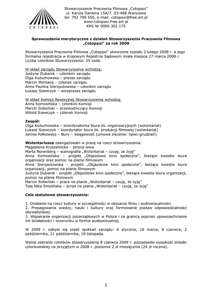 Stowarzyszenie Pracownia Filmowa „Cotopaxi” ul. Karola Darwina 15A/7, 03-488 Warszawa tel. 792 799 550, e-mail: [email protected] www.cotopaxi.free.art.pl KRS Nr 0000 302 175 Sprawozdanie merytoryczne z działań Stowarzyszenia Pracownia Filmowa „Cotopaxi” za rok 2009 Stowarzyszenie Pracownia Filmowa „Cotopaxi” utworzone zostało 2 lutego 2008 r. a jego formalna rejestracja w Krajowym Rejestrze Sądowym miała miejsce 27 marca 2008 r. Liczba członków Stowarzyszenia: 25 osób. W skład zarządu Stowarzyszenia wchodzą: Justyna Dubanik – członkini zarządu Olga Kożuchowska – prezes zarządu Marcin Montana – członek zarządu Anna Paulina Sierzputowska – członkini zarządu Łukasz Szewczyk – wiceprezes zarządu W skład Komisji Rewizyjnej Stowarzyszenia wchodzą: Anna Komosińska – członkini Komisji Marcin Sidwiński – przewodniczący Komisji Witold Szewczyk – członek Komisji Zespół: Olga Kożuchowska – koordynatorka biura ds. organizacyjnych (wolontariat) Łukasz Szewczyk – koordynator biura ds. produkcji filmowej (wolontariat) Janina Polkowska – Bury – księgowość (umowa zlecenie: lipiec-grudzień) Wolontariusze zaangażowani w pracę na rzecz stowarzyszenia: Magdalena Kruszelnicka – strona www Marta Norenberg – scenografia „Wolontariat – czuję, że żyję” Anna Komosińska – projekt „Objazdowe kino społeczne”, bieżące kwestie biura organizacji oraz pomoc na planie filmowym Anna Sierzputowska - projekt „Objazdowe kino społeczne”, bieżące kwestie biura organizacji, pomoc na planie filmowym Justyna Dubanik - projekt „Objazdowe kino społeczne”, bieżące kwestie biura organizacji, pomoc na planie filmowym Marcin Sidwiński – praca na planie „Wolontariat – czuję, że żyję” Tola Nika Smolińska – script na planie „Wolontariat – czuję, że żyję” Cele statutowe stowarzyszenia: 1. Działanie na rzecz kultury w szczególności w obszarze filmu i audiowizualności. 2. Propagowanie wiedzy, nauki i kultury oraz formowanie postaw odpowiedzialności obywatelskiej. 3. Wspieranie organizacji pozarządowych w Polsce i za granicą poprzez upowszechnianie ich działalności i wizerunku w formie audiowizualnej. W 2009 r. odbyło się sześć spotkań zarządu: 6 stycznia, 16 marca, 8 czerwca, 2 października, 21 października, 18 listopada. Walne zebranie członków stowarzyszenia 8 czerwca 2009 r. pozostawiło wysokość składki członkowskiej na przyjętym w 2008 r. poziomie 2 zł miesięcznie (24 zł rocznie). 1 Stowarzyszenie Pracownia Filmowa „Cotopaxi” ul. Karola Darwina 15A/7, 03-488 Warszawa tel. 792 799 550, e-mail: [email protected] www.cotopaxi.free.art.pl KRS Nr 0000 302 175 GŁÓ WN E O BSZA RY DZIA ŁA Ń : W roku 2008 większość podejmowanych przez stowarzyszenie działań to działania związane z produkcją filmową: W czerwcu 2009 r. Stowarzyszenie Pracownia Filmowa „Cotopaxi” otrzymało dofinansowanie z Ministerstwa Pracy i Polityki Społecznej w ramach Programu Operacyjnego Fundusz Inicjatyw Obywatelskich 2009 na realizację projektu „Objazdowe kino społeczne”. W ramach projektu zorganizowanych zostało 8 spotkań dotyczących wolontariatu. Wszystkie spotkania odbyły się w województwie lubuskim, ogólnie wzięło w nich udział 160 osób. W pierwszym etapie projektu nakręcona została krótka etiuda filmowa "Wolontariat czuję, że żyję", której tematyka porusza kwestie związane z działaniami wolontarystycznymi. Drugi etap projektu to przeprowadzenie ośmiu spotkań ze społecznościami lokalnymi województwa lubuskiego. Wszystkie współorganizowane były z lokalnymi organizacjami pozarządowymi i instytucjami: Ośrodkami Pomocy Społecznej oraz Ośrodkami Kultury. Celem spotkań było uświadomienie lokalnym środowiskom roli działań wolontarystycznych, ich wpływu na tworzenie solidnych więzi między ludźmi i partnerskich relacji między instytucjami. To także upowszechnianie takich wartości jak solidarność, szacunek dla innych, wspólnota, troska o dobro wspólne. Wybór województwa lubuskiego na miejsce działań oraz mieszkańców tego województwa na docelowych odbiorców nie był przypadkowy. Ostatnie badania dotyczące wolontariatu wskazują, iż w zachodniej Polsce drastycznie spadł odsetek liczy osób zaangażowanych w działania wolontarystyczne. W ramach projektu powstał Raport (http://www.cotopaxi.free.art.pl/Raport_Wolontariat_lubuskie.pdf) dotyczący opinii osób uczestniczących w spotkaniach o wolontariacie. Spotkania odbyły się w Zbąszynku, Żaganiu, Szlichtyngowej, Trzebiszewie, Międzyrzeczu, Słubicach, Wschowie i Zielonej Górze. Spotkania organizowane były we współpracy z: Centrum Wspierania Aktywności Lokalnej, Fundacją ODZEW z Leszna, Centrum Wolontariatu przy CARITAS w Zielonej Górze, oraz Parafialnymi Zespołami CARITAS w Żaganiu, Trzebiszewie i Międzyrzeczu, Fundacją na rzecz Collegium Polonicum w Słubicach, Ośrodkiem Pomocy Społecznej i Klubem Seniora ze Wschowy, Ośrodkiem Pomocy Społecznej w Zbąszynku i Ośrodkiem Pomocy Społecznej w Szlichtyngowej. Patronat nad spotkaniami objęły: Stowarzyszenie Centrum Wolontariatu i portal kampaniespoleczne.pl. Koordynatorką projektu była Olga Kożuchowska. W ramach projektu zatrudniona została księgowa, osoby techniczne pracujące na planie filmowym oraz osoby prowadzące spotkania w lubuskim (umowy cywilno – prawne); Zakupiony w ramach wyżej wymienionego projektu został laptop oraz stworzony został banner internetowy stowarzyszenia. SZKOLENIA 8 kwietnia 2009 r. we współpracy ze Stowarzyszeniem Trenerów Organizacji Pozarządowych STOP odbyło się szkolenie skierowane do członków i członkiń oraz sympatyków stowarzyszenia dotyczące prawa autorskiego w sztuce i produkcji filmowej. Prowadził je absolwent VIII edycji Szkoły Trenerów STOP, Jarosław Greser. WSPÓŁPRACA W 2009 r. Stowarzyszenie Pracownia Filmowa „Cotopaxi” kilkukrotnie współpra
