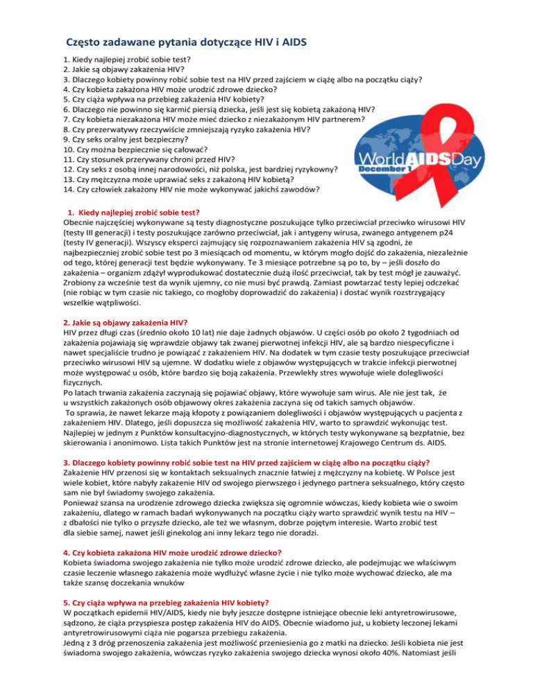 Często zadawane pytania dotyczące HIV i AIDS 1. Kiedy najlepiej zrobić sobie test? 2. Jakie są objawy zakażenia HIV? 3. Dlaczego kobiety powinny robić sobie test na HIV przed zajściem w ciążę albo na początku ciąży? 4. Czy kobieta zakażona HIV może urodzić zdrowe dziecko? 5. Czy ciąża wpływa na przebieg zakażenia HIV kobiety? 6. Dlaczego nie powinno się karmić piersią dziecka, jeśli jest się kobietą zakażoną HIV? 7. Czy kobieta niezakażona HIV może mieć dziecko z niezakażonym HIV partnerem? 8. Czy prezerwatywy rzeczywiście zmniejszają ryzyko zakażenia HIV? 9. Czy seks oralny jest bezpieczny? 10. Czy można bezpiecznie się całować? 11. Czy stosunek przerywany chroni przed HIV? 12. Czy seks z osobą innej narodowości, niż polska, jest bardziej ryzykowny? 13. Czy mężczyzna może uprawiać seks z zakażoną HIV kobietą? 14. Czy człowiek zakażony HIV nie może wykonywać jakichś zawodów? 1. Kiedy najlepiej zrobić sobie test? Obecnie najczęściej wykonywane są testy diagnostyczne poszukujące tylko przeciwciał przeciwko wirusowi HIV (testy III generacji) i testy poszukujące zarówno przeciwciał, jak i antygeny wirusa, zwanego antygenem p24 (testy IV generacji). Wszyscy eksperci zajmujący się rozpoznawaniem zakażenia HIV są zgodni, że najbezpieczniej zrobić sobie test po 3 miesiącach od momentu, w którym mogło dojść do zakażenia, niezależnie od tego, której generacji test będzie wykonywany. Te 3 miesiące potrzebne są po to, by – jeśli doszło do zakażenia – organizm zdążył wyprodukować dostatecznie dużą ilość przeciwciał, tak by test mógł je zauważyć. Zrobiony za wcześnie test da wynik ujemny, co nie musi być prawdą. Zamiast powtarzać testy lepiej odczekać (nie robiąc w tym czasie nic takiego, co mogłoby doprowadzić do zakażenia) i dostać wynik rozstrzygający wszelkie wątpliwości. 2. Jakie są objawy zakażenia HIV? HIV przez długi czas (średnio około 10 lat) nie daje żadnych objawów. U części osób po około 2 tygodniach od zakażenia pojawiają się wprawdzie objawy tak zwanej pierwotnej infekcji HIV, ale są bardzo niespecyficzne i nawet specjaliście trudno je powiązać z zakażeniem HIV. Na dodatek w tym czasie testy poszukujące przeciwciał przeciwko wirusowi HIV są ujemne. W dodatku wiele z objawów występujących w trakcie infekcji pierwotnej może występować u osób, które bardzo się boją zakażenia. Przewlekły stres wywołuje wiele dolegliwości fizycznych. Po latach trwania zakażenia zaczynają się pojawiać objawy, które wywołuje sam wirus. Ale nie jest tak, że u wszystkich zakażonych osób objawowy okres zakażenia zaczyna się od takich samych objawów. To sprawia, że nawet lekarze mają kłopoty z powiązaniem dolegliwości i objawów występujących u pacjenta z zakażeniem HIV. Dlatego, jeśli dopuszcza się możliwość zakażenia HIV, warto to sprawdzić wykonując test. Najlepiej w jednym z Punktów konsultacyjno-diagnostycznych, w których testy wykonywane są bezpłatnie, bez skierowania i anonimowo. Lista takich Punktów jest na stronie internetowej Krajowego Centrum ds. AIDS. 3. Dlaczego kobiety powinny robić sobie test na HIV przed zajściem w ciążę albo na początku ciąży? Zakażenie HIV przenosi się w kontaktach seksualnych znacznie łatwiej z mężczyzny na kobietę. W Polsce jest wiele kobiet, które nabyły zakażenie HIV od swojego pierwszego i jedynego partnera seksualnego, który często sam nie był świadomy swojego zakażenia. Ponieważ szansa na urodzenie zdrowego dziecka zwiększa się ogromnie wówczas, kiedy kobieta wie o swoim zakażeniu, dlatego w ramach badań wykonywanych na początku ciąży warto sprawdzić wynik testu na HIV – z dbałości nie tylko o przyszłe dziecko, ale też we własnym, dobrze pojętym interesie. Warto zrobić test dla siebie samej, nawet jeśli ginekolog ani inny lekarz tego nie doradzi. 4. Czy kobieta zakażona HIV może urodzić zdrowe dziecko? Kobieta świadoma swojego zakażenia nie tylko może urodzić zdrowe dziecko, ale podejmując we właściwym czasie leczenie własnego zakażenia może wydłużyć własne życie i nie tylko może wychować dziecko, ale ma także szansę doczekania wnuków 5. Czy ciąża wpływa na przebieg zakażenia HIV kobiety? W początkach epidemii HIV/AIDS, kiedy nie były jeszcze dostępne istniejące obecnie leki antyretrowirusowe, sądzono, że ciąża przyspiesza postęp zakażenia HIV do AIDS. Obecnie wiadomo już, u kobiety leczonej lekami antyretrowirusowymi ciąża nie pogarsza przebiegu zakażenia. Jedną z 3 dróg przenoszenia zakażenia jest możliwość przeniesienia go z matki na dziecko. Jeśli kobieta nie jest świadoma swojego zakażenia, wówczas ryzyko zakażenia swojego dziecka wynosi około 40%. Natomiast jeśli kobieta dowie się o swoim zakażeniu planując ciążę lub będąc na jej początku, będzie pozostawać w czasie ciąży pod opieką ginekologa, ciąż nie pogorszy przebiegu zakażenia. Nawet wielokrotne ciąże zakażonych HIV kobiet nie przyspieszają postępu zakażenia HIV. Warunkiem jest dokładne stosowanie się do zaleceń związanych z przyjmowaniem leków antyretrowirusowych. 6. Dlaczego nie powinno się karmić piersią dziecka, jeśli jest się kobietą zakażoną HIV? Wirus znajduje się w mleku kobiecym, a przewód pokarmowy noworodka jest wrażliwy na zakażenie HIV. Ponieważ ryzyko zakażenia dziecka przez kobietę nieświadomą zakażenia wynosi około 40%, więc nie powinno się dopuszczać dodatkowego ryzyka zakażenia. 7. Czy kobieta niezakażona HIV może mieć dziecko z zakażonym HIV partnerem? Od wielu lat już wiadomo, że same plemniki nie przenoszą wirusa HIV. Wirus znajduje się w innych komórkach znajdujących się w nasieniu i w płynie nasiennym. Znane są już metody oddzielania plemników od reszty nasienia. Podanie tak przygotowanych plemników nie powoduje zakażenia kobiety, a co za tym idzie 