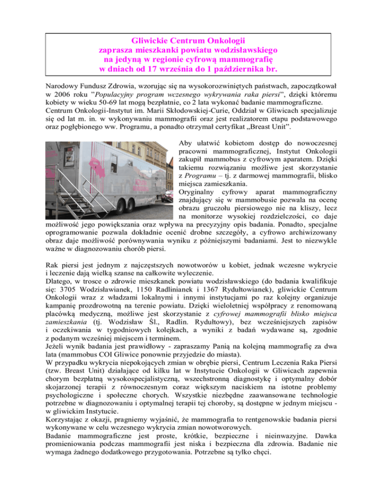 Gliwickie Centrum Onkologii zaprasza mieszkanki powiatu wodzisławskiego na jedyną w regionie cyfrową mammografię w dniach od 17 września do 1 października br. Narodowy Fundusz Zdrowia, wzorując się na wysokorozwiniętych państwach, zapoczątkował w 2006 roku ”Populacyjny program wczesnego wykrywania raka piersi”, dzięki któremu kobiety w wieku 50-69 lat mogą bezpłatnie, co 2 lata wykonać badanie mammograficzne. Centrum Onkologii-Instytut im. Marii Skłodowskiej-Curie, Oddział w Gliwicach specjalizuje się od lat m. in. w wykonywaniu mammografii oraz jest realizatorem etapu podstawowego oraz pogłębionego ww. Programu, a ponadto otrzymał certyfikat „Breast Unit”. Aby ułatwić kobietom dostęp do nowoczesnej pracowni mammograficznej, Instytut Onkologii zakupił mammobus z cyfrowym aparatem. Dzięki takiemu rozwiązaniu możliwe jest skorzystanie z Programu – tj. z darmowej mammografii, blisko miejsca zamieszkania. Oryginalny cyfrowy aparat mammograficzny znajdujący się w mammobusie pozwala na ocenę obrazu gruczołu piersiowego nie na kliszy, lecz na monitorze wysokiej rozdzielczości, co daje możliwość jego powiększania oraz wpływa na precyzyjny opis badania. Ponadto, specjalne oprogramowanie pozwala dokładnie ocenić drobne szczegóły, a cyfrowo archiwizowany obraz daje możliwość porównywania wyniku z późniejszymi badaniami. Jest to niezwykle ważne w diagnozowaniu chorób piersi. Rak piersi jest jednym z najczęstszych nowotworów u kobiet, jednak wczesne wykrycie i leczenie dają wielką szanse na całkowite wyleczenie. Dlatego, w trosce o zdrowie mieszkanek powiatu wodzisławskiego (do badania kwalifikuje się: 3705 Wodzisławianek, 1150 Radlinianek i 1367 Rydułtowianek), gliwickie Centrum Onkologii wraz z władzami lokalnymi i innymi instytucjami po raz kolejny organizuje kampanię prozdrowotną na terenie powiatu. Dzięki wieloletniej współpracy z renomowaną placówką medyczną, możliwe jest skorzystanie z cyfrowej mammografii blisko miejsca zamieszkania (tj. Wodzisław Śl., Radlin. Rydułtowy), bez wcześniejszych zapisów i oczekiwania w tygodniowych kolejkach, a wyniki z badań wydawane są, zgodnie z podanym wcześniej miejscem i terminem. Jeżeli wynik badania jest prawidłowy - zapraszamy Panią na kolejną mammografię za dwa lata (mammobus COI Gliwice ponownie przyjedzie do miasta). W przypadku wykrycia niepokojących zmian w obrębie piersi, Centrum Leczenia Raka Piersi (tzw. Breast Unit) działające od kilku lat w Instytucie Onkologii w Gliwicach zapewnia chorym bezpłatną wysokospecjalistyczną, wszechstronną diagnostykę i optymalny dobór skojarzonej terapii z równoczesnym coraz większym naciskiem na istotne problemy psychologiczne i społeczne chorych. Wszystkie niezbędne zaawansowane technologie potrzebne w diagnozowaniu i optymalnej terapii tej choroby, są dostępne w jednym miejscu w gliwickim Instytucie. Korzystając z okazji, pragniemy wyjaśnić, że mammografia to rentgenowskie badania piersi wykonywane w celu wczesnego wykrycia zmian nowotworowych. Badanie mammograficzne jest proste, krótkie, bezpieczne i nieinwazyjne. Dawka promieniowania podczas mammografii jest niska i bezpieczna dla zdrowia. Badanie nie wymaga żadnego dodatkowego przygotowania. Potrzebne są tylko chęci. Szczegóły dt. wykonania badania: Przed badaniem. Do mammografii nie trzeba się specjalnie przygotowywać. W mammobusie zapewnione są komfortowe warunki porównywalne do nowoczesnych placówek stacjonarnych tj. rejestrację, przebieralnię oraz gabinet, w którym wykonywana jest mammografia. Wszystkie pomieszczenia są klimatyzowane i ogrzewane. Ponieważ konieczne będzie rozebranie się od pasa w górę, warto odpowiednio wygodnie się ubrać. W sytuacji, gdy mammografia wykonywana jest po raz kolejny, prosimy zabrać ze sobą zdjęcie i opis poprzedniego badania dla porównania to bardzo pomaga lekarzom zinterpretować wynik. Przebieg badania w mammobusie. 1) Rejestracja - po przyjściu do pracowni należy przedstawić dowód osobisty. Na miejscu należy wypełnić ankietę, dlatego osoby z wadą wzroku powinny pamiętać o zabraniu okularów. Oczywiście, jeżeli będzie jakiś problem rejestratorka we wszystkim Pani pomoże. 2) Badanie - technik (kobieta) poprosi o rozebranie się w przebieralni. Wszystkie pomieszczenia w mammobusie są klimatyzowane. Zdjęcia rentgenowskie każdej piersi zostaną wykonane metodą cyfrową w dwóch podstawowych projekcjach. Podczas badania pacjentka pozostaje w pozycji stojącej lub siedzącej. Badana pierś zostanie uciśnięta plastikową płytą kompresyjną. Uciskowi, trwającemu kilka sekund, może towarzyszyć ból, który warto wytrzymać. Ucisk jest konieczny, aby uzyskać zdjęcie dobrej jakości, a tylko dobra jakość pozwoli na dokładny opis badania. 3) Wynik - Każda Pani otrzyma karteczkę z numerem badania oraz informacją o terminie i miejscu odbioru wyniku. Prosimy zachować karteczkę, będzie potrzebna przy odbiorze wyniku. Jeżeli wynik badania jest prawidłowy - zapraszamy na kolejną mammografię za dwa lata. W przypadku, gdy wynik wzbudzi wątpliwości lekarzy, skierują oni pacjentkę na bezpłatną dalszą diagnostykę, a jeśli okaże się to konieczne - na leczenie. W imieniu organizatorów, tj.: Urzędów Miast Wodzisław Śląski, Radlin, Rydułtowy, Wodzisławskiego Centrum Kultury, Miejskiego Ośrodka Kultury w Radlinie, ING Usługi Finansowe S.A./oddział Rybnik oraz własnym - IO Gliwice, już dziś serdecznie zapraszamy Panie w wieku od 50 do 69 lat (tj. z roczników: 1944-1963), które nigdy nie miały wykonanej mammografii refundowanej przez NFZ oraz te, którym upłynęły 2 lata od poprzedniego badania, na jedyne w powiecie cyfrowe bezpłatne badania mammograficzne. Badania wykonywane będą w mammobusie gliwickiego Centrum Onkologii wg poniższego planu: WODZISŁAW ŚL. - CENTRUM KULTURY (parking od strony ul. 26 Marca) 17 WRZEŚNIA (wtorek) w godz.: