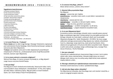 BIERZMOWANIE 2014 - POMOCNIK Zagadnienia katechizmowe: a) Dziesięć przykazań Bożych b) Pięć przykazań kościelnych c) Dwa przykazania miłości, d) Pięć warunków sakramentu pokuty e) Siedem sakramentów świętych f) Siedem grzechów głównych, g) Siedem darów Ducha Świętego, h) Sześć prawd wiary, i) Tajemnice Różańca św., j) Skład Apostolski, k) Cztery cnoty główne, l) Najważniejsze modlitwy, m) Grzechy cudze, n) Grzechy przeciwko Duchowi Świętemu, o) Grzechy wołające o pomstę do nieba, p) Uczynki miłosierdzia - wobec duszy i ciała, q) Różaniec - jak odmawiać, r) Koronka do Bożego miłosierdzia - jak odmawiać. 1. Co to jest Pismo św. i Tradycja? Pismo święte jest to zbiór ksiąg Starego i Nowego Testamentu napisanych pod natchnieniem Ducha Świętego, które Kościół przechowuje i podaje do wierzenia jako Boże Objawienie. Tradycja czyli podanie ustne jest to zbiór objawionych prawd Bożych niespisanych w Piśmie św., przekazywanych przez Urząd Nauczycielski Kościoła; stanowi część Objawienia. 2. Co to znaczy wierzyć w znaczeniu religijnym? Wierzyć Panu Bogu, to znaczy uznawać za prawdę to, co Bóg objawił i czego naucza nas przez Kościół Święty. 3. Kim jest Bóg? Pan Bóg jest to Duch nieskończenie doskonały, Stworzyciel nieba i ziemi, czyli wszystkich rzeczy widzialnych i niewidzialnych. To Pan, Król, Sędzia, ale także dobry i miłosierny Ojciec. Bóg jest jeden w trzech Osobach: Ojciec, Syn i Duch Święty (Trójca Przenajświętsza). 4. Co oznacza imię Boga „Jahwe”? Słowo Jahwe oznacza „Jestem, który Jestem”. 5. Wymień kilka przymiotów Boga Pan Bóg jest : wieczny – zawsze był, jest i będzie, wszechmocny – wszystko może czynić, co jest dobre i wewnętrznie niesprzeczne, niezmienny – zawsze jest ten sam, najmądrzejszy — wszystko co robi jest mądre i dobre, święty — złego nie chce, grzechem się brzydzi, najsprawiedliwszy — za dobre wynagradza i za złe karze, najmiłosierniejszy — pragnie zbawienia wszystkich ludzi. 6. Co to jest Objawienie Boże? Za pomocą rozumu naturalnego człowiek może w sposób pewny poznać Boga na podstawie Jego dzieł. Istnieje jednak inny porządek poznania, do którego człowiek nie może dojść o własnych siłach; jest to porządek Objawienia Bożego (Por. Sobór Watykański I: DS 3015). Na mocy swego całkowicie wolnego postanowienia Bóg objawia się i udziela człowiekowi. Czyni to, objawiając swoją tajemnicę, swój zamysł życzliwości, który odwiecznie przygotował w Chrystusie dla dobra wszystkich ludzi. Objawia w pełni swój zamysł, posyłając swego umiłowanego Syna, naszego Pana Jezusa Chrystusa, i Ducha Świętego. 7. Kim jest człowiek? Człowiek jest najdoskonalszym stworzeniem Boga na ziemi. Jest to jedna całość ciała i duszy nieśmiertelnej. Człowiek dzięki duszy ma rozum i dlatego myśli, tworzy oraz ma wolną wolę, dzięki której może wybierać między dobrem a złem. 8. Dlaczego człowiek jest najdoskonalszym stworzeniem na ziemi? Ponieważ został stworzony na obraz i podobieństwo Boga. 9. Jaki jest plan Boga wobec człowieka? Pan Bóg stworzył człowieka, aby Pana Boga znał, czcił, kochał i służył Mu, a przez to osiągnął szczęście wieczne. 10. Co nazywamy grzechem pierworodnym? To grzech pierwszych rodziców, który dziedziczymy od swoich rodziców 11. Co to znaczy, że Pismo św. jest natchnione? Pismo święte jest natchnione ponieważ pierwszorzędnym autorem Pisma Świętego jest Duch Święty, a drugorzędnym — ludzie przez Ducha Świętego natchnieni. 12. Co daje człowiekowi czytanie i rozważanie Pisma św.? Pogłębia nasz kontakt z Bogiem i daje konkretne wskazania do życia. Pismo święte jest listem Boga do człowieka. 13. Z ilu ksiąg składa się Pismo św.? Pismo Święte składa się z 46 ksiąg Starego Testamentu oraz 27 ksiąg Nowego Testamentu. Razem 73 księgi. 14. Wymień Ewangelistów. Mateusz, Marek, Łukasz i Jan. 15. Dlaczego grzech jest największym nieszczęściem człowieka? Grzech ciężki powoduje utratę łaski uświęcającej, a po śmierci karę wieczną. Grzech lekki nie powoduje utraty łaski uświęcającej, lecz pozbawia człowieka wielu łask uczynkowych, sprowadza kary w czyśćcu i przygłusza głos sumienia. 16. Co jest źródłem grzechu? Źródłami grzechu są: szatan, nasze złe skłonności po grzechu pierworodnym i złe otoczenie. 17. Co to jest nałóg? Nałóg jest to stała skłonność do popełniania tych samych grzechów, przyzwyczajenie się do zła. 18. Dlaczego Jezusa nazywamy Zbawicielem? Ponieważ Jezus Chrystus jest Synem Bożym, który stał się człowiekiem dla naszego zbawienia. Przez swoją śmierć i zmartwychwstanie zbawił nasze dusze, stał się dla nas drogą do nieba. 19. Kto jest Ojcem i Matką Jezusa? Ojcem Pana Jezusa jest Bóg Ojciec; Matką — Najświętsza Maryja Pana; Opiekunem — św. Józef. 20. Co to jest niebo? Niebo jest to stan, w którym sprawiedliwi, którzy albo nie grzeszyli, albo za grzechy swoje w zupełności odpokutowali, oglądają Boga, w którym aniołowie i święci cieszą się wiecznym szczęściem. 21. Co to jest piekło? Piekło jest to stan wiecznej kary dla grzeszników, którzy w ciężkich grzechach bez pokuty odeszli z tego świata. 22. Co to jest czyściec? Stan, w którym sprawiedliwi, zanim wejdą do nieba, oczyszczają się z grzechów powszednich, albo ponoszą karę za te grzechy, których na ziemi jeszcze całkowicie nie odpokutowali. 23. Jaka jest różnica między grzechem śmiertelnym a lekkim? Człowiek popełnia grzech ciężki (śmiertelny), gdy świadomie i dobrowolnie, w ważnej sprawie przekracza przykazanie Boże lub kościelne. Grzech lekki (raniący) polega na tym, że człowiek przekracza przykazanie Boże lub kościelne w rzeczy mniej ważnej albo przekraczając je w rzeczy ważnej czyni to niezupełnie świadomie lub niezupełnie dobrowolnie. 24. Kim jest Jezus Chrystus? Jezu