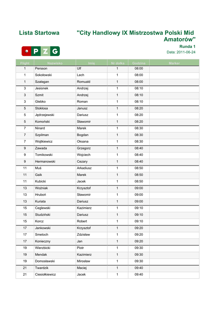 Lista Startowa ''City Handlowy IX Mistrzostwa Polski Mid Amatorów'' Runda 1 Data: 2011-06-24 Flight Nazwisko ImiĊ Nr doáka Godzina 1 Persson Ulf 1 08:00 1 Sokoáowski Lech 1 08:00 1 Szaáagan Romuald 1 08:00 3 Jesionek Andrzej 1 08:10 3 Szmit Andrzej 1 08:10 3 Glebko Roman 1 08:10 5 Stokáosa Janusz 1 08:20 5 JĊdrzejewski Dariusz 1 08:20 5 KomoĔski Sáawomir 1 08:20 7 Ninard Marek 1 08:30 7 Szpilman Bogdan 1 08:30 7 Wojtkiewicz Oksana 1 08:30 9 Zawada Grzegorz 1 08:40 9 Tomikowski Wojciech 1 08:40 9 Hermanowski Cezary 1 08:40 11 MuĞ Arkadiusz 1 08:50 11 Gaik Marek 1 08:50 11 Kubicki Jacek 1 08:50 13 WoĨniak Krzysztof 1 09:00 13 HruboĔ Sáawomir 1 09:00 13 Kuriata Dariusz 1 09:00 15 Ceglewski Kazimierz 1 09:10 15 StudziĔski Dariusz 1 09:10 15 Korcz Robert 1 09:10 17 Jankowski Krzysztof 1 09:20 17 Smetoch Zdzisáaw 1 09:20 17 Konieczny Jan 1 09:20 19 Wierzbicki Piotr 1 09:30 19 Mendak Kazimierz 1 09:30 19 Domosáawski Mirosáaw 1 09:30 21 Twardzik Maciej 1 09:40 21 Ciesioákiewicz Jacek 1 09:40 Marker Flight Nr doáka Godzina 21 Wójcik Nazwisko Mirosáaw ImiĊ 1 09:40 23 Goetz Piotr 1 09:50 23 àuczycki Arkadiusz 1 09:50 23 àazowski Krzysztof 1 09:50 25 Onichowski Tomasz 1 10:00 25 BanaĞkiewicz Sáawomir 1 10:00 25 Liszewski Jacek 1 10:00 27 Hermanowska Urszula 1 12:30 27 Korecki Dariusz 1 12:30 27 Lubka Zbigniew 1 12:30 29 Goáda Krzysztof 1 12:40 29 Kiruja Ernest 1 12:40 29 Smolnicki Wáodzimierz 1 12:40 31 Mleczak Krzysztof 1 12:50 31 RegliĔski Andrzej 1 12:50 31 OrliĔski Mariusz 1 12:50 33 Kubiak Robert 1 13:00 33 Szpilman Marzena 1 13:00 33 Park Jaseph 1 13:00 35 Niewiadomski Lech 1 13:10 35 Safianowski Marek 1 13:10 35 Pankiewicz Leszek 1 13:10 Marker Lista Startowa ''City Handlowy IX Mistrzostwa Polski Mid Amatorów'' Runda 1 Data: 2011-06-24 Flight Nazwisko ImiĊ Nr doáka Godzina 2 Carey William 10 08:00 2 Parkinson David 10 08:00 2 Kasprowicz Michaá 10 08:00 4 PoniĪ Michaá 10 08:10 4 Koss Dariusz 10 08:10 4 StaĔczak Wáodzimierz 10 08:10 6 Wojnowski Mikoáaj 10 08:20 6 Hyland Timothy 10 08:20 6 Studniarek Piotr 10 08:20 8 Gradecki Krzysztof 10 08:30 8 Odzimek Maciej 10 08:30 8 Grzesiak Witold 10 08:30 10 Grunt Marek 10 08:40 10 Sikora Janusz 10 08:40 10 KoĞcikiewicz Dariusz 10 08:40 12 BobiĔski Dariusz 10 08:50 12 Fernezy Damian 10 08:50 12 Niewczas Leszek 10 08:50 14 Sykulski Jacek Bogusáaw 10 09:00 14 Magda Kazimierz 10 09:00 14 Guz Adam 10 09:00 16 Smalarz Wiesáaw 10 09:10 16 Dymecki Dariusz 10 09:10 16 Harris Scott Jefferson 10 09:10 18 Mondalski Piotr 10 09:20 18 Sowa Marek 10 09:20 18 Szwoch Wáadysáaw 10 09:20 20 Mazur Paweá 10 09:30 20 Rogalski Piotr 10 09:30 20 Sobiesiak Marcin 10 09:30 22 Mikoáajczak Marek 10 09:40 22 Walas Ryszard 10 09:40 Marker Flight Nr doáka Godzina 22 Jarząbek Nazwisko Marek ImiĊ 10 09:40 24 Bokuniewicz Marek 10 09:50 24 Franka Paweá 10 09:50 24 Geritz Ewa 10 09:50 26 Geritz Krzysztof 10 10:00 26 Wiatr Rhea 10 10:00 26 Niemirowicz Robert 10 10:00 28 Kotynia Janusz 10 12:30 28 Czachowicz Jan 10 12:30 28 Rottau Henryk 10 12:30 30 Chmielewski Bronisáaw 10 12:40 30 Cheámikowski Piotr 10 12:40 30 Wiktor BoĪydar 10 12:40 32 Zambrzycki Rafaá 10 12:50 32 Tylman Rafaá 10 12:50 32 Brózda Jarosáaw 10 12:50 34 Mach Gunther 10 13:00 34 Wolschendorf-àazowska ElĪbieta 10 13:00 34 Gradecka Marzena 10 13:00 36 Paádyna Hanna 10 13:10 36 Gniazdowski Marcin 10 13:10 Marker