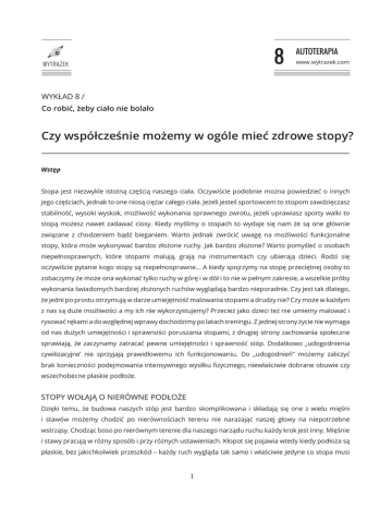 8 WYTRĄŻEK AUTOTERAPIA www.wytrazek.com WYKŁAD 8 / Co robić, żeby ciało nie bolało Czy współcześnie możemy w ogóle mieć zdrowe stopy? Wstęp Stopa jest niezwykle istotną częścią naszego ciała. Oczywiście podobnie można powiedzieć o innych jego częściach, jednak to one niosą ciężar całego ciała. Jeżeli jesteś sportowcem to stopom zawdzięczasz stabilność, wysoki wyskok, możliwość wykonania sprawnego zwrotu, jeżeli uprawiasz sporty walki to stopą możesz nawet zadawać ciosy. Kiedy myślimy o stopach to wydaje się nam że są one głównie związane z chodzeniem bądź bieganiem. Warto jednak zwrócić uwagę na możliwości funkcjonalne stopy, która może wykonywać bardzo złożone ruchy. Jak bardzo złożone? Warto pomyśleć o osobach niepełnosprawnych, które stopami malują, grają na instrumentach czy ubierają dzieci. Rodzi się oczywiście pytanie kogo stopy są niepełnosprawne… A kiedy spojrzymy na stopę przeciętnej osoby to zobaczymy że może ona wykonać tylko ruchy w górę i w dół i to nie w pełnym zakresie, a wszelkie próby wykonania świadomych bardziej złożonych ruchów wyglądają bardzo nieporadnie. Czy jest tak dlatego, że jedni po prostu otrzymują w darze umiejętność malowania stopami a drudzy nie? Czy może w każdym z nas są duże możliwości a my ich nie wykorzystujemy? Przecież jako dzieci też nie umiemy malować i rysować rękami a do względnej wprawy dochodzimy po latach treningu. Z jednej strony życie nie wymaga od nas dużych umiejętności i sprawności poruszania stopami, z drugiej strony zachowania społeczne sprawiają, że zaczynamy zatracać pewne umiejętności i sprawność stóp. Dodatkowo „udogodnienia cywilizacyjne’ nie sprzyjają prawidłowemu ich funkcjonowaniu. Do „udogodnień” możemy zaliczyć brak konieczności podejmowania intensywnego wysiłku fizycznego, niewłaściwie dobrane obuwie czy wszechobecne płaskie podłoże. STOPY WOŁAJĄ O NIERÓWNE PODŁOŻE Dzięki temu, że budowa naszych stóp jest bardzo skomplikowana i składają się one z wielu mięśni i stawów możemy chodzić po nierównościach terenu nie narażając naszej głowy na niepotrzebne wstrząsy. Chodząc boso po nierównym terenie dla naszego narządu ruchu każdy krok jest inny. Mięśnie i stawy pracują w różny sposób i przy różnych ustawieniach. Kłopot się pojawia wtedy kiedy podłoża są płaskie, bez jakichkolwiek przeszkód – każdy ruch wygląda tak samo i właściwie jedyne co stopa musi 1 WYKŁAD 8 / Co robić, żeby ciało nie bolało umieć to lekkie zgięcie do góry i niewielkie na dół. Jest to wariant optymistyczny dla osób starszych i niepełnosprawnych jednak dla narządu ruchu przeciętnej osoby jest to znak, że nie trzeba za wiele pracować. Teoretycznie mniej się męczymy, ale czy nasze ciało to lubi? Jak wiemy w przypadku zdrowia, droga na skróty często prowadzi donikąd. Drugą kwestią jest noszenie obuwia, bądź jak kto woli, bardzo często – „skórzanych trumien”, które sprawiają, że stopa nie musi wypełniać zadań do których w naturze byłaby zmuszona. Współczesna stopa ma pod sobą twardą podeszwę, często o zmniejszonej powierzchni i nie musi reagować na nierówności podłoża (jeżeli już to bardzo rzadko). Buty, nawet te „zdrowotne” często nie są dopasowane do stopy, lecz nakazują jej dopasowanie się do kształtu zaproponowanego przez projektanta. Co ciekawe w niektórych książkach związanych z tematyką stóp można znaleźć informacje o tym, że przednia część stopy powinna mieć odpowiednio dużo miejsca w bucie, lecz gdy się natrafia nawet na te „zdrowotne” to ich czubek jest zwężany „nakazując” palcom przytulenie się do siebie. Większość butów zarówno męskich jak i damskich jest z przodu zwężana uniemożliwiając poruszanie palcami. Czy aby stopa w czasie kontaktu z podłożem nie powinna się rozszerzać, żeby zapewnić jak największy kontakt z podłożem aby pole podparcia było jak największe? Niestety przechadzając się po sklepach obuwniczych niezwykle trudno jest natrafić na obuwie, które ma szerokie przody. Nawet obuwie sportowe ustawia paluch w lekkim przywiedzeniu (odchyleniu w kierunku drugiego palca). Zaczynają się pojawiać buty sportowe dostosowane do kształtu stopy produkowane przez takie koncerny jak Nike czy Reebok, jednak niestety na razie są to produkty niszowe. Chyba musimy poczekać na kilku sławnych sportowców, którzy zaczną nosić buty dające swobodę palcom. Mam nadzieję, że wtedy dzięki sile takich koncernów zaczniemy zmieniać swoje poglądy estetyczne na temat kształtu obuwia. NA CO ZWRACAĆ UWAGĘ KUPUJĄCY BUTY? Dobry but powinien umożliwiać stopie prawidłowe funkcjonowanie, czyli takie do którego stopa została stworzona. But nie powinien ograniczać ruchów stóp, nie mówiąc już o ich ściskaniu. Ważną kwestią jest utrzymywanie stopy w pozycji neutralnej, czyli takiej jak by na nodze nic nie było. Otóż sprawa nie jest wcale taka prosta. Obserwując sklepy obuwnicze i ludzi kupujących obuwie można zauważyć, że niemalże nie ma obuwia (także męskiego), które umożliwiałoby utrzymanie dużego palucha bądź pozostałych palców w pozycji neutralnej. Większość butów po wewnętrznej stronie ma „ścięty” bok co powoduje, że paluch utrzymywany jest w pozycji przywiedzenia. Być może jest to ładne, być może projektanci obuwia spełniają w ten sposób swoje marzenia i realizują swoje wyobrażenia o pięknie, jednak dla stóp jest to rzecz straszna. Powoduje, że mięsień odwodziciel palucha nie ma możliwości pełnienia swojej funkcji a stopa nie jest prawidłowo obciążana. U osób z haluksem mięsień ten jest już całkowicie nieaktywny. 2 WYKŁAD 8 / Co robić, żeby ciało nie bolało Inną ważną kwestią jest sztywność podeszwy i brak możliwości wykonywania stopą ruchów zgięcia w stawach śródsto
