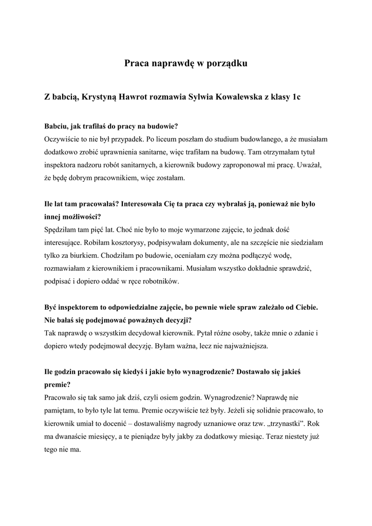 Praca naprawdę w porządku Z babcią, Krystyną Hawrot rozmawia Sylwia Kowalewska z klasy 1c Babciu, jak trafiłaś do pracy na budowie? Oczywiście to nie był przypadek. Po liceum poszłam do studium budowlanego, a że musiałam dodatkowo zrobić uprawnienia sanitarne, więc trafiłam na budowę. Tam otrzymałam tytuł inspektora nadzoru robót sanitarnych, a kierownik budowy zaproponował mi pracę. Uważał, że będę dobrym pracownikiem, więc zostałam. Ile lat tam pracowałaś? Interesowała Cię ta praca czy wybrałaś ją, ponieważ nie było innej możliwości? Spędziłam tam pięć lat. Choć nie było to moje wymarzone zajęcie, to jednak dość interesujące. Robiłam kosztorysy, podpisywałam dokumenty, ale na szczęście nie siedziałam tylko za biurkiem. Chodziłam po budowie, oceniałam czy można podłączyć wodę, rozmawiałam z kierownikiem i pracownikami. Musiałam wszystko dokładnie sprawdzić, podpisać i dopiero oddać w ręce robotników. Być inspektorem to odpowiedzialne zajęcie, bo pewnie wiele spraw zależało od Ciebie. Nie bałaś się podejmować poważnych decyzji? Tak naprawdę o wszystkim decydował kierownik. Pytał różne osoby, także mnie o zdanie i dopiero wtedy podejmował decyzję. Byłam ważna, lecz nie najważniejsza. Ile godzin pracowało się kiedyś i jakie było wynagrodzenie? Dostawało się jakieś premie? Pracowało się tak samo jak dziś, czyli osiem godzin. Wynagrodzenie? Naprawdę nie pamiętam, to było tyle lat temu. Premie oczywiście też były. Jeżeli się solidnie pracowało, to kierownik umiał to docenić – dostawaliśmy nagrody uznaniowe oraz tzw. „trzynastki”. Rok ma dwanaście miesięcy, a te pieniądze były jakby za dodatkowy miesiąc. Teraz niestety już tego nie ma. Masz bardzo silną osobowość, która na pewno przydała się w tym trudnym zajęciu. Czy mężczyźni, z którymi pracowałaś słuchali Cię i szanowali? Owszem, mam silny charakter, ale nie musiałam z niego wówczas korzystać. Każdy miał swoje obowiązki, swoje zajęcia i nie można było się wygłupiać. Zawsze miałam dobry kontakt z kolegami z pracy, nigdy nie zdarzyło się, że któryś mnie nie szanował. A dziadek? Nie miał nic przeciwko, to była tylko moja praca. Czy z perspektywy czasu wybrałabyś inną pracę? Niczego nie żałuję. Miałam coś do powiedzenia, spokojnie utrzymywałam się z pensji. To była praca naprawdę w porządku.