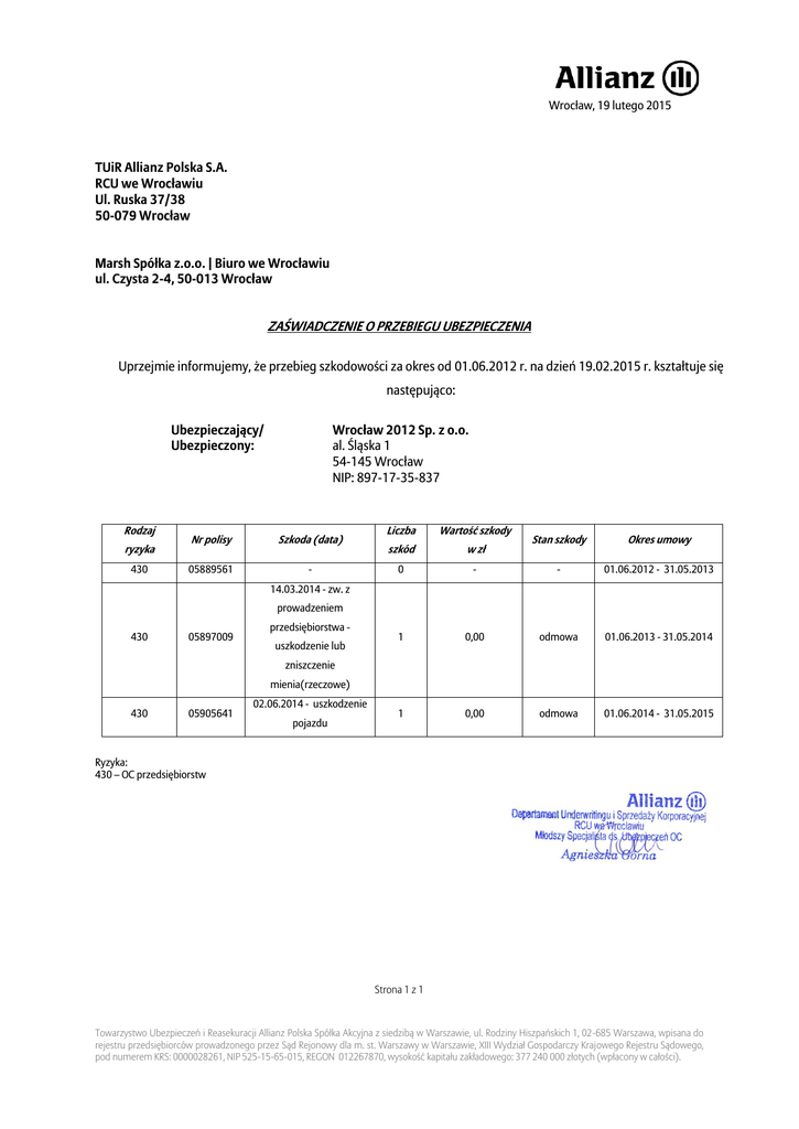 Wrocław, 19 lutego 2015 TUiR Allianz Polska S.A. RCU we Wrocławiu Ul. Ruska 37/38 50-079 Wrocław Marsh Spółka z.o.o. | Biuro we Wrocławiu ul. Czysta 2-4, 50-013 Wrocław ZAŚWIADCZENIE O PRZEBIEGU UBEZPIECZENIA Uprzejmie informujemy, że przebieg szkodowości za okres od 01.06.2012 r. na dzień 19.02.2015 r. kształtuje się następująco: Ubezpieczający/ Ubezpieczony: Rodzaj ryzyka 430 Wrocław 2012 Sp. z o.o. al. Śląska 1 54-145 Wrocław NIP: 897-17-35-837 Nr polisy Szkoda (data) 05889561 - Liczba Wartość szkody szkód w zł 0 Stan szkody Okres umowy - - 01.06.2012 - 31.05.2013 1 0,00 odmowa 01.06.2013 - 31.05.2014 1 0,00 odmowa 01.06.2014 - 31.05.2015 14.03.2014 - zw. z prowadzeniem 430 05897009 przedsiębiorstwa uszkodzenie lub zniszczenie mienia(rzeczowe) 430 05905641 02.06.2014 - uszkodzenie pojazdu Ryzyka: 430 – OC przedsiębiorstw Strona 1 z 1 Towarzystwo Ubezpieczeń i Reasekuracji Allianz Polska Spółka Akcyjna z siedzibą w Warszawie, ul. Rodziny Hiszpańskich 1, 02-685 Warszawa, wpisana do rejestru przedsiębiorców prowadzonego przez Sąd Rejonowy dla m. st. Warszawy w Warszawie, XIII Wydział Gospodarczy Krajowego Rejestru Sądowego, pod numerem KRS: 0000028261, NIP 525-15-65-015, REGON 012267870, wysokość kapitału zakładowego: 377 240 000 złotych (wpłacony w całości).