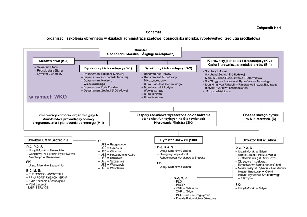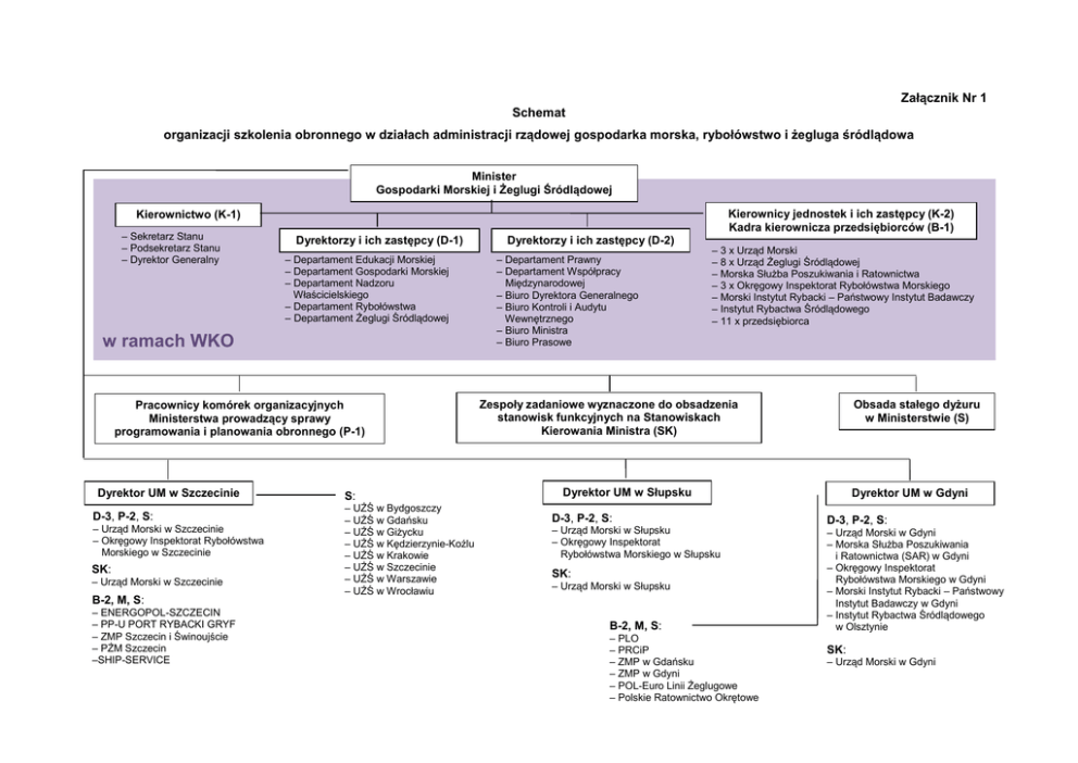 Załącznik Nr 1 Schemat organizacji szkolenia obronnego w działach administracji rządowej gospodarka morska, rybołówstwo i żegluga śródlądowa Minister Gospodarki Morskiej i Żeglugi Śródlądowej Kierownicy jednostek i ich zastępcy (K-2) Kadra kierownicza przedsiębiorców (B-1) Kierownictwo (K-1) – Sekretarz Stanu – Podsekretarz Stanu – Dyrektor Generalny Dyrektorzy i ich zastępcy (D-1) – Departament Edukacji Morskiej – Departament Gospodarki Morskiej – Departament Nadzoru Właścicielskiego – Departament Rybołówstwa – Departament Żeglugi Śródlądowej w ramach WKO Pracownicy komórek organizacyjnych Ministerstwa prowadzący sprawy programowania i planowania obronnego (P-1) Dyrektor UM w Szczecinie D-3, P-2, S: – Urząd Morski w Szczecinie – Okręgowy Inspektorat Rybołówstwa Morskiego w Szczecinie SK: – Urząd Morski w Szczecinie B-2, M, S: – ENERGOPOL-SZCZECIN – PP-U PORT RYBACKI GRYF – ZMP Szczecin i Świnoujście – PŻM Szczecin –SHIP-SERVICE S: – UŻŚ w Bydgoszczy – UŻŚ w Gdańsku – UŻŚ w Giżycku – UŻŚ w Kędzierzynie-Koźlu – UŻŚ w Krakowie – UŻŚ w Szczecinie – UŻŚ w Warszawie – UŻŚ w Wrocławiu Dyrektorzy i ich zastępcy (D-2) – Departament Prawny – Departament Współpracy Międzynarodowej – Biuro Dyrektora Generalnego – Biuro Kontroli i Audytu Wewnętrznego – Biuro Ministra – Biuro Prasowe – 3 x Urząd Morski – 8 x Urząd Żeglugi Śródlądowej – Morska Służba Poszukiwania i Ratownictwa – 3 x Okręgowy Inspektorat Rybołówstwa Morskiego – Morski Instytut Rybacki – Państwowy Instytut Badawczy – Instytut Rybactwa Śródlądowego – 11 x przedsiębiorca Zespoły zadaniowe wyznaczone do obsadzenia stanowisk funkcyjnych na Stanowiskach Kierowania Ministra (SK) Obsada stałego dyżuru w Ministerstwie (S) Dyrektor UM w Słupsku D-3, P-2, S: – Urząd Morski w Słupsku – Okręgowy Inspektorat Rybołówstwa Morskiego w Słupsku SK: – Urząd Morski w Słupsku B-2, M, S: – PLO – PRCiP – ZMP w Gdańsku – ZMP w Gdyni – POL-Euro Linii Żeglugowe – Polskie Ratownictwo Okrętowe Dyrektor UM w Gdyni D-3, P-2, S: – Urząd Morski w Gdyni – Morska Służba Poszukiwania i Ratownictwa (SAR) w Gdyni – Okręgowy Inspektorat Rybołówstwa Morskiego w Gdyni – Morski Instytut Rybacki – Państwowy Instytut Badawczy w Gdyni – Instytut Rybactwa Śródlądowego w Olsztynie SK: – Urząd Morski w Gdyni Załącznik Nr 2 „WZÓR” ………………………………………………………….. (nazwa organu/jednostki organizacyjnej/przedsiębiorcy) ………………………………………………………….. (nazwa komórki organizacyjnej wykonującej program) ZATWIERDZAM ……………………………………… organ/kierownik jednostki/przedsiębiorca ……………………………………… data, imię i nazwisko PROGRAM SZKOLENIA OBRONNEGO ………………………………………………………………. (nazwa jednostki organizacyjnej/przedsiębiorcy) NA LATA 2016 – 2021 OPRACOWAŁ ….……………………… (stanowisko) ….……………………… (data, imię i nazwisko) Rok CZĘŚĆ I – Opisowa 1. Podstawa prawna opracowania programu szkolenia obronnego: § 8 pkt 2 rozporządzenia Rady Ministrów z dnia 8 października 2015 r. w sprawie szkolenia obronnego (Dz. U. poz. 1829). 2. Dokumenty odniesienia: 1) akty prawne regulujące specyfikę problematyki przygotowań obronnych w działach administracji rządowej gospodarka morska, rybołówstwo oraz żegluga śródlądowa; 2) akty prawne wydane przez Ministra Gospodarki Morskiej i Żeglugi Śródlądowej oraz inne dokumenty stanowiące o warunkach, trybie i sposobie realizacji przygotowań obronnych w działach administracji rządowej gospodarka morska, rybołówstwo oraz żegluga śródlądowa; 3) inne publikacje. 3. Zakładane cele szkolenia na lata 2016-2021. Głównym celem szkolenia obronnego w …………………………………………………………………………………………………………………….......... (należy określić dział administracji rządowej, jednostkę/przedsiębiorcę) w latach 2016-2021 będzie przygotowanie kierowniczej kadry oraz zespołów zadaniowych ……………………………………………………………………, (należy określić organ/ jednostkę/przedsiębiorcę) np. „do działania w sytuacji podwyższania gotowości obronnej państwa oraz utrzymanie poziomu wiedzy i umiejętności wymaganych przy realizacji zadań obronnych zawartych w planach operacyjnych funkcjonowania …”. Cel szkolenia zamierza się osiągnąć etapowo poprzez realizację celów pośrednich realizowanych w latach: 2016: ……………………………………. 2017: ……………………………………. 2018: ……………………………………. 2019: ……………………………………. 2020: ……………………………………. 2021: ……………………………………. 4. Wykaz grup szkoleniowych (należy określić grupy szkoleniowe, organizatorów i koordynatorów szkolenia obronnego). CZĘŚĆ II – Przedsięwzięcia szkoleniowe 1. Ramowy program szkolenia na lata 2016-2021. Ramowy program szkolenia na lata 2016-2021 opracowano na podstawie: 1) w Ministerstwie – załączników do Wytycznych Ministra Obrony Narodowej dla ministrów i wojewodów do szkolenia obronnego w latach 20152020, tj.: a) planu ćwiczeń międzynarodowych, krajowych i regionalnych w latach 2015-2020, b) wykazu przedsięwzięć szkoleniowych Sił Zbrojnych RP na lata 2015-2020, w których przewiduje się udział przedstawicieli pozamilitarnych struktur obronnych państwa; 2) w jednostkach/u przedsiębiorcy – wyciągu z Programu szkolenia obronnego w działach administracji rządowej gospodarka morska, rybołówstwo oraz żegluga śródlądowa na lata 2016-2021. Lp. Nazwa przedsięwzięcia Ogólny chara