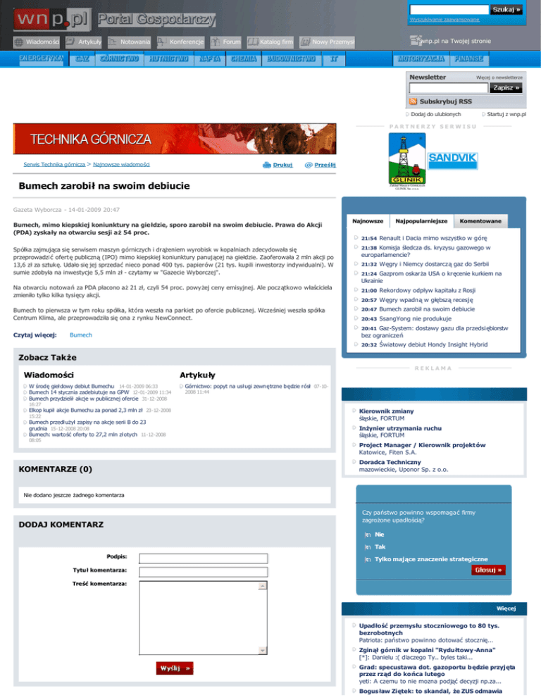 rPortal G Gaz Energetyka Praca Finanse Motoryzacja Logistyka IT Budownictwo Chemia Nafta Hutnictwo nictwo Gospodarczy ó Wyszukiwanie zaawansowane Wiadomości Artykuły Notowania Konferencje Forum Katalog firm wnp.pl na Twojej stronie Nowy Przemysł Newsletter Więcej o newsletterze Subskrybuj RSS Dodaj do ulubionych Startuj z wnp.pl PARTNERZY SERWISU Serwis Technika górnicza Najnowsze wiadomości Drukuj Prześlij Bumech zarobił na swoim debiucie Gazeta Wyborcza - 14-01-2009 20:47 Bumech, mimo kiepskiej koniunktury na giełdzie, sporo zarobił na swoim debiucie. Prawa do Akcji (PDA) zyskały na otwarciu sesji aż 54 proc. Najnowsze 21:54 Spółka zajmująca się serwisem maszyn górniczych i drążeniem wyrobisk w kopalniach zdecydowała się przeprowadzić ofertę publiczną (IPO) mimo kiepskiej koniunktury panującej na giełdzie. Zaoferowała 2 mln akcji po 13,6 zł za sztukę. Udało się jej sprzedać nieco ponad 400 tys. papierów (21 tys. kupili inwestorzy indywidualni). W sumie zdobyła na inwestycje 5,5 mln zł - czytamy w "Gazecie Wyborczej". Na otwarciu notowa ń za PDA płacono aż 21 zł, czyli 54 proc. powyżej ceny emisyjnej. Ale pocz ątkowo właściciela zmieniło tylko kilka tysięcy akcji. Bumech to pierwsza w tym roku sp ółka, która weszła na parkiet po ofercie publicznej. Wcześniej weszła spółka Centrum Klima, ale przeprowadziła się ona z rynku NewConnect. Najpopularniejsze Komentowane Renault i Dacia mimo wszystko w górę Komisja śledcza ds. kryzysu gazowego w europarlamencie? 21:38 21:32 W ęgry i Niemcy dostarczą gaz do Serbii Gazprom oskarża USA o kręcenie kurkiem na Ukrainie 21:24 21:00 Rekordowy odpływ kapitału z Rosji 20:57 W ęgry wpadną w głębszą recesję 20:47 Bumech zarobił na swoim debiucie 20:43 SsangYong nie produkuje Gaz-System: dostawy gazu dla przedsiębiorstw bez ograniczeń 20:41 Czytaj więcej: Bumech 20:32 Światowy debiut Hondy Insight Hybrid Zobacz Także REKLAMA Wiadomości Artykuły W środę giełdowy debiut Bumechu 14-01-2009 06:33 Bumech 14 stycznia zadebiutuje na GPW 12-01-2009 11:34 Bumech przydzielił akcje w publicznej ofercie 31-12-2008 Górnictwo: popyt na usługi zewnętrzne będzie rósł 07-102008 11:44 16:27 Elkop kupił akcje Bumechu za ponad 2,3 mln zł 23-12-2008 15:22 Bumech przedłużył zapisy na akcje serii B do 23 grudnia 15-12-2008 20:08 Bumech: wartość oferty to 27,2 mln złotych 11-12-2008 08:05 Kierownik zmiany śląskie, FORTUM Inżynier utrzymania ruchu śląskie, FORTUM Project Manager / Kierownik projekt ów Katowice, Fiten S.A. Doradca Techniczny mazowieckie, Uponor Sp. z o.o. KOMENTARZE (0) Nie dodano jeszcze żadnego komentarza Czy państwo powinno wspomaga ć firmy zagrożone upadłością? DODAJ KOMENTARZ j Nie k l m n j Tak k l m n Podpis: j Tylko mające znaczenie strategiczne k l m n Tytuł komentarza: Treść komentarza: Więcej Upadłość przemysłu stoczniowego to 80 tys. bezrobotnych Patriota: państwo powinno dotować stocznię... Zginął górnik w kopalni "Rydułtowy -Anna" [*]: Danielu :( dlaczego Ty.. byles taki... Grad: specustawa dot. gazoportu b ędzie przyjęta przez rząd do ko ńca lutego yeti: A czemu to nie mozna podjąć decyzji np.za... Bogusław Ziętek: to skandal, że ZUS odmawia górnikom emerytury lkl: UBEK, SBEK, TW, ZOMO, ORMO, Milicja... Bogusław Ziętek: to skandal, że ZUS odmawia górnikom emerytury kawka: Do 35 dni w roku to kopalnia płaciła... Informacje: Wiadomości | Artykuły | Newsletter | RSS Branże: Energetyka | Gaz | Górnictwo | Hutnictwo | Nafta | Chemia | Budownictwo | IT | Logistyka | Motoryzacja | Finanse | Praca o PTWP Praterm: krótka historia ciepła Szukaj: Praca | Szkolenia | Katalog firm | Nieruchomości | Przetargi | Wierzytelności Europa wraca do węgla Wydarzenia: Konferencje Nowego Przemysłu | Relacje | NP poleca Prenumerata » Odwiedź nasze pozosta łe portale: Newsletter Adam Rams, wiceprezes DeltaTrans Logistik: problemy zostawiam na ziemi Notowania: Indeksy | Akcje | OFE | Futures | Waluty | Fundusze inwestycyjne | Ceny paliw | Ceny węgla | Ceny energii | Raporty CO2 Serwisy tematyczne: ABC efektywności energetycznej | Czyste technologie węglowe | Elektrownie | Elektrociepłownie | Kotły i turbiny | Technika górnicza | Spawalnictwo | LPG | Odlewnictwo | Transport kolejowy | Szkolenia | Wierzytelności | Technika olejowa i smarownicza | Wynagrodzenia | TPA | Zakupy, przetargi, dostawcy | Waluty | Podatki | MSR | Współczesna Rada Nadzorcza | Inżynier na rynku pracy Biopaliwa | Upstream | Downstream | Stacje Paliw | Energetyka gazowa | Wdrożenia IT | Strona główna Węgiel nielubiany, ale atrakcyjny Nowy Przemysł: Aktualny numer | Archiwum | Raport Specjalny | Prenumerata Archiwum » Inne wydawnictwa: Kontakty Korzystanie z serwisu Reklama w portalu Zobacz także: www.nasze-zyski.pl Copyright©WNP 2009 Designed by Media Ambassador 2008