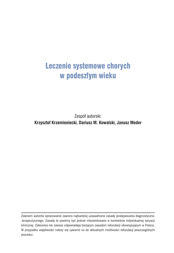 Leczenie systemowe chorych w podeszłym wieku Zespół autorski: Krzysztof Krzemieniecki, Dariusz M. Kowalski, Janusz Meder Zdaniem autorów opracowanie zawiera najbardziej uzasadnione zasady postępowania diagnostyczno-terapeutycznego. Zasady te powinny być jednak interpretowane w kontekście indywidualnej sytuacji klinicznej. Zalecenia nie zawsze odpowiadają bieżącym zasadom refundacji obowiązującym w Polsce. W przypadku wątpliwości należy się upewnić co do aktualnych możliwości refundacji poszczególnych procedur. Zalecenia postępowania diagnostyczno-terapeutycznego w nowotworach złośliwych — 2013 r. Spis treści Ogólna charakterystyka i epidemiologia.................................................................. 513 Onkologia geriatryczna.......................................................................................... 513 Odmienności w populacji osób w starszym wieku.................................................... 514 Rak piersi u kobiet w podeszłym wieku................................................................... 516 Badania przesiewowe...................................................................................... 516 Leczenie chirurgiczne....................................................................................... 516 Pooperacyjna radioterapia................................................................................ 516 Uzupełniająca hormonoterapia......................................................................... 517 Uzupełniająca chemioterapia............................................................................ 517 Systemowe leczenie choroby uogólnionej.......................................................... 518 Badania kontrolne po leczeniu.......................................................................... 519 Niedrobnokomórkowy rak płuca u chorych w podeszłym wieku.................................. 519 Leczenie chirurgiczne....................................................................................... 519 Uzupełniająca chemioterapia............................................................................ 520 Uzupełniająca radioterapia............................................................................... 520 Leczenie skojarzone NDRP zaawansowanego miejscowo — radiochemioterapia..................................................................................... 520 Leczenie w stadium uogólnienienia................................................................... 520 Badania przesiewowe u osób w starszym wieku ..................................................... 522 512 Leczenie systemowe chorych w podeszłym wieku Ogólna charakterystyka i epidemiologia Ryzyko choroby nowotworowej rośnie wraz z wiekiem człowieka i stały wzrost liczby osób starszych w społeczeństwie prowadzi do zwiększenia częstości wykrywania przypadków nowotworów. Szacuje się, że w najbliższych latach blisko 70% nowych rozpoznań będzie dotyczyć osób powyżej 65. roku życia. Osoby w tym wieku stanowią — według danych z 2009 roku — 13,5% całej polskiej populacji. W tym czasie w Polsce było blisko 1 400 000 osób w grupie wiekowej między 65. a 69. rokiem życia oraz ponad 3 700 000 powyżej 70. roku życia. Spodziewany czas życia wynosi w Polsce 71,5 roku dla mężczyzn i 80,1 roku dla kobiet. Obserwuje się stosunkowo niewielkie różnice w tym względzie pomiędzy populacją miejską i wiejską oraz poszczególnymi regionami Polski. Przez wiele lat chorzy w wieku powyżej 65. roku życia nie byli włączani do badań klinicznych z powodu ryzyka nieukończenia zaplanowanej terapii oraz większego prawdopodobieństwa niepowodzenia leczenia lub nasilonej toksyczności. Dodatkowym ograniczeniem udziału w badaniach klinicznych było przeświadczenie o odmiennym — często bardziej dynamicznym — przebiegu choroby nowotworowej w grupie starszych chorych. Wciąż nie są znane rzeczywiste korzyści kliniczne leczenia w grupie chorych w zaawansowanym wieku i stopień nasilenia działań niepożądanych. Uważa się, że osoby starsze są bardziej narażone na powikłania leczenia przeciwnowotworowego ze względu na mniejsze rezerwy narządowe, mniejszą zdolność do naprawy uszkodzeń komórkowych, zmiany w farmakokinetyce leków, nasilone interakcje lekowe oraz współistniejące choroby. Obecnie coraz więcej badań uwzględnia chorych powyżej 65. roku życia oraz posługuje się dodatkową analizą bezpieczeństwa u tych pacjentów otrzymujących innowacyjne terapie. Onkologia geriatryczna Starzenie się populacji, wzrost liczby zachorowań na nowotwory w grupie chorych powyżej 65. roku życia oraz zmiany fizjologiczne i patologiczne zachodzące u osób starszych doprowadziły do powstania nowej dyscypliny medycznej, czyli onkologii geriatrycznej. Coraz lepsze metody leczenia powodują, że choroba nowotworowa wielokrotnie ma przewlekły przebieg — osoby, które zachorowały w młodszym wieku, będą potrzebowały wsparcia geriatrycznego. Coraz powszechniej geriatrię onkologiczną uznaje się za podspecjalność onkologii klinicznej, co doprowadziło do powołania Międzynarodowego Towarzystwa Onkologii Geriatrycznej (SIOG, International Society of Geriatric Oncology). Onkologia geriatryczna posługuje się wielowymiarowym i interdyscyplinarnym podejściem do chorych na nowotwory. Podstawą są 4 zasady: zachowanie autonomii chorego, odnoszenie przez chorego rzeczywistej korzyści klinicznej w trakcie leczenia, nieszkodzenie choremu i sprawiedliwość w podejmowaniu decyzji. Osoby powyżej 65. roku życia stanowią grupę bardzo różnorodną pod względem stanu biologicznego i współwystępujących chorób oraz wydolności narządowej, co ma swoje implikacje podczas kwalifikowania do terapii przeciwnowotworowej. Podejmowanie decyzji o zakresie diagnostyki lub leczenia wyłącznie na podstawie wieku kalendarzowego lub stanu klinicznego chorego, ustalon