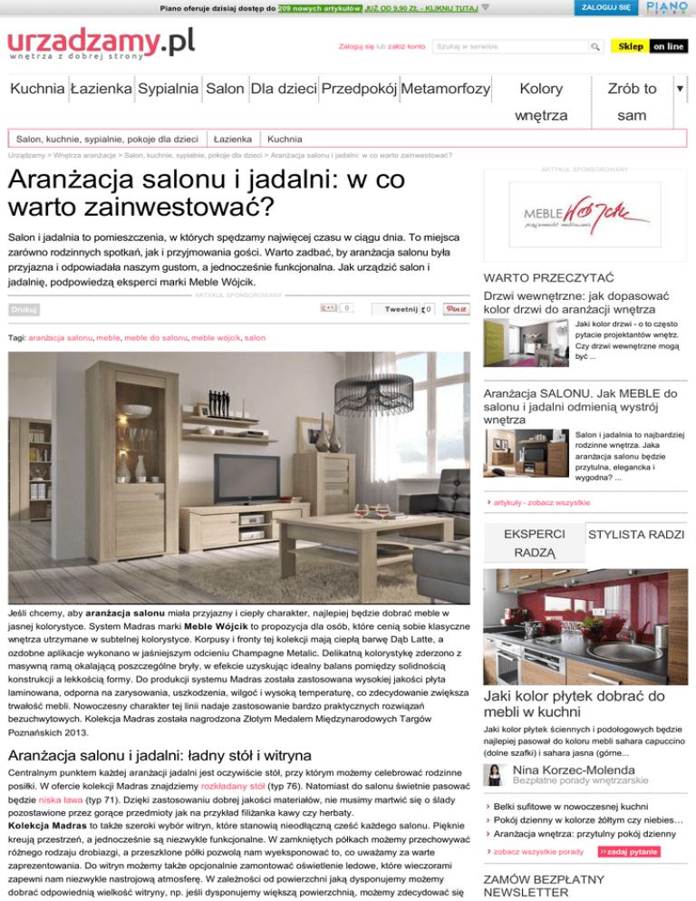 ZALOGUJ SIĘ Piano oferuje dzisiaj dostęp do 209 nowych artykułów. JUŻ OD 9,90 ZŁ - KLIKNIJ TUTAJ Zaloguj się lub załóż konto Szukaj w serwisie Kuchnia Łazienka Sypialnia Salon Dla dzieci Przedpokój Metamorfozy Salon, kuchnie, sypialnie, pokoje dla dzieci Łazienka Kolory Zrób to wnętrza sam ▼ Kuchnia Urządzamy > Wnętrza aranżacje > Salon, kuchnie, sypialnie, pokoje dla dzieci > Aranżacja salonu i jadalni: w co warto zainwestować? ARTYKUŁ SPONSOROWANY Aranżacja salonu i jadalni: w co warto zainwestować? Salon i jadalnia to pomieszczenia, w których spędzamy najwięcej czasu w ciągu dnia. To miejsca zarówno rodzinnych spotkań, jak i przyjmowania gości. Warto zadbać, by aranżacja salonu była przyjazna i odpowiadała naszym gustom, a jednocześnie funkcjonalna. Jak urządzić salon i WARTO PRZECZYTAĆ jadalnię, podpowiedzą eksperci marki Meble Wójcik. ARTYKUŁ SPONSOROWANY Drukuj 0 Tweetnij 0 Drzwi wewnętrzne: jak dopasować kolor drzwi do aranżacji wnętrza Jaki kolor drzwi - o to często pytacie projektantów wnętrz. Czy drzwi wewnętrzne mogą być ... Tagi: aranżacja salonu, meble, meble do salonu, meble wójcik, salon Aranżacja SALONU. Jak MEBLE do salonu i jadalni odmienią wystrój wnętrza Salon i jadalnia to najbardziej rodzinne wnętrza. Jaka aranżacja salonu będzie przytulna, elegancka i wygodna? ... artykuły - zobacz wszystkie EKSPERCI STYLISTA RADZI RADZĄ Jeśli chcemy, aby aranżacja salonu miała przyjazny i ciepły charakter, najlepiej będzie dobrać meble w jasnej kolorystyce. System Madras marki Meble Wójcik to propozycja dla osób, które cenią sobie klasyczne wnętrza utrzymane w subtelnej kolorystyce. Korpusy i fronty tej kolekcji mają ciepłą barwę Dąb Latte, a ozdobne aplikacje wykonano w jaśniejszym odcieniu Champagne Metalic. Delikatną kolorystykę zderzono z masywną ramą okalającą poszczególne bryły, w efekcie uzyskując idealny balans pomiędzy solidnością konstrukcji a lekkością formy. Do produkcji systemu Madras została zastosowana wysokiej jakości płyta laminowana, odporna na zarysowania, uszkodzenia, wilgoć i wysoką temperaturę, co zdecydowanie zwiększa trwałość mebli. Nowoczesny charakter tej linii nadaje zastosowanie bardzo praktycznych rozwiązań bezuchwytowych. Kolekcja Madras została nagrodzona Złotym Medalem Międzynarodowych Targów Poznańskich 2013. Aranżacja salonu i jadalni: ładny stół i witryna Centralnym punktem każdej aranżacji jadalni jest oczywiście stół, przy którym możemy celebrować rodzinne posiłki. W ofercie kolekcji Madras znajdziemy rozkładany stół (typ 76). Natomiast do salonu świetnie pasować będzie niska ława (typ 71). Dzięki zastosowaniu dobrej jakości materiałów, nie musimy martwić się o ślady pozostawione przez gorące przedmioty jak na przykład filiżanka kawy czy herbaty. Kolekcja Madras to także szeroki wybór witryn, które stanowią nieodłączną cześć każdego salonu. Pięknie kreują przestrzeń, a jednocześnie są niezwykle funkcjonalne. W zamkniętych półkach możemy przechowywać różnego rodzaju drobiazgi, a przeszklone półki pozwolą nam wyeksponować to, co uważamy za warte zaprezentowania. Do witryn możemy także opcjonalnie zamontować oświetlenie ledowe, które wieczorami zapewni nam niezwykle nastrojową atmosferę. W zależności od powierzchni jaką dysponujemy możemy dobrać odpowiednią wielkość witryny, np. jeśli dysponujemy większą powierzchnią, możemy zdecydować się Jaki kolor płytek dobrać do mebli w kuchni Jaki kolor płytek ściennych i podołogowych będzie najlepiej pasował do koloru mebli sahara capuccino (dolne szafki) i sahara jasna (górne... Nina Korzec-Molenda Bezpłatne porady wnętrzarskie Belki sufitowe w nowoczesnej kuchni Pokój dzienny w kolorze żółtym czy niebies… Aranżacja wnętrza: przytulny pokój dzienny zobacz wszystkie porady ZAMÓW BEZPŁATNY NEWSLETTER zadaj pytanie na typ 05 , który ma 109 cm szerokości i 192 cm wysokości. tagi Aranżacja salonu: postaw na komodę ZAPISZ SIĘ Twój adres e-mail Marka Meble Wójcik w swojej kolekcji Madras proponuje meble, które pozwolą nam najbardziej efektywnie zagospodarować przestrzeń. Mówimy tu oczywiście o komodach. W systemie Madras znajdziemy, aż 6 różnych propozycji tego mebla. Typ 32 jest przeznaczony do mniejszych pomieszczeń, gdyż ma tylko 74 cm SĄ Z NAMI wszyscy użytkownicy: 10828 osób salonie pozwala także uzyskać miejsce na dodatki, które dopełnią aranżacji naszego mieszkania. Warto pomyśleć o zainwestowaniu w ozdobne wazony, sztuczne kwiaty czy oryginalne figurki. dotad impresa aaaga Oprócz mebli i dodatków dla naszego wnętrza ważny jest także wybór odpowiedniego tła. Gładkie ściany w Punkty: 30 Punkty: 40 Punkty: 30 ArtisioDesign Punkty: 45 juulek Punkty: 30 RVinny Punkty: 35 szerokości, ale aż 116 cm wysokości. Dwie pojemne szuflady i jedna głęboka półka pozwolą zmieścić najpotrzebniejsze rzeczy. Interesującą propozycją jest komoda typ 42 . Dwie zamknięte półki zostały przedzielone jedną przeszkloną, do której można zastosować oświetlenie ledowe. Wykorzystanie komód w naturalnej kolorystyce optycznie powiększą nasz salon - o takim rozwiązaniu powinni pomyśleć właściciele niewielkich mieszkań. Zastosowanie wzorów pozwoli uwypuklić delikatną kolorystykę kolekcji Madras. Natomiast wybranie jednolitych ścian w zdecydowanym kolorze, pięknie wyeksponuje klasyczne jasne meble. Więcej na: www.meblewojcik.pl Zdjęcia: Meble Wójcik zobacz wszystkich Ocena: 0,0 Zobacz również FORUM dołącz do nas BLOGI POMYSŁY wyposażenie łazienki strawberry * 25 marca 2013 14:01:34 * 4 wpisy jakie szafki? strawberry * 25 marca 2013 13:59:16 * 5 wpisów układanie deski barlineckiej LidkaDiD * 25 marca 2013 12:27:42 * 3 wpisy Wielkanocna dekoracja Przepis na Wielkanoc: stołu: jak uniknąć błędów? jajka faszerowane w Radzi ekspert! skorupkach Sk