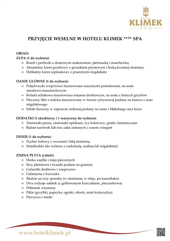 PRZYJĘCIE WESELNE W HOTELU KLIMEK **** SPA OBIAD: ZUPA (1 do wyboru): • Rosół z perliczki z domowym makaronem, pietruszką i marchewką • Aksamitny krem grzybowy z groszkiem ptysiowym i łezką kwaśnej śmietany • Delikatny krem szpinakowy z prażonymi migdałami DANIE GŁÓWNE (1 do wyboru): • Polędwiczki wieprzowe faszerowane suszonymi pomidorami, na sosie miodowo-musztardowym • Rolada schabowa faszerowana mięsem drobiowym, na sosie z leśnych grzybów • Pieczony filet z indyka marynowany w trawie cytrynowej podany na lustrze z sosu migdałowego • Schab duszony w zaprawie ziołowej podany na sosie z błękitnego sera lazur DODATKI (1 skrobiowy i 1 warzywny do wyboru): • Ziemniaki puree, ziemniaki opiekane, ryż kolorowy, gratin ziemniaczane • Bukiet surówek lub mix sałat zielonych z sosem vinegret DESER (1 do wyboru): • Puchar lodowy z owocami i bitą śmietaną • Semifreddo (do wyboru z czekoladą, maliną lub migdałami) ZIMNA PŁYTA (całość): • Deska wędlin i mięs pieczonych • Sery pleśniowe i twarde podane na granicie • Galaretki drobiowe i wieprzowe • Galantyna z kurczaka • Śledzie na trzy sposoby (w śmietanie, w oleju, po kaszubsku) • Dwa rodzaje sałatek (z grillowanym kurczakiem, pieczarkowa) • Półmisek wiosenny • Pikle (grzybki, papryka, ogórki, oliwki, mini kukurydza) • Pieczywo i masło I DANIE GORĄCE (1 do wyboru): • Pieczeń rycerska w sosie węgierskim podana z rosti ziemniaczanym • Grillowane udko faszerowane mięsem i warzywami podawane z dufinkami i sosem grzybowym II DANIE GORĄCE (1 do wyboru): • Wołowa pieczeń husarska z dodatkiem warzyw z kluskami śląskimi i ćwikłą • Kotlet ze schabu soute faszerowany boczkiem ogórkiem i cebulą podany z ziemniakami pieczonymi i czerwoną kapustą III DANIE GORĄCE (1 do wyboru): • Barszcz czerwony z pasztecikiem • Żur na domowym zakwasie z suszonymi grzybami jajkiem i kiełbasą białą NAPOJE: • Kawa, herbata, soki owocowe - bez ograniczeń, do spożycia w lokalu • Napoje gazowane (coca-cola, fanta, sprite) - bez ograniczeń, do spożycia w lokalu • Woda mineralna gazowana i niegazowana - bez ograniczeń, do spożycia w lokalu Chleb na powitanie Państwa Młodych oraz szampan dla wszystkich Gości. Bukiet dekoracyjny na stół Państwa Młodych oraz pokój dla Państwa Młodych. Dodatkowe usługi weselne wyceniane w momencie podjęcia decyzji o organizacji przyjęcia weselnego w Hotelu Klimek **** SPA. Alkohol, ciasta, tort, fontanna czekoladowa, szynka pieczona w całości lub prosiak faszerowany serwowany przy Gościach na sali. STÓŁ WIEJSKI: Doskonałym dodatkiem do uczt kulinarnych towarzyszącym organizowanym w Hotelu Klimek **** SPA imprezom jest Stół Wiejski, który chcielibyśmy Państwu zaproponować. Starannie dobrane regionalne wędliny, kiełbasy oraz smalec wyrabiany tradycyjną metodą zadowolą gusta najbardziej wymagających smakoszy. Produktów, które oferujemy nie dostaną Państwo w sklepach, a ich smak na długo pozostanie w Waszej pamięci. W skład zestawu wchodzą: • Pieczony indyk w całości • Pieczone kaczki (2-3 sztuki) • Pieczony łosoś w całości • Pieczone pstrągi • Szaszłyki śledziowe • Sałatki inne niż na stołach (1-2) • Mięsa pieczone: karczek, schab, boczek, łopatka • Wędliny wiejskie • Kiszka • Salceson wiejski • Kabanosy • Golonka wędzona • Smalec • Twarożek • Ogórki kiszone • Chleb wiejski • Oscypki Dzieci do lat trzech bezpłatnie bez świadczeń tylko z miejscem do siedzenia Dzieci do lat dziesięciu za 50% ceny. Hotel Klimek **** SPA 33-370 Muszyna, Złockie 107 tel.: + 48 18 477 82 22 fax: + 48 18 477 71 82 [email protected] marketing@hotel-klimek www.hotelklimek.pl