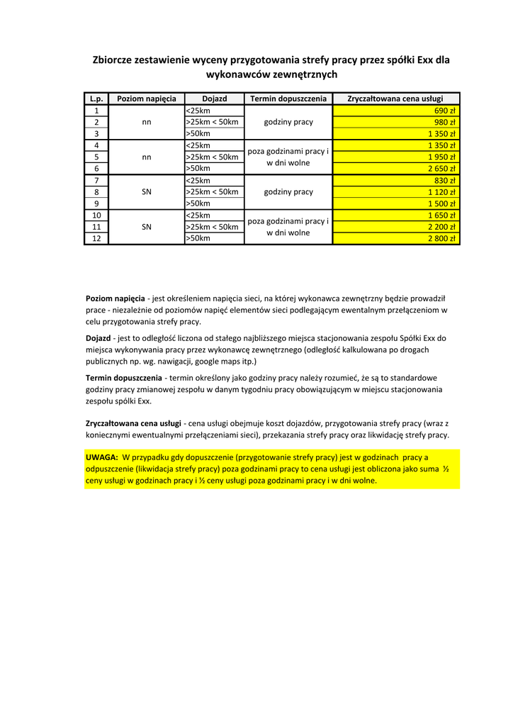 Zbiorcze zestawienie wyceny przygotowania strefy pracy przez spółki Exx dla wykonawców zewnętrznych L.p. 1 2 3 4 5 6 7 8 9 10 11 12 Poziom napięcia nn nn SN SN Dojazd <25km >25km < 50km >50km <25km >25km < 50km >50km <25km >25km < 50km >50km <25km >25km < 50km >50km Termin dopuszczenia godziny pracy poza godzinami pracy i w dni wolne godziny pracy poza godzinami pracy i w dni wolne Zryczałtowana cena usługi 690 zł 980 zł 1 350 zł 1 350 zł 1 950 zł 2 650 zł 830 zł 1 120 zł 1 500 zł 1 650 zł 2 200 zł 2 800 zł Poziom napięcia - jest określeniem napięcia sieci, na której wykonawca zewnętrzny będzie prowadził prace - niezależnie od poziomów napięć elementów sieci podlegającym ewentalnym przełączeniom w celu przygotowania strefy pracy. Dojazd - jest to odległość liczona od stałego najbliższego miejsca stacjonowania zespołu Spółki Exx do miejsca wykonywania pracy przez wykonawcę zewnętrznego (odległość kalkulowana po drogach publicznych np. wg. nawigacji, google maps itp.) Termin dopuszczenia - termin określony jako godziny pracy należy rozumieć, że są to standardowe godziny pracy zmianowej zespołu w danym tygodniu pracy obowiązującym w miejscu stacjonowania zespołu spólki Exx. Zryczałtowana cena usługi - cena usługi obejmuje koszt dojazdów, przygotowania strefy pracy (wraz z koniecznymi ewentualnymi przełączeniami sieci), przekazania strefy pracy oraz likwidację strefy pracy. UWAGA: W przypadku gdy dopuszczenie (przygotowanie strefy pracy) jest w godzinach pracy a odpuszczenie (likwidacja strefy pracy) poza godzinami pracy to cena usługi jest obliczona jako suma ½ ceny usługi w godzinach pracy i ½ ceny usługi poza godzinami pracy i w dni wolne.