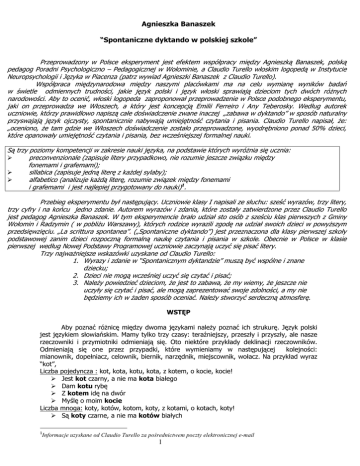 Agnieszka Banaszek “Spontaniczne dyktando w polskiej szkole” Przeprowadzony w Polsce eksperyment jest efektem współpracy między Agnieszką Banaszek, polską pedagog Poradni Psychologiczno – Pedagogicznej w Wołominie, a Claudio Turello włoskim logopedą w Instytucie Neuropsychologii i Języka w Piacenza (patrz wywiad Agnieszki Banaszek z Claudio Turello). ..............Współpraca międzynarodowa między naszymi placówkami ma na celu wymianę wyników badań w świetle odmiennych trudności, jakie język polski i język włoski sprawiają dzieciom tych dwóch różnych narodowości. Aby to ocenić, włoski logopeda zaproponował przeprowadzenie w Polsce podobnego eksperymentu, jaki on przeprowadza we Włoszech, a który jest koncepcją Emilii Ferreiro i Any Teberosky. Według autorek uczniowie, którzy prawidłowo napiszą całe doświadczenie zwane inaczej „zabawa w dyktando” w sposób naturalny przyswajają język ojczysty, spontanicznie nabywają umiejętność czytania i pisania. Claudio Turello napisał, że: „oceniono, że tam gdzie we Włoszech doświadczenie zostało przeprowadzone, wyodrębniono ponad 50% dzieci, które opanowały umiejętność czytania i pisania, bez wcześniejszej formalnej nauki. Są trzy poziomy kompetencji w zakresie nauki języka, na podstawie których wyróżnia się ucznia: preconvenzionale (zapisuje litery przypadkowo, nie rozumie jeszcze związku między fonemami i grafemami); sillabica (zapisuje jedną literę z każdej sylaby); alfabetico (analizuje każdą literę, rozumie związek między fonemami i grafemami i jest najlepiej przygotowany do nauki)1. Przebieg eksperymentu był następujący. Uczniowie klasy I napisali ze słuchu: sześć wyrazów, trzy litery, trzy cyfry i na końcu jedno zdanie. Autorem wyrazów i zdania, które zostały zatwierdzone przez Claudio Turello jest pedagog Agnieszka Banaszek. W tym eksperymencie brało udział sto osób z sześciu klas pierwszych z Gminy Wołomin i Radzymin ( w pobliżu Warszawy), których rodzice wyrazili zgodę na udział swoich dzieci w powyższym przedsięwzięciu. „La scrittura spontanea”. („Spontaniczne dyktando”) jest przeznaczona dla klasy pierwszej szkoły podstawowej zanim dzieci rozpoczną formalną naukę czytania i pisania w szkole. Obecnie w Polsce w klasie pierwszej według Nowej Podstawy Programowej uczniowie zaczynają uczyć się pisać litery. Trzy najważniejsze wskazówki uzyskane od Claudio Turello: 1. Wyrazy i zdanie w “Spontanicznym dyktandzie” muszą być wspólne i znane dziecku; 2. Dzieci nie mogą wcześniej uczyć się czytać i pisać; 3. Należy powiedzieć dzieciom, że jest to zabawa, że my wiemy, że jeszcze nie uczyły się czytać i pisać, ale mogą zaprezentować swoje zdolności, a my nie będziemy ich w żaden sposób oceniać. Należy stworzyć serdeczną atmosferę. WSTĘP Aby poznać różnicę między dwoma językami należy poznać ich strukurę. Język polski jest językiem słowiańskim. Mamy tylko trzy czasy: teraźniejszy, przeszły i przyszły, ale nasze rzeczowniki i przymiotniki odmieniają się. Oto niektóre przykłady deklinacji rzeczowników. Odmieniają się one przez przypadki, które wymieniamy w następującej kolejności: mianownik, dopełniacz, celownik, biernik, narzędnik, miejscownik, wołacz. Na przykład wyraz “kot”, Liczba pojedyncza : kot, kota, kotu, kota, z kotem, o kocie, kocie! Jest kot czarny, a nie ma kota białego Dam kotu rybę Z kotem idę na dwór Myślę o moim kocie Liczba mnoga: koty, kotów, kotom, koty, z kotami, o kotach, koty! Są koty czarne, a nie ma kotów białych 1 Informacje uzyskane od Claudio Turello za pośrednictwem poczty elektronicznej e-mail 1 Dam kotom rybę. Z kotami idę na dwór. Myślę o moich kotach. Przymiotniki odmieniają się podobnie i odmieniają się według rodzaju (męski, żeński i nijaki -ten ostatni rodzaj nie występuje w języku włoskim). Np. przymiotnik “nowy”. Liczba pojedyncza : nowy, nowa, nowe, nowego, nowej, nowego, nowemu, nowej. Np. Jest nowy kot czarny, a nie ma nowego kota białego Dam nowemu kotu rybę Z nowym kotem idę na dwór Myślę o moim nowym kocie Liczba mnoga: nowi, nowe, nowych, nowym, z nowymi Są nowe koty czarne, a nie ma nowych kotów białych Dam nowym kotom rybę. Z nowymi kotami idę na dwór. Myślę o moich nowych kotach. W tabeli IPA (Międzynarodowy alfabet fonetyczny) nie ma wszystkich polskich dźwięków i dlatego nie możemy ocenić ilości fonemów. Kto zna język włoski w szczególności wie, jaka jest relacja między fonemami i grafemami w tym języku (spójrz wywiad Agnieszki Banaszek z Angela Ottone), ale w naszym języku jest inaczej, tzn. są wyrazy, w których wymawiamy: “f”, “p”, “t”, sz”, ale piszemy “w”, “b”, “d, “rz, (kawka jest “w” ale wymawiamy “f” kafka, rybka jest “b” , ale wymawiamy “p”- rypka, słodki jest“d”, ale my mówimy “t” słotkie, przepraszam mówimy “sz”, ale piszemy “rz” itd.). Litera “f” nie jest przedstawiana zawsze jako “w”, litera „p“ nie jest przedstawiana zawsze jako “b” itp. Dlatego występują trudności z prawidłową pisownią, tzn. konewka, konewki, konewką, konewkami, (mówimy „f“, ale piszemy „w“), natomiast konewek (mówimy „w“ i piszemy „w“). To jest ten sam rzeczownik. Inny przykład: mała rybka (mówimy“p” piszemy “b”), ale duża ryba (mówimy i piszemy “b”). W języku polskim występują samogłoski a, e, o, i, u, (ó), y, ą, ę. Mamy także samogłoski: ą, ę, ó, y, które nie istnieją w języku włoskim. Wyróżnia się następujące trudności ortograficzne dla polskich dzieci: kąpiel – piszemy„ą”, ale wymawiamy „om”. Dzieci często zamiast napisać „ą”, „ę”, piszą „om”, „em” , natomiast zamiast zapisać “ął” (dotyczy 3 osoby czasownika w czasie przeszłym), piszą “oł” lub “ą”: kopnął (pisownia prawidł