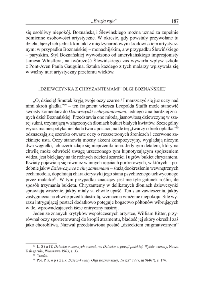 „Erozja raju” 187 się osobliwy niepokój. Boznańską i Ślewińskiego można uznać za zupełnie odmienne osobowości artystyczne. W okresie, gdy powstały przywołane tu dzieła, łączył ich jednak kontakt z międzynarodowym środowiskiem artystycznym: w przypadku Boznańskiej – monachijskim, a w przypadku Ślewińskiego – paryskim. Styl Boznańskiej wywodzono od amerykańskiego impresjonisty Jamesa Whistlera, na twórczość Ślewińskiego zaś wywarła wpływ szkoła z Pont-Aven Paula Gauguina. Sztuka każdego z tych malarzy wpisywała się w ważny nurt artystyczny przełomu wieków. „DZIEWCZYNKA Z CHRYZANTEMAMI” OLGI BOZNAŃSKIEJ „O, dziecię! Smutek kryją twoje oczy czarne / I marszczyć się już uczy nad nimi skroń gładka”39 – ten fragment wiersza Leopolda Staffa może stanowić swoisty komentarz do Dziewczynki z chryzantemami, jednego z najbardziej znanych dzieł Boznańskiej. Przedstawia ono młodą, jasnowłosą dziewczynę w szarej sukni, trzymającą w złączonych dłoniach bukiet białych kwiatów. Szczególny wyraz ma niespotykanie blada twarz postaci; na tle tej „twarzy o bieli opłatka”40 odznaczają się szeroko otwarte oczy o rozszerzonych źrenicach i czerwone zaciśnięte usta. Oczy stanowią mocny akcent kompozycyjny, wyglądają niczym dwa węgielki, ich czerń zdaje się nieprzenikniona. Jedynym detalem, który na chwilę może odwrócić uwagę urzeczonego tym hipnotyzującym spojrzeniem widza, jest bielejący na tle różnych odcieni szarości i ugrów bukiet chryzantem. Kwiaty pojawiają się również w innych ujęciach portretowych, w których – podobnie jak w Dziewczynce z chryzantemami – służą dookreśleniu wewnętrznych cech modela, dopełniają charakterystyki jego stanu psychicznego uchwyconego przez malarkę41. W tym przypadku znaczący jest nie tyle gatunek roślin, ile sposób trzymania bukietu. Chryzantemy w delikatnych dłoniach dziewczynki sprawiają wrażenie, jakby miały za chwilę upaść. Ten stan zawieszenia, jakby zastygnięcia na chwilę przed katastrofą, wzmacnia wrażenie niepokoju. Siłę wyrazu intrygującej postaci dodatkowo potęguje bogactwo półtonów wibrujących w tle, wprowadzających iście oniryczny nastrój. Jeden ze znanych krytyków współczesnych artystce, William Ritter, przyrównał oczy sportretowanej do kropli atramentu, bladość jej skóry określił zaś jako chorobliwą. Nazwał przedstawioną postać „dzieckiem enigmatycznym” 39 L. S t a f f, Dziecku o czarnych oczach, w: Dziecko w poezji polskiej. Wybór wierszy, Nasza Księgarnia, Warszawa 1963, s. 33. 40 Tamże. 41 Por. P. K o p s z a k, Dzieci-kwiaty Olgi Boznańskiej, „Więź” 1997, nr 9(467), s. 174. Artur STRUG 188 i „przerażającą dziewczynką”42, a jej spojrzenie uznał za zdolne doprowadzić do szaleństwa. Po wystawie w roku 1904 anonimowy autor pisał: „Panna de Boznańska, przekonana, że oczy ludzkie są zwierciadłem całego życia, całej myśli i całej inteligencji, stara się je oddać jak tylko można najprawdziwiej, zogniskować w nich całą siłę obrazu, uczynić z nich główny jego motyw, który najpierw ma przyciągać uwagę widza, później zaś ją zatrzymać”43. Wiele przychylnych recenzji zebrała malarka trzy lata później, podczas wystawy Salon de la Société Nationale des Beaux-Arts. Autor najobszerniejszej z nich stwierdził: „[Boznańska – A.S.] porywa nas swą sztuką niezwykle wrażliwą, przenikającą do najskrytszych zakamarków ludzkiej duszy. W tych portretach życie duszy czytamy z wyrazu oczu i ust, a z jakąż delikatną subtelnością i prostotą warsztatu nakreślona jest twarz modela”44. Uwagę zwraca zgodność, z jaką krytycy chwalili trafne odmalowanie przez Boznańską psychicznych cech portretowanych postaci, świadczące o niezwykłej wrażliwości artystycznej malarki i jej znakomitym warsztacie. Nie dziwi fakt, że Ritter połączył dziewczynkę z obrazu Boznańskiej z postaciami kreowanymi przez Maurice’a Maeterlincka. Patrząc na to płótno, chciałoby się powtórzyć słowa Królowej z utworu dramatycznego Siedmiu królewien, która na widok swych bladych córek woła: „Nie patrzmy już na nie, moglibyśmy się przeląc!”45. Również Piotr Kopszak pisze, że postaci z portretów Boznańskiej w nieunikniony sposób przywodzą na myśl owe melancholijne księżniczki, „kryjące w sobie tajemnicze, destrukcyjne moce”46. Nienaturalna bladość skóry i głęboka czerń oczu dziewczynki z chryzantemami rzeczywiście mogą wzbudzać obawę podobną do tej, która rodzi się w trakcie lektury dramatów Maeterlincka. W spojrzeniu tej postaci uchwycone zostało jakieś dziwne napięcie, trudny do zrozumienia konflikt. Zdzisław Żygulski twierdził, że portret ten należy odczytywać przez pryzmat zainteresowania sferą nieświadomości jako rezerwuaru wszelkich lęków i pragnień. Jego zdaniem dziewczęca postać z obrazu Boznańskiej, jak również inne dzieci wykreowane przez artystów przełomu dziewiętnastego i dwudziestego wieku, stanowią unaocznienie freudowskiego id, którego energia emanuje ze szczególną mocą w burzliwym okresie pomiędzy dzieciństwem a dorosłością47. Możemy więc Cyt. za: H. B l u m, Olga Boznańska. Zarys życia i twórczości, Wydawnictwo Literackie, Kraków 1964, s. 28. 43 Cyt. za: M. R o s t w o r o w s k a, Portret za mgłą. Opowieść o Oldze Boznańskiej, Wydawnictwo Lexis, Kraków 2005, s. 122. 44 Cyt. za: R o s t w o r o w s k a, dz. cyt., s. 157. 45 M. M a e t e r l i n c k, Siedem królewien, w: tenże, Wybór pism dramatycznych, tłum. Z. Przesmycki, Wydawnictwo Wacław Bagiński i Synowie, Wrocław 1994, s. 86. 46 P. K o p s z a k, Smutne barwy. La vraie vérité obrazów Olgi Boznańskiej, „Porta Aurea” 4(1995), s. 88n. 47 Por. Z. Ż y g u l s k i, Dziecko w malarstwie polskim, Arkady, Warszawa 1989, s. 4. 42 „Erozja raju” 189 w dziewczynce Boznańskiej dopatrzyć się znam