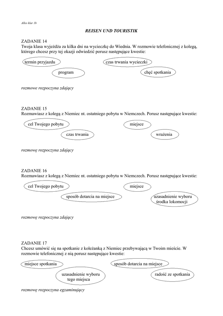 Alles klar 1b REISEN UND TOURISTIK ZADANIE 14 Twoja klasa wyjeżdża za kilka dni na wycieczkę do Wiednia. W rozmowie telefonicznej z kolegą, którego chcesz przy tej okazji odwiedzić porusz następujące kwestie: termin przyjazdu czas trwania wycieczki program chęć spotkania rozmowe rozpoczyna zdający ZADANIE 15 Rozmawiasz z kolegą z Niemiec nt. ostatniego pobytu w Niemczech. Porusz następujące kwestie: cel Twojego pobytu miejsce czas trwania wrażenia rozmowę rozpoczyna zdający ZADANIE 16 Rozmawiasz z kolegą z Niemiec nt. ostatniego pobytu w Niemczech. Porusz następujące kwestie: cel Twojego pobytu miejsce sposób dotarcia na miejsce uzasadnienie wyboru środka lokomocji rozmowę rozpoczyna zdający ZADANIE 17 Chcesz umówić się na spotkanie z koleżanką z Niemiec przebywającą w Twoim mieście. W rozmowie telefonicznej z nią porusz następujące kwestie: miejsce spotkania sposób dotarcia na miejsce uzasadnienie wyboru tego miejsca rozmowę rozpoczyna egzaminujący radość ze spotkania ZADANIE 18 W czasie pobytu w Niemczech na kursie językowym chcesz zaplanować resztę wakacji. W rozmowie z pracownikiem biura podróży porusz następujace kwestie: aktualna oferta cel podróży miejsce zakwaterowania zniżki rozmowę rozpoczyna egzaminujący ZADANIE 19 Wspólnie z koleżanką ze Szwajcarii planujesz wakacje. Chcesz wyjechać nad morze, a ona w góry. W rozmowie uwzglednij następujące kwestie: dezaprobatę jej propozycji argumenty przemawiające za twoją propozycją sposób dotarcia na miejsce zakwaterowanie rozmowę rozpoczyna egzaminujący alles klar 2a ZADANIE 1 Po wakacjach gościcie w szkole grupę młodzieży niemiekiej. W rozmowie z jednym z kolegów z Niemiec porusz następujące kwestie: miejsce wypoczynku zajęcia związane z tym miejscem poznane osoby wrażenia rozmowę rozpoczyna zdający ZADANIE 1 Jesteś na wakacjach u znajomego. Wspólnie ustalcie plan wycieczki. W rozmowie porusz następujace kwestie: zwiedzanie transport rozmowę zaczyna egzaminujący posiłki zakupy ZADANIE 2 W niemieckim biurze podróży zarezerwowałeś podróż do jednego z tropikalnych krajów. Niestety, nie możesz wyjechać w planowanym terminie. W rozmowie telefonicznej z pracownikiem biura porusz nastepujace kwestie: możliwość zmiany terminu powód zmiany koszty związane ze zmianą dodatkowe formalności związane ze zmianą rozmowę rozpoczyna zdający ZADANIE 3 Chcesz wynająć pokój w hotelu w Heidelbergu. W rozmowie z recepcjonistą porusz nastepujące kwestie: wyposażenie hotelu oferowane menu parking hotelowy atrakcje turystyczne w okolicy rozmowę rozpoczyna egzaminujący ZADANIE 4 Jesteś w Monachium. Wybierasz się samolotem do Berlina. W rozmowie z pracownikiem biura podróży porusz następujace kwestie: częstotliwość lotów do Berlina rezerwacja biletów zniżka czas lotu rozmowę rozpoczyna egzaminujący ZADANIE 5 Przyjechałeś/aś do niemieckiej rodziny w Bonn. Chcesz zwiedzić miasto. W rozmowie uwzględnij następujące kwestie: dojazd do centrum ciekawe zabytki czas potrzebny na zwiedzanie rozmowę rozpoczyna zdający miejsca serwujące typowe niemieckie potrawy ZADANIE 6 Przyjechałeś/aś do Frankfurtu nad Menem. Chcesz dostać się taksówką z lotniska do hotelu. W rozmowie z taksówkarzem porusz następujace kwestie: miejsce, w które chcesz dotrzeć koszt przejazdu wskazanie wartych zobaczenia miejsc sposoby poruszania się po mieście rozmowę rozpoczyna zdający ZADANIE 7 Gościsz koleżankę z Niemiec. Chcesz zaprosić ją na wystawę w muzeum sztuki. W rozmowie porusz następujące kwestie: rodzaj muzeum ekspozycja sposób dotarcia na miejsce bilety wstępu rozmowę rozpoczyna zdający ZADANIE 8 Wyjeżdżasz na długie wakacje do Szwajcarii. Chcesz wynająć kwaterę prywatną, ale jej cena jest dla Ciebie zbyt wysoka. W rozmowie z wlaścicielem porusz następujace kwestie: swoje niezadowolenie z ceny Twoją propozycję ceny rezygnację z posików chęć ponownego przyjazdu rozmowę rozpoczyna egzaminujący ZADANIE 9 Będąc przejazdem w Weimarze chciałbyś/-abyś zwiedzić miasto. W rozmowie z pracownikiem informacji turystycznej uwzględnij następujące kwestie: ciekawe obiekty ceny biletów wstępu rozmowę rozpoczyna zdający sposób dotarcia na miejsce czas potrzebny na zwiedzenie