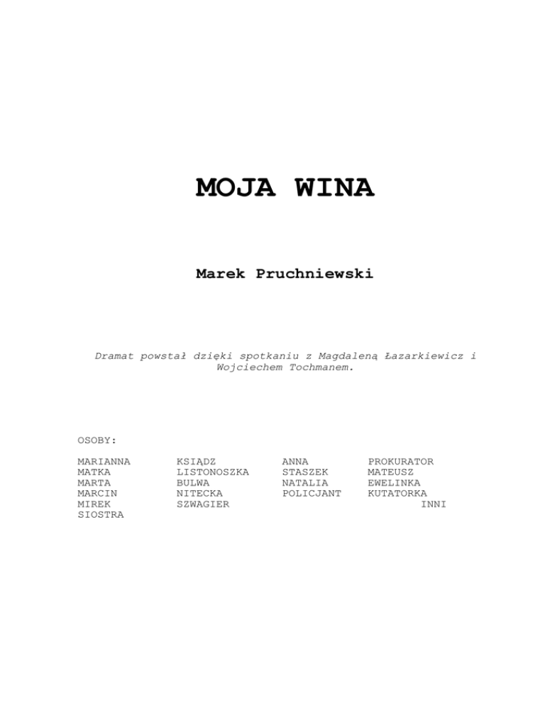 MOJA WINA Marek Pruchniewski Dramat powstał dzięki spotkaniu z Magdaleną Łazarkiewicz i Wojciechem Tochmanem. OSOBY: MARIANNA MATKA MARTA MARCIN MIREK SIOSTRA KSIĄDZ LISTONOSZKA BULWA NITECKA SZWAGIER ANNA STASZEK NATALIA POLICJANT PROKURATOR MATEUSZ EWELINKA KUTATORKA INNI © Marek Pruchniewski 1. Mieszkanie Marianny. W łóżku leży MARCIN. Jest chory, ma kolejny atak. MARIANNA usiłuje powstrzymać drgawki chłopca. W drzwiach pokoju stoi MATKA MARIANNY. MARIANNA Dzwoniłaś do lekarza? MATKA Dzwoniłam. MARIANNA Kiedy przyjdzie? MATKA Nie odbiera. MARIANNA To dzwoń na pogotowie! MATKA Nie przyjadą. MARIANNA Przyjadą. MATKA Będzie tak jak ostatnio. MARIANNA Muszą. Muszą przyjechać. Dzwoń. MARIANNA uspokaja chłopca. MARIANNA Ciii. Już dobrze. (Po chwili.) Co tak stoisz? MATKA Żaden lekarz już mu nie pomoże. Nie widzisz, że...? 1 © Marek Pruchniewski MARIANNA Że co? Co?! MATKA Trzeba po księdza. MARIANNA Dzwoń na pogotowie! MARIANNA patrzy na leżącego MARCINA, odgarnia mu włosy z czoła. MATKA rozmawia przez telefon. MARIANNA Przyjadą? MATKA Przyjadą. MARIANNA Kiedy? MATKA Nie powiedzieli. MARIANNA Idź po Mirka. Niech tu przyjdzie. MATKA Ja mam iść? Ja? Ty go przegoniłaś... Do pokoju zagląda MARTA. MARTA Mamo...co z Marcinem? MARIANNA Przyjedzie lekarz. Będzie dobrze. MARTA Mamo... 2 © Marek Pruchniewski MARIANNA Idź do pokoju. MARTA zamyka drzwi. MARIANNA uspokaja MARCINA. MARIANNA Ciii Oddychaj. Dobrze. Jeszcze raz. Jeszcze ... MATKA ciągle stoi w progu. MARIANNA Idź po niego! 2. Mieszkanie obok. ANNA i STASZEK nasłuchują. ANNA Słyszysz? STASZEK (Nie odpowiada.) ANNA Znowu ma atak. STASZEK Nie przetrzyma tej nocy. ANNA Przestań. Przestań krakać. ANNA podchodzi do łóżka NATALII. Na prześcieradle dostrzega plamę moczu. NATALIA płacze. ANNA ją obejmuje i tuli. Zabiera z łóżka. Zwija mokre prześcieradło. STASZEK Znowu? ANNA Znowu. STASZEK Co to ma być? Co?! 3 © Marek Pruchniewski ANNA Nie krzycz. STASZEK Ile ona ma lat?! No ile?! ANNA Nie krzycz. ANNA obejmuję córkę. ANNA Natalka, kochanie... Co się dzieje? NATALIA Nie chciałam. Nie chciałam... ANNA Wiem...Wiem. STASZEK ( Do Anny.) Na co czekasz? Zrób coś. 3. Mieszkanie Marianny. W drzwiach stoi MIREK. MIREK Umarł? MARIANNA Nie. Nie umarł! MIREK Czego chcesz? MARIANNA (Milczy.) MIREK chce wyjść. 4 © Marek Pruchniewski MARIANNA Zostań. Gdzie ona jest? MIREK Poszła. MARIANNA Dokąd? MIREK Skąd mam wiedzieć. Poszła i już. MARIANNA Posiedź przy nim. MIREK (Ciągle stoi w drzwiach.) Teraz posiedź...? MARIANNA Twój syn... MIREK Mój? Mój?! MARIANNA Twój! Co? Wierzysz w te bzdury co opowiadają?! Twój! Tylko popatrz. Popatrz! MIREK Nie drzyj się. MIREK myszkuje po szafkach. Wyciąga puste butelki. Szuka alkoholu. MARIANNA Nic tu nie znajdziesz. Lepiej idź. MIREK Zdecyduj się. Raz już mnie wyrzuciłaś. MARIANNA Wyrzuciłam? Ile razy nie mogłeś znaleźć drogi do domu. Ile? 5 © Marek Pruchniewski MIREK (Nie odpowiada.) MARIANNA Idź... Idź przed dom, czekaj na karetkę. Znowu będą błądzić. No idź. MIREK wychodzi. W drzwiach staje MARTA, patrzy na brata. Do mieszkania wchodzą MATKA i KSIĄDZ. KSIĄDZ Pochwalony Jezus Chrystus. MARIANNA ( Odwraca się zaskoczona.) Na wieki wieków. Ale... MATKA Co? Co ale? MARIANNA Zaraz przyjedzie pogotowie. MATKA Przyjedzie albo i nie. Nie zaszkodzi. Niech Ksiądz robi co trzeba. KSIĄDZ Potrzebuję trochę waty. MARIANNA Waty? KSIĄDZ Do namaszczenia. MATKA Na co czekasz? Daj Księdzu. KSIĄDZ zbliża się do łóżka, pochyla się nad dzieckiem. MARIANNA podaje watę. KSIĄDZ udziela namaszczenia chorych. Robi znak krzyża na czole dziecka. Namaszcza olejami. Potem kładzie na jego głowie i brzuchu dłonie. Zastyga nieruchomo. 6 © Marek Pruchniewski MARIANNA Co on robi? MATKA Namaścił, a teraz kładzie na nim ręce. MARIANNA Ręce? MATKA Będzie dobrze. Niejednemu już pomógł. MARIANNA Pomógł? KSIĄDZ odchodzi od łóżka. MATKA Zrobię księdzu herbaty. KSIĄDZ Nie trzeba. Dość macie kłopotów... MATKA Co za kłopot? KSIĄDZ (Zwraca się do Marianny.) Będzie dobrze. KSIĄDZ kładzie dłoń na ramieniu MARIANNY, dotyka włosów. Spogląda na MARTĘ. KSIĄDZ Dobrze, że ona chowa się zdrowo. MATKA Zaraz... Zaraz będzie herbata. MARIANNA Ksiądz już idzie. MATKA Ale... KSIĄDZ Może...innym razem 7 © Marek Pruchniewski A to, trzeba spalić. (Pokazuje na waciki, którymi namaszczał.) Nie można wyrzucić. MARIANNA Spalę. Niech Ksiądz już idzie! MATKA Co ty... Co ty robisz? MARIANNA Niech Ksiądz już idzie! KSIĄDZ wychodzi MATKA (Do Księdza.) Przepraszam Księdza... Wszystko przez te nerwy. Całkiem zgłupiała. ( Do Marianny.) Odbiło ci? Odbiło?! MARIANNA uchyla palenisko, wrzuca waciki do ognia. Patrzy jak płoną. 4. Mieszkanie Marianny. MARIANNA i ANNA. ANNA Co z nim? MARIANNA Wzięli go do szpitala. ANNA (Po chwili.) Był tu? Mariana Kto? ANNA Proboszcz. 8 © Marek Pruchniewski MARIANNA Matka go sprowadziła. ANNA Marianna ... MARIANNA Ona go sprowadziła. Ona. ANNA (Po chwili.) Nie boisz się? MARIANNA Boję. Boję się o Marcina. Boję się, że...umrze. Że, będzie sam. Że... Milczą przez chwilę. ANNA Nic się nie stanie. Jest w szpitalu. (Po chwili.) Marianna. Ja... MARIANNA Co? ANNA Też się boję. MARIANNA Ty...? ANNA Boję się o Natalię. MARIANNA O Natalię? Jest przecież zdrowa. Nic jej nie jest. ANNA Boję się. (Po chwili.) Nie boisz się o Martę? 9 © Marek Pruchniewski MARIANNA O Martę? O czym ty mówisz? ANNA Wiesz, o czym mówię. MARIANNA (Po chwili.) Wiem, że mam dziecko w szpitalu. Że może umrzeć. Że... Tylko to wiem. Rozumiesz?! Tylko to! ANNA Pójdę już. ANNA wychodzi. Zjawią się MATKA i SIOSTRA. MATKA Znowu? Znowu drzesz papę. MARIANNA Daj mi spokój. MATKA Spokój? Wszyscy słyszeli... Wszyscy. MARIANNA Co słyszeli? Co? SIOSTRA Dzieciak ci umiera, a ty z pyskiem na Księdza. Gdyby nie on...to... MARIANNA Co? MATKA Już by go nie było. MARIANNA P