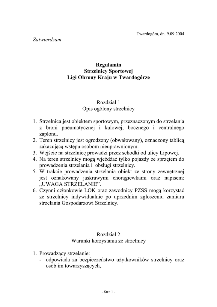 Twardogóra, dn. 9.09.2004 Zatwierdzam Regulamin Strzelnicy Sportowej Ligi Obrony Kraju w Twardogórze Rozdział 1 Opis ogólony strzelnicy 1. Strzelnica jest obiektem sportowym, przeznaczonym do strzelania z broni pneumatycznej i kulowej, bocznego i centralnego zapłonu. 2. Teren strzelnicy jest ogrodzony (obwałowany), oznaczony tablicą zakazującą wstępu osobom nieuprawnionym. 3. Wejście na strzelnicę prowadzi przez schodki od ulicy Lipowej. 4. Na teren strzelnicy mogą wjeżdżać tylko pojazdy ze sprzętem do prowadzenia strzelania i obsługi strzelnicy. 5. W trakcie prowadzenia strzelania obiekt ze strony zewnętrznej jest oznakowany jaskrawymi chorągiewkami oraz napisem: „UWAGA STRZELANIE”. 6. Czynni członkowie LOK oraz zawodnicy PZSS mogą korzystać ze strzelnicy indywidualnie po uprzednim zgłoszeniu zamiaru strzelania Gospodarzowi Strzelnicy. Rozdział 2 Warunki korzystania ze strzelnicy 1. Prowadzący strzelanie: - odpowiada za bezpieczeństwo użytkowników strzelnicy oraz osób im towarzyszących, - Str.: 1 - - wyznacza korzystającym ze strzelnicy stanowiska strzeleckie, a osobom towarzyszącym miejsce bezpiecznego pobytu, - prowadzi książkę rejestru pobytu na strzelnicy, w której zamieszcza się następujące dane: a) imię i nazwisko korzystającego ze strzelnicy, b) rodzaj i kaliber broni, z której prowadzono strzelanie, c) określenie właściciela broni, d) godzinę przyjścia i wyjścia ze strzelnicy, e) numer pozwolenia na broń, f) nazwę organu, który wydał pozwolenie na broń, g) oświadczenie korzystającego ze strzelnicy o zapoznaniu się z regulaminem strzelnicy i przepisami bezpieczeństwa potwierdzone włąsnoręcznym podpisem. 2. Na strzelnicy zabrania się: - osobom towarzyszącym osobom korzystających ze strzelnicy wchodzenia na stanowiska strzeleckie oraz styczności z bronią, - używania broni innych osób korzystających ze strzelnicy, bez zgody jej użytkownika, - spożywania alkoholu lub używania środków odurzających oraz przebywania na strzelnicy osób będących pod ich wpływem. 3. Na strzelnicy w miejscu widocznym umieszcza się: - regulamin strzelnicy, - decyzję burmistrza o dopuszczeniu strzelnicy do użytkowania, - plan strzelnicy z oznaczeniem stanowisk strzeleckich, punktu sanitarnego, dróg ewakuacyji, wykaz sygnałów alarmowych, miejsca instalacji telefonu lub innych urządzeń łączności, - informacje o możliwości i sposobie połączenia się z najbliższym punktem pomocy medycznej. 4. Za szkody powstałe podczas strzelania oraz spowodowane wypadki odpowiada właściciel lub zarządca strzelnicy, prowadzący strzelanie lub trening strzelecki albo korzystający ze strzelnicy, na zasadach określonych w odrębnych przepisach. - Str.: 2 - Rozdział 3 Sposób obchodzenia się z bronią 1. Broń palną na strzelnicy przenosi się rozładowaną, zabezpieczoną i schowaną w kaburze, pokrowcu lub kasetach przeznaczonych do noszenia broni. 2. Wyjmowanie broni odbywa się wyłącznie na stanowisku strzeleckim lub treningowym tylko na polecenie prowadzącego strzelanie lub trening strzelecki. 3. Wszelkich czynności związanych z obsługą broni dokonuje się wyłącznie z lufą skierowaną w kierunku kulochwytu, tarcz bądź przedmiotów będących celem na strzelnicy. 4. Strzelanie rozpoczyna się wyłącznie na komendę prowadzącego strzelanie. 5. Zakończenie strzelania zgłasza się prowadzącemu strzelanie. 6. Po zakończeniu strzelania broń rozładowuje się, przedstawia do kontroli prowadzącemu strzelanie a następnie zabezpiecza. 7. Zabrania się strzelania na terenie strzelnicy do innych przedmiotów niż tarcze strzelnicze oraz celowania lub strzelania do ludzi, zwierząt i ptactwa. Rozdział 4 Sposób zachowania się osób przebywających na strzelnicy 1. Korzystający ze strzelnicy jest obowiązany ściśle przestrzegać poleceń wydawanych przez prowadzącego strzelanie. 2. Zabrania się wchodzenia przed stanowisko strzeleckie bez zgody prowadzącego strzelanie. 3. Korzystający ze strzelnicy, z wyjątkiem osoby niepełnosprawnej obowiązany jest przestrzegać przepisów dotyczących postaw strzeleckich. 4. Po komendzie „STOP”, wydanej przez prowadzącego strzelanie lub inną osobę, strzelający bezzwłocznie przerywają strzelanie. 5. Na teren strzelnicy zwierzęta mogą być wprowadzane tylko w wyjątkowych przypadkach oraz obowiązkowo powinny być trzymane na uwięzi i pod ścisłym nadzorem opiekuna. 6. Zabrania się chodzenia po wałach otaczających strzelnicę. - Str.: 3 - 7. Osobę naruszającą regulamin strzelnicy usuwa się ze strzelnicy. 8. Dzieci mogą przebywać na strzelnicy wyłącznie pod bezpośrednim nadzorem rodziców lub opiekunów. Nniniejszy regulamin został opracowany na podstawie wzorcowego regulaminu funkcjonowania strzelnicy. - Str.: 4 -