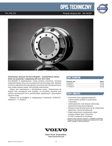 Opis techniczny Rodzaj obręczy kół WL-ALDP FH, FM, FE Aluminiowe obręcze kół Dura-Bright® – standardowe otwory (koła osi przedniej i napędowej dla 4x2, 6x4 i 8x4) Dura-Bright® to opatentowana, trwała warstwa wierzchnia, tworząca integralną barierę ochronną na powierzchni aluminiowego koła. Warstwa ochronna całkowicie eliminuje pękanie, łuszczenie się i korozję aluminium oraz nadaje obręczy połysk, bez potrzeby polerowania. Obręcz jest wyposażona w standardowe otwory, dostosowane do długich śrub mocujących koła (szpilek), co umożliwia używanie tych samych aluminiowych kół w samochodach ciężarowych i przyczepach różnych marek. Obręcze kół są dostępne w następujących rozmiarach: 8,25x22,5”, 9,00x22,5” i 11,75x22,5”. Dane techniczne Rozmiar kół Masa 8,25x22,5”...............................................................24 kg 9,00x22,5”...............................................................25 kg 11,75x22,5”..............................................................26 kg Cechy i korzyści • Aluminiowe koła wyglądają elegancko, a jednocześnie są łatwe w czyszczeniu* i utrzymaniu. • Jednoczęściowe, kute obręcze odznaczają bezkonkurencyjną wytrzymałością. • Mniejsza masa kół przyczynia się do zwiększenia ładowności i ekonomiki paliwowej. • Dzięki skutecznemu rozpraszaniu ciepła, wzrasta trwałość opon i hamulców. • W 100% nadają się do recyklingu. * Czyścić ciepłą wodą pod ciśnieniem, z dodatkiem łagodnego detergentu. Nie stosować środków, przewidzianych do czyszczenia „zwykłych” kół aluminiowych. 2008-12-12 POL Version 01 1 (1)