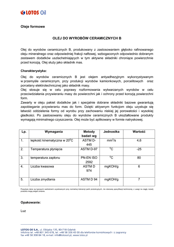 Oleje formowe OLEJ DO WYROBÓW CERAMICZNYCH B Olej do wyrobów ceramicznych B, produkowany z zastosowaniem głęboko rafinowanego oleju mineralnego oraz odpowiedniej frakcji naftowej, wzbogaconych odpowiednio dobranym zestawem dodatków uszlachetniających w tym aktywne składniki chroniące powierzchnie przed korozją. Olej służy jako składnik mas. Charakterystyka: Olej do wyrobów ceramicznych B jest olejem antyadhezyjnym wykorzystywanym w przemyśle ceramicznym, przy produkcji wyrobów kamionkowych, porcelitowych oraz porcelany elektrotechnicznej jako składnik masy. Olej stosuje się w celu poprawy rozformowania wytwarzanych wyrobów w celu przeciwdziałania przywieraniu masy do powierzchni jak i ochrony przed korozją powierzchni form. Zawarty w oleju pakiet dodatków jak i specjalnie dobrane składniki bazowe gwarantują zapobieganie przywieraniu mas do form. Dzięki aktywnym funkcjom oleju uzyskuje się łatwość oddzielenia formy od wyrobu przy zachowaniu niskiej jej porowatości i wysokiej gładkości. Po zastosowaniu oleju do wyrobów ceramicznych B ukształtowane produkty wymagają minimalnego czyszczenia. Olej może być aplikowany w formie natryskowej. Lp. Wymagania 1. lepkość kinematyczna w 200C 2. Temperatura płynięcia 3. temperatura zapłonu 4. Liczba kwasowa 5. Liczba zmydlania Metody badań wg ASTM D445 ASTM D-97 PN-EN ISO 2592 ASTM D 974 ASTM D 94 Jednostka Wartość mm2/s 4,6 0 -25 0 C 80 mgKOH/g 6 mgKOH/g 7 C Powyższe dane są typowymi wartościami uzyskiwanymi przy normalnej tolerancji partii produkcyjnych, nie stanowią specyfikacji technicznej, z uwagi na ciągły rozwój produktu mogą ulegać zmianie. Opakowanie: Luz _____________________________________________________________________________________________________ Składowanie: Wszelkie opakowania powinny być przechowywane w zadaszonych pomieszczeniach. Jeżeli beczki przechowuje się na otwartej przestrzeni, gdzie mogą być narażone na czynniki atmosferyczne - opady, należy je ustawić w pozycji poziomej, tak aby uniemożliwić dostęp wody oraz zapobiec zniszczeniu oznakowania, najwłaściwiej przykryć brezentem. Produkt nie może być przechowywany w temperaturze wyższej niż 60 ºC, ani tez narażony na działanie promieni słonecznych lub niskich temperatur poniżej 0 ºC. Gwarantowany okres przydatności produktu do użycia przy zachowaniu warunków magazynowania wynosi nie mniej niż 3 lata. Zdrowie, BHP, środowisko: Informacje na temat bezpieczeństwa zawarte są w zbiorze danych dotyczących bezpieczeństwa materiałów (karta bezpieczeństwa MSDS). Zawarte tam są szczegółowe informacje odnośne potencjalnych zagrożeń, środków ostrożności oraz zasad udzielania pierwszej pomocy wraz z informacjami na temat wpływu na środowisko naturalne i usuwania wykorzystanych produktów. Lotos Oil SA i firmy współpracujące nie ponoszą odpowiedzialności za skutki niezgodnego z przeznaczenie wykorzystania produktu lub niestosowania opisanych środków ostrożności. Przed zastosowaniem produktu do innych niż wymienione celów, należy zasięgnąć porady lokalnego biura Lotos Oil SA Dane zawarte w niniejszej karcie nie stanowią oferty w rozumieniu przepisów ustawy z dnia 23 kwietnia 1964 roku - kodeks cywilny. LOTOS Oil S.A. nie ponosi żadnej odpowiedzialności za jakiekolwiek skutki wykorzystywania danych zawartych w karcie, w szczególności przy podejmowaniu decyzji handlowych i inwestycyjnych. Wszelkie dane zawarte w karcie są typowymi wartościami uzyskiwanymi przy normalnej tolerancji partii produkcyjnych, mogą się nieznacznie różnić z uwagi na charakterystykę procesu produkcji, a także z uwagi na ciągły rozwój produktu. Dane zawarte w karcie mogą podlegać zmianom. LOTOS Oil S.A. nie ponosi odpowiedzialności za dostępność produktu. Opracowano:06.03.2008 Wydanie nr 2 Aktualizacja:25.10.2010 _____________________________________________________________________________________________________