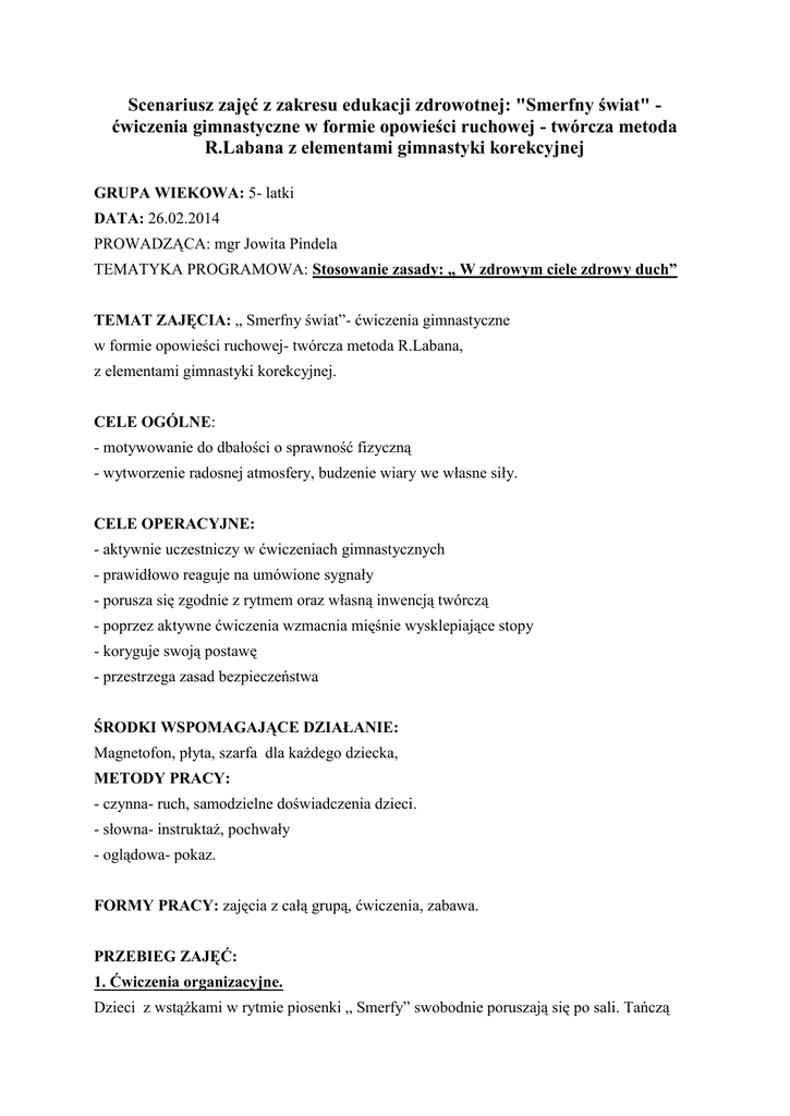 Scenariusz zajęć z zakresu edukacji zdrowotnej: "Smerfny świat" ćwiczenia gimnastyczne w formie opowieści ruchowej - twórcza metoda R.Labana z elementami gimnastyki korekcyjnej GRUPA WIEKOWA: 5- latki DATA: 26.02.2014 PROWADZĄCA: mgr Jowita Pindela TEMATYKA PROGRAMOWA: Stosowanie zasady: „ W zdrowym ciele zdrowy duch” TEMAT ZAJĘCIA: „ Smerfny świat”- ćwiczenia gimnastyczne w formie opowieści ruchowej- twórcza metoda R.Labana, z elementami gimnastyki korekcyjnej. CELE OGÓLNE: - motywowanie do dbałości o sprawność fizyczną - wytworzenie radosnej atmosfery, budzenie wiary we własne siły. CELE OPERACYJNE: - aktywnie uczestniczy w ćwiczeniach gimnastycznych - prawidłowo reaguje na umówione sygnały - porusza się zgodnie z rytmem oraz własną inwencją twórczą - poprzez aktywne ćwiczenia wzmacnia mięśnie wysklepiające stopy - koryguje swoją postawę - przestrzega zasad bezpieczeństwa ŚRODKI WSPOMAGAJĄCE DZIAŁANIE: Magnetofon, płyta, szarfa dla każdego dziecka, METODY PRACY: - czynna- ruch, samodzielne doświadczenia dzieci. - słowna- instruktaż, pochwały - oglądowa- pokaz. FORMY PRACY: zajęcia z całą grupą, ćwiczenia, zabawa. PRZEBIEG ZAJĘĆ: 1. Ćwiczenia organizacyjne. Dzieci z wstążkami w rytmie piosenki „ Smerfy” swobodnie poruszają się po sali. Tańczą wykonując dowolne obroty, podskoki, ruchy wspomagające akcję całego ciała. W przerwie muzyki podchodzą na palcach do środka koła i zabierają swoją wstążkę. 2. Ćwiczenia orientacyjno - porządkowe. Przyjmowanie postawy skorygowanej. Dowolny taniec w rytmie muzyki : „ Nie bój się Gargamela”. Gdy muzyka milknie dzieci wykonują siad skrzyżny w pozycji skorygowanej i nakrywają głowę, 3. Ćwiczenia obszerności ruchów Smerfy idą nad rzekę, aby się umyć. Zabierają ręczniki, ( szarfy) i rysują nimi na podłodze kółko. W rytm piosenek: „Mydło wszystko umyje”, „ Szczotko, szczotko..” naśladują mycie poszczególnych części ciała. 4. Ćwiczenia mięśni wysklepiających stopy. Chwyt ręcznika, ( chustki), palcami, raz prawej, raz lewej stopy. 5.Ćwiczenia wyczucia własnego ciała. Zabawa „ Powitanie”. Dotykanie jedną częścią ciała do drugiej części ciała, na przykład : czoło wita się z kolanem .Wesoła muzyka instrumentalna. 6. Ćwiczenie wyczucia przestrzeni. Zabawa: „ Kałuże”. Smerfy przeskakują przez kałuże utworzone z szarf. Zabawa : „ Jesienne liście”. Smerfy biegają po lesie zbierając liście. Gdy usłyszą melodię: „ Taniec czarownic”- uciekają do swoich domków, bo zbliża się czarownica. Zabawa: „ Skoki” .Smerfy nazbierały dużo liści, cieszą się i podskakują: „ Ram, pam, pam dużo liści mam”. 7. Ćwiczenia kręgosłupa. Zabawa: „ Zrywamy liście”. 8.Ćwiczenia wyczucia czasu. Wzmocnienie mięśni ściągających łopatki.. Zabawa: „ Smerfy i czarownica”. Smerfy skradają się do domku czarownicy, ale ta je zauważyła i goni je. Smerfy uciekają wykonując odrzuty ramion w tył. 9. Ćwiczenia uspokajające i oddechowe. Zabawa: „ Wiaterek i wichura”- dmuchanie na chustkę lekko i mocno. 10. Zakończenie. Wyrobienie odruchu prawidłowego stawiania stóp. Smerfy wracają do domów.- rytmiczny marsz dookoła sali, ( przenoszenie ciężaru z pięty na palce), w rytm piosenki „ Smerfy”. Nauczycielka dziękuje dzieciom za staranne wykonywanie ćwiczeń.