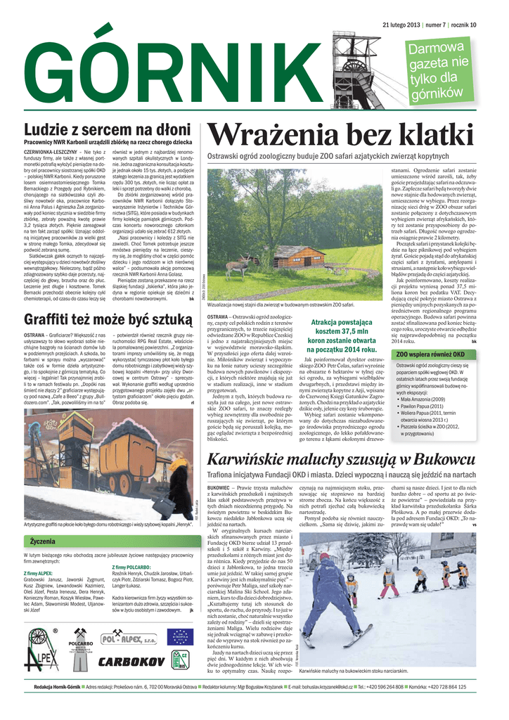 21 lutego 2013 | numer 7 | rocznik 10 Darmowa gazeta nie tylko dla górników Wrażenia bez klatki Ludzie z sercem na dłoni Pracownicy NWR Karbonii urządzili zbiórkę na rzecz chorego dziecka również w jednym z najbardziej renomowanych szpitali okulistycznych w Londynie. Jedna zagraniczna konsultacja kosztuje jednak około 15 tys. złotych, a podjęcie stałego leczenia za granicą jest wydatkiem rzędu 300 tys. złotych, nie licząc opłat za leki i sprzęt potrzebny do walki z chorobą. Do zbiórki zorganizowanej wśród pracowników NWR Karbonii dołączyło Stowarzyszenie Inżynierów i Techników Górnictwa (SITG), które posiada w budynkach firmy kolekcję pamiątek górniczych. Podczas koncertu noworocznego członkom organizacji udało się zebrać 612 złotych. „Nasi pracownicy i koledzy z SITG nie zawiedli. Choć Tomek potrzebuje jeszcze mnóstwa pieniędzy na leczenie, cieszymy się, że mogliśmy choć w części pomóc dziecku i jego rodzicom w ich nierównej walce” – podsumowała akcję pomocową rzecznik NWR Karbonii Anna Golasz. Pieniądze zostaną przekazane na rzecz śląskiej fundacji „Iskierka”, która jako jedyna w regionie opiekuje się dziećmi z chorobami nowotworowymi. bk Ostrawski ogród zoologiczny buduje ZOO safari azjatyckich zwierząt kopytnych ŹRÓDŁO: ZOO Ostrawa CZERWIONKA-LESZCZYNY – Nie tyko z funduszy firmy, ale także z własnej portmonetki potrafią wyłożyć pieniądze na dobry cel pracownicy siostrzanej spółki OKD – polskiej NWR Karbonii. Kiedy poruszone losem osiemnastomiesięcznego Tomka Bernackiego z Przegędy pod Rybnikiem, chorującego na siatkówczaka czyli złośliwy nowotwór oka, pracownice Karbonii Anna Palus i Agnieszka Żak zorganizowały pod koniec stycznia w siedzibie firmy zbiórkę, zebrały poważną kwotę prawie 3,2 tysiąca złotych. Pięknie zareagował na ten fakt zarząd spółki: Uznając oddolną inicjatywę pracowników za wielki gest w stronę małego Tomka, zdecydował się podwoić zebraną sumę. Siatkówczak gałek ocznych to najczęściej występujący u dzieci nowotwór złośliwy wewnątrzgałkowy. Nieleczony, bądź późno zdiagnozowany szybko daje przerzuty, najczęściej do głowy, brzucha oraz do płuc. Leczenie jest długie i kosztowne. Tomek Bernacki przechodzi obecnie kolejny cykl chemioterapii, od czasu do czasu leczy się Wizualizacja nowej stajni dla zwierząt w budowanym ostrawskim ZOO safari. Graffiti też może być sztuką OSTRAWA – Graficiarze? Większość z nas usłyszawszy to słowo wyobrazi sobie niechlujne bazgroły na ścianach domów lub w podziemnych przejściach. A szkoda, bo farbami w sprayu można „wyczarować” także coś w formie dzieła artystycznego, i to spokojnie z górniczą tematyką. Co więcej – legalnie! Tak przynajmniej zrobili to w ramach festiwalu pn. „Dopóki nas śmierć nie złączy 2” graficiarze występujący pod nazwą „Cafe a Beeo” z grupy „Bulldozero.com”. „Tak, pozwoliliśmy im na to” OSTRAWA – Ostrawski ogród zoologiczny, częsty cel polskich rodzin z terenów przygranicznych, to trzecie najczęściej odwiedzane ZOO w Republice Czeskiej i jedno z najatrakcyjniejszych miejsc w województwie morawsko-śląskim. W przyszłości jego oferta dalej wzrośnie. Miłośników zwierząt i wypoczynku na łonie natury ucieszy szczególnie budowa nowych pawilonów i ekspozycji, z których niektóre znajdują się już w stadium realizacji, inne w stadium przygotowań. Jednym z tych, których budowa ruszyła już na całego, jest nowe ostrawskie ZOO safari, to znaczy rozległy wybieg zewnętrzny dla swobodnie poruszających się zwierząt, po którym goście będą się poruszali kolejką, mogąc oglądać zwierzęta z bezpośredniej bliskości. – potwierdził również rzecznik grupy nieruchomości RPG Real Estate, właściciela pomalowanej powierzchni. „Z organizatorami imprezy umówiliśmy się, że mogą wykorzystać tymczasowy płot koło byłego domu robotniczego i zabytkowej wieży szybowej kopalni »Henryk« przy ulicy Dworcowej w centrum Ostrawy” - sprecyzował. Wykonanie graffiti według uprzednio przygotowanego projektu zajęło dwu „artystom graficiarzom” około pięciu godzin. Obraz podoba się. rl Atrakcja powstająca kosztem 37,5 mln koron zostanie otwarta na początku 2014 roku. Jak poinformował dyrektor ostrawskiego ZOO Petr Čolas, safari wyrośnie na obszarze 6 hektarów w tylnej części ogrodu, za wybiegami wielbłądów dwugarbnych, i przedstawi między innymi zwierzęta kopytne z Azji, wpisane do Czerwonej Księgi Gatunków Zagrożonych. Chodzi na przykład o azjatyckie dzikie osły, jelenie czy kozy śruborogie. Wybieg safari zostanie wkomponowany do dotychczas niezabudowanego środowiska przyrodniczego ogrodu zoologicznego, do lekko pofałdowanego terenu z łąkami okolonymi drzewo- stanami. Ogrodzenie safari zostanie umieszczone wśród zarośli, tak, żeby goście przejeżdżając safari na odczuwali go. Zaplecze safari będą tworzyły dwie nowe stajnie dla hodowanych zwierząt, umieszczone w wybiegu. Przez reorganizację sieci dróg w ZOO obszar safari zostanie połączony z dotychczasowym wybiegiem zwierząt afrykańskich, który też zostanie przysposobiony do potrzeb safari. Długość nowego ogrodzenia osiągnie prawie 2 kilometry. Początek safari i przystanek kolejki będzie na łące piknikowej pod wybiegiem żyraf. Goście pojadą stąd do afrykańskiej części safari z żyrafami, antylopami i strusiami, a następnie koło wybiegu wielbłądów przejadą do części azjatyckiej. Jak poinformowano, koszty realizacji projektu wyniosą ponad 37,5 miliona koron bez podatku VAT. Decydującą część pokryje miasto Ostrawa z pieniędzy unijnych pozyskanych za pośrednictwem regionalnego programu operacyjnego. Budowa safari powinna zostać sfinalizowana pod koniec bieżącego roku, uroczyste otwarcie odbędzie się najprawdopodobniej na początku 2014 roku. bk ZOO wspiera również OKD O