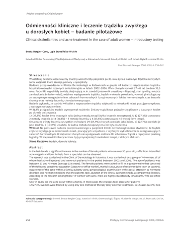 Artykuł oryginalny/Original paper Odmienności kliniczne i leczenie trądziku zwykłego u dorosłych kobiet – badanie pilotażowe Clinical dissimilarities and acne treatment in the case of adult women – introductory testing Beata Bergler-Czop, Ligia Brzezińska-Wcisło Katedra i Klinika Dermatologii Śląskiej Akademii Medycznej w Katowicach, kierownik Katedry i Kliniki: prof. dr hab. Ligia Brzezińska-Wcisło Post Dermatol Alergol 2006; XXIII, 6: 258–262 Streszczenie W ostatniej dekadzie obserwujemy znaczny wzrost liczby pacjentek po 30. roku życia z nasilonym trądzikiem zwykłym (acne vulgaris), które szukają pomocy u specjalisty. Badanie przeprowadzono w Klinice Dermatologii w Katowicach w grupie 44 kobiet z rozpoznaniem trądziku hospitalizowanych i leczonych ambulatoryjnie w latach 2002–2006. Wiek chorych wynosił 27–45 lat, średnio 33,6 roku. Pacjentki wypełniały ankietę obejmującą m.in. zawód (pracownik umysłowy – fizyczny), stan cywilny, miejsce zamieszkania (miasto – wieś), rodzinne występowanie trądziku, trądzik w okresie pokwitania, wywiad ginekologiczny ze szczególnym uwzględnieniem zaburzeń hormonalnych i przyjmowanych leków hormonalnych, czas trwania choroby oraz metody leczenia, choroby towarzyszące. Badanie wykazało, że spośród 44 kobiet z rozpoznaniem trądziku większość to mieszkanki miast, pracujące umysłowo, z wyższym wykształceniem. W 31,8% przypadków trądzik występował rodzinnie. Zmiany trądzikowe pojawiły się głównie u badanych kobiet po okresie dojrzewania. 12 (27,3%) kobiet było leczonych tylko jedną metodą terapii (tylko leczenie zewnętrzne). U 12 (27,3%) stosowano 2 metody leczenia, u 14 (31,8%) – 3 metody leczenia, u 6 (13,6%) zastosowano 4 i więcej form terapii. Ostateczne efekty leczenia wszystkim metodami 29 (65,9%) chorych oceniało jako dobre, 10 (22,7%) oceniało je jako średnie, 5 (11,36%) uważało, że żadna metoda terapeutyczna nie była skuteczna. Wnioski: Na podstawie badania przeprowadzonego u pacjentek kliniki dermatologii można stwierdzić, że trądzik częściej występuje u mieszkanek miast, pracujących umysłowo, z wyższym wykształceniem, niezgłaszających zaburzeń hormonalnych. U większości chorych nie występowało rodzinne tło schorzenia. Trądzik z reguły miał przebieg łagodny. W większości kobiety leczone były przynajmniej 3 metodami terapii, z dobrym efektem. Słowa kluczowe: trądzik, dorosłe kobiety. Abstract In the last decade a significant increase in the number of female patients who are over 30 years old, suffer from intensified acne vulgaris and look for help from a specialist can be observed. The research was carried out in the Clinic of Dermatology in Katowice. It was carried out on a group of 44 women, all of whom had acne diagnosed and were out-patients in the period between 2002 and 2006. The age of patients was between 27 and 45 years (average 33.6 years). The female patients were asked to fill in a questionnaire that consisted of the following questions: occupation (labourer or office worker), marital status, place of residence (city, town or country), occurrence of the acne within a family, puberty acne, gynaecological examination with special attention to hormone disorders and hormone medicine that the patients took, duration of the illness, curing methods, accompanying illnesses. According to the research among those 44 women with acne, most are highly educated city inhabitants, who are office workers. Only in 31.8% did the acne occur within a family. In most cases the changes took place after puberty. 12 (27.3%) women were treated by using only one method of therapy (only external treatment). In 12 cases (27.3%) two Adres do korespondencji: dr med. Beata Bergler-Czop, Katedra i Klinika Dermatologii, Śląska Akademia Medyczna, ul. Francuska 20/24, 40-027 Katowice 258 Postępy Dermatologii i Alergologii XXIII; 2006/6 Odmienności kliniczne i leczenie trądziku zwykłego u dorosłych kobiet – badanie pilotażowe methods of therapy were used, in 14 cases (31.8%) three methods of therapy were used, in 6 cases (13.6%) four and more forms of therapy were used. 29 women (65.9%) estimated the treatment effects by all methods as good/satisfactory, 10 (22.7%) as average, while 5 (11.36%) said that none of those methods had been efficient. Conclusions: On the basis of the research carried out on the group of patients of the Clinic of Dermatology it can be said that acne occurs in women who are highly educated city inhabitants, office workers and who do not suffer from any hormone disorders. In most cases the acne did not occur within the family. Generally the acne was benign. In most cases the women were treated by using at least three therapy methods and the results were good/satisfactory. Key words: acne, adult women. Wprowadzenie Trądzik zwykły (acne vulgaris) jest najczęściej występującą dermatozą. Schorzenie dość często jest kojarzone z okresem dojrzewania. Uważa się, że dotyczy w różnym nasileniu 100% ludzi pomiędzy 10. i 30. rokiem życia. Jednak w ostatniej dekadzie obserwujemy znaczny wzrost liczby pacjentek po 30. roku życia z nasilonym trądzikiem zwykłym, które szukają pomocy u specjalisty. Etiopatogeneza trądziku jest problemem złożonym. Istotne znaczenie pod tym względem mają takie czynniki, jak wzmożona produkcja łoju, nadmierne rogowacenie przewodów wyprowadzających i ujść gruczołów łojowych, rozwój flory bakteryjnej (głównie Propionibacterium acnes, Staphylococcus epidermidis, Pityrosporum ovale), zaburzenia gospodarki hormonalnej, odczyn zapalny, uwarunkowania genetyczne oraz mniej dotychczas poznane inne czynniki: zaburzenia immunologiczne, nadmierna reaktywność mieszków włosowych, czynniki psychologiczne oraz czynniki środowiskowe. U dorosłych kobiet podejrzewa się zwiększoną rolę czynników środowiskowych, np. zanieczyszczenie środowiska, stresujący tryb życia, rosnąca oporn