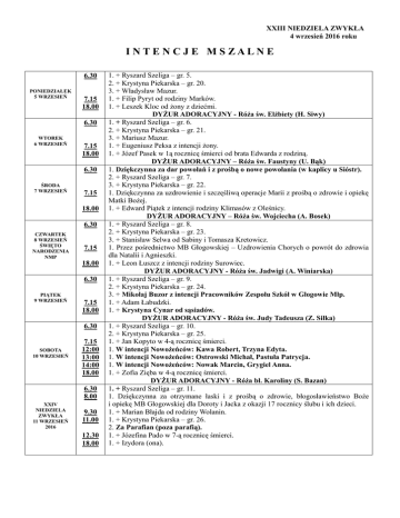 XXIII NIEDZIELA ZWYKŁA 4 wrzesień 2016 roku I NTE N C J E M S ZALNE 6.30 PONIEDZIAŁEK 5 WRZESIEŃ 7.15 18.00 6.30 WTOREK 6 WRZESIEŃ 7.15 18.00 6.30 ŚRODA 7 WRZESIEŃ 7.15 18.00 6.30 CZWARTEK 8 WRZESIEŃ ŚWIĘTO NARODZENIA NMP 7.15 18.00 6.30 PIĄTEK 9 WRZESIEŃ 7.15 18.00 6.30 SOBOTA 10 WRZESIEŃ 7.15 12:00 13:00 14:00 18.00 6.30 8.00 XXIV NIEDZIELA ZWYKŁA 11 WRZESIEŃ 2016 9.30 11.00 12.30 18.00 1. + Ryszard Szeliga – gr. 5. 2. + Krystyna Piekarska – gr. 20. 3. + Władysław Mazur. 1. + Filip Pyryt od rodziny Marków. 1. + Leszek Kloc od żony z dziećmi. DYŻUR ADORACYJNY - Róża św. Elżbiety (H. Siwy) 1. + Ryszard Szeliga – gr. 6. 2. + Krystyna Piekarska – gr. 21. 3. + Mariusz Mazur. 1. + Eugeniusz Peksa z intencji żony. 1. + Józef Pasek w 1ą rocznicę śmierci od brata Edwarda z rodziną. DYŻUR ADORACYJNY – Róża św. Faustyny (U. Bąk) 1. Dziękczynna za dar powołań i z prośbą o nowe powołania (w kaplicy u Sióstr). 2. + Ryszard Szeliga – gr. 7. 3. + Krystyna Piekarska – gr. 22. 1. Dziękczynna za uzdrowienie i szczęśliwą operacje Marii z prośbą o zdrowie i opiekę Matki Bożej. 1. + Edward Piątek z intencji rodziny Klimasów z Oleśnicy. DYŻUR ADORACYJNY – Róża św. Wojciecha (A. Bosek) 1. + Ryszard Szeliga – gr. 8. 2. + Krystyna Piekarska – gr. 23. 3. + Stanisław Selwa od Sabiny i Tomasza Kretowicz. 1. Przez pośrednictwo MB Głogowskiej – Uzdrowienia Chorych o powrót do zdrowia dla Natalii i Agnieszki. 1. + Leon Łuszcz z intencji rodziny Surowiec. DYŻUR ADORACYJNY - Róża św. Jadwigi (A. Winiarska) 1. + Ryszard Szeliga – gr. 9. 2. + Krystyna Piekarska – gr. 24. 3. + Mikołaj Buzor z intencji Pracowników Zespołu Szkół w Głogowie Młp. 1. + Adam Łabudzki. 1. + Krystyna Cynar od sąsiadów. DYŻUR ADORACYJNY - Róża św. Judy Tadeusza (Z. Siłka) 1. + Ryszard Szeliga – gr. 10. 2. + Krystyna Piekarska – gr. 25. 1. + Jan Kopyto w 4-ą rocznicę śmierci. 1. W intencji Nowożeńców: Kawa Robert, Trzyna Edyta. 1. W intencji Nowożeńców: Ostrowski Michał, Pastuła Patrycja. 1. W intencji Nowożeńców: Nowak Marcin, Grygiel Anna. 1. + Zofia Zięba w 4-ą rocznicę śmierci. DYŻUR ADORACYJNY - Róża bł. Karoliny (S. Bazan) 1. + Ryszard Szeliga – gr. 11. 1. Dziękczynna za otrzymane łaski i z prośbą o zdrowie, błogosławieństwo Boże i opiekę MB Głogowskiej dla Doroty i Jacka z okazji 17 rocznicy ślubu i ich dzieci. 1. + Marian Błajda od rodziny Wolanin. 1. + Krystyna Piekarska – gr. 26. 2. Za Parafian (poza parafią). 1. + Józefina Pado w 7-ą rocznicę śmierci. 1. + Izydora (ona).