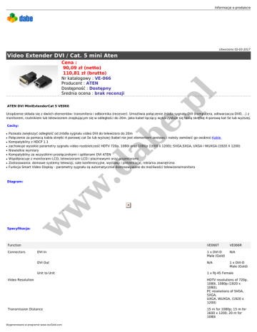 Informacje o produkcie Utworzono 02-03-2017 Video Extender DVI / Cat. 5 mini Aten Nr katalogowy : VE-066 Producent : ATEN Dostępność : Dostępny Średnia ocena : brak recenzji ATEN DVI MiniExtenderCat 5 VE066 pl Cena : 90,09 zł (netto) 110,81 zł (brutto) e. Urządzenie składa się z dwóch elementów: transmitera i odbiornika (receiver). Umożliwia połączenie źródła sygnału DVI (komputera, odtwarzacza DVD, ..) z monitorem, rzutnikiem lub telewizorem znajdującym się w odległości do 20m. Jako kabel łączący wykorzystuje się tanią skrętkę 4-parową kat 5e lub wyższej. Cechy: ● ● ● ● ● ● ● Pozwala zwiększyć odległość od żródła sygnału video DVI do telewizora do 20m Połączenie za pomocą kabla skrętki 4 parowej cat 5e lub wyższej (kabel nie jest elementem zestawu i należy zamówić go osobno) Kable Kompatybilny z HDCP 1.1 zachowuje wysokie parametry sygnału video rozdzielczość HDTV 720p, 1080i oraz 1080p (1600 x 1200); SVGA,SXGA, UXGA i WUXGA (1920 X 1200) Niewielkie wymiary Kompatybilny ze wszystkimi przełącznikami i spliterami DVI ATEN Współpracuje z monitorami LCD, telewizorami LCD i plazmowymi oraz projektorami Zastosowania: domowe systemy telewizji, sale konferencyjne, wystawy i prezentacje, reklama zewnętrzna Funkcja Smart Video Display - parametry sygnału są automatycznie dostosowywane do możliwości telewizora/monitora ab ● .d ● w w w Diagram: Specyfikacja: Function Connectors VE066T VE066R DVI In 1 x DVI-D Male (Gold) N/A DVI Out N/A 1 x DVI-D Male (Gold) Unit to Unit 1 x RJ-45 Female Video Resolution HDTV resolutions of 720p, 1080i, 1080p (1920 x 1080); PC resolutions of SVGA, SXGA, UXGA, WUXGA, (1920 x 1200) Transmission Distance 15 m for 1080p; 15 m for 1600 x 1200; 20 m for 1080i Wygenerowano w programie www.oscGold.com Environment 0 -50°C Storage Temp. -20 - 60°C Humidity 0-80% RH, Non-condensing Housing Metal Weight 47 g Dimensions (L x W x H) 5.66 x 4.07 x 2.15 cm w w w .d ab e. pl Physical Properties Operating Temp.