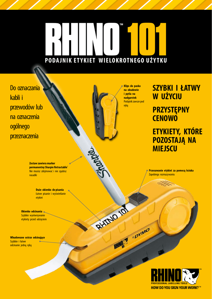 Rhino 101 TM Poda jnik et ykiet wielokrotnego uż y tku Do oznaczania kabli i przewodów lub na oznaczenia ogólnego przeznaczenia Zestaw zawiera marker permanentny Sharpie Retractable® Nie musisz zdejmować i nie zgubisz nasadki Duże okienko do pisania Łatwe pisanie i wyświetlanie etykiet Okienko odcinania Szybkie wyrównywanie etykiety przed odcięciem Wbudowane ostrze odcinające Szybkie i łatwe odcinanie jedną ręką Klips do paska na obudowie i pętla na nadgarstek Podajnik zawsze pod ręką SZYBKI I ŁATWY W UŻYCIU PRZYSTĘPNY CENOWO ETYKIETY, KTÓRE POZOSTAJĄ NA MIEJSCU Przesuwanie etykiet za pomocą kciuka Zapobiega rozmazywaniu ETYKIETY, KTÓRE Wszystkie etykiety RHINO są bardzo wytrzymałe i trwałe. Dzięki silnemu klejowi zapewniają odporność na warunki otoczenia i upływ czasu, jakiej oczekujesz. Zestaw RHINO 101 daje Ci pewność, że korzystasz z niezawodnych etykiet RHINO w dedykowanych, łatwych do ładowania kasetach. POZOSTAJĄ NA MIEJSCU Ciągłe, elastyczne etykiety nylonowe na oznaczenia ogólnego przeznaczenia • Opracowane specjalnie pod kątem skutecznego i trwałego oznaczania różnych powierzchni (gładkich, zakrzywionych, szorstkich i bardzo szorstkich) • Biały, ciągły obszar do pisania markerami permanentnymi • Łatwe do oddzielania etykiety z naciętą przekładką Oznaczenia ogólnego przeznaczenia Łatwe do oddzielania taśmy z naciętą przekładką Oznaczanie przewodów i kabli Łatwe do oddzielania etykiety wycinane Samolaminujące etykiety winylowe do oznaczania kabli i przewodów • Opracowane specjalnie pod kątem skutecznego i trwałego oznaczania kabli i przewodów • Biały obszar do pisania markerami permanentnymi •Przezroczyste końcówki owijają się dookoła kabla lub przewodu, laminując zapisany obszar i dodatkowo go chroniąc • Łatwe do oddzielania etykiety wycinane ETYKIETY RHINO 101 TM Ciągłe, elastyczne etykiety nylonowe S-Code Rozmiar etykiet (SxW) Obszar do pisania (SxW) S0810090 19 mm x 3,5 m - Zalecane rozmiary przewodów Średnica przewodu Samolaminujące winylowe S RHINO 101 RHINO 101 W Obszar do pisania Od Do Etykiet w rolce Ilość w opak. S0810330 19 mm x 25 mm 19 mm x 8 mm 2 mm 5 mm 200 1 S0810130 19 mm x 38 mm 19 mm x 12 mm 4 mm 8 mm 140 1 S0810170 19 mm x 50 mm 19 mm x 16 mm 6 mm 11 mm 100 1 S0810210 19 mm x 76 mm 19 mm x 19 mm 8 mm 18 mm 75 1 Dostępne PRODUKTY Podajnik etykiet wielokrotnego użytku RHINO 101 Na oznaczenia ogólnego przeznaczenia S-Code: S0810250 Obejmuje: Podajnik etykiet wielokrotnego użytku RHINO 101 19 mm x 3,5 m Ciągłe, elastyczne etykiety nylonowe Marker permanentny Sharpie Retractable, czarny DO OZNACZANIA KABLI I PRZEWODÓW Waga: 249,5 g Wymiary: 267mm x 190mm x 101,6mm (WxSxG) Opakowanie zbiorcze: 3 sztuki Waga: 907,1 g Wymiary: 203mm x 254mm x 279mm (WxSxG) W celu uzyskania dalszych informacji potrzebnych do odnalezienia najbliższego dystrybutora produktów Rhino należy odwiedzić witrynę www.dymo.com lub skontaktować się z nami telefonicznie pod numerem 022 349 15 02 Podajnik etykiet wielokrotnego użytku RHINO 101 Do oznaczania kabli i przewodów S-Code: S0810290 Obejmuje: Podajnik etykiet wielokrotnego użytku RHINO 101 19 mm x 38 mm Samolaminujące etykiety winylowe (140 sztuk) Marker permanentny Sharpie Retractable, czarny Waga: 249,5 g Wymiary: 267mm x 190mm x 101,6mm (WxSxG) Opakowanie zbiorcze: 3 sztuki Waga: 907,1 g Wymiary: 203mm x 254mm x 279mm (WxSxG) S0820820 NA OZNACZENIA OGÓLNEGO